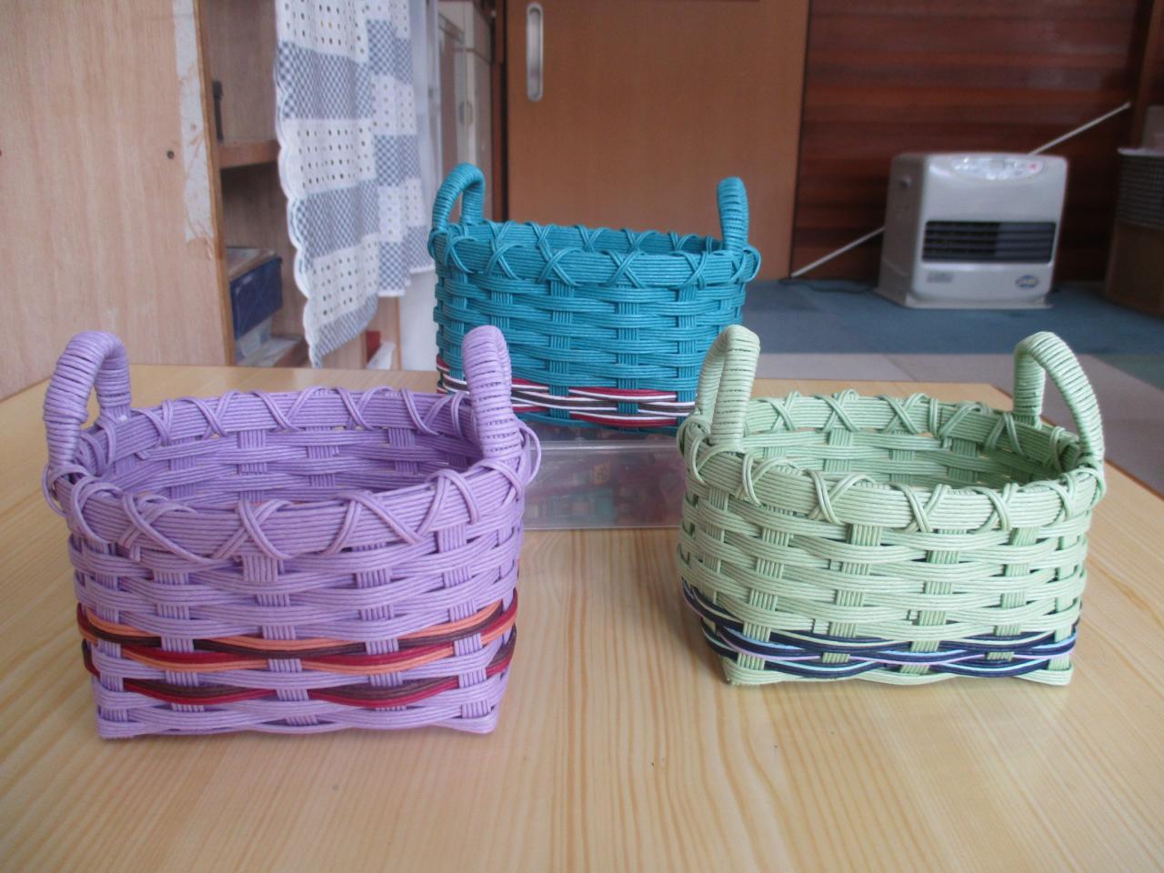 ステキなかごのできあがり! 色によって雰囲気が違いますね
