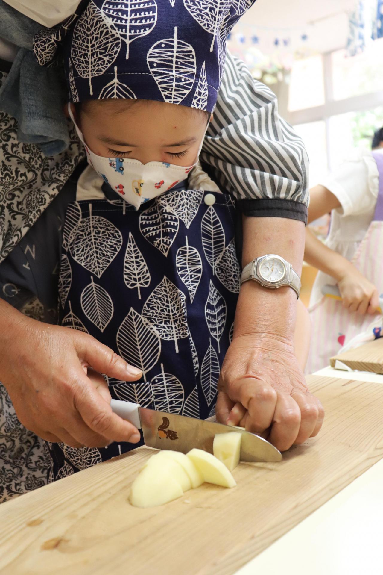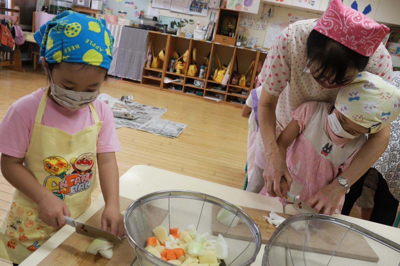 たくさんの野菜をおじいちゃん、おばあちゃんと一緒に頑張って切ってくれました!カレーが出来上がるのが楽しみだね❤