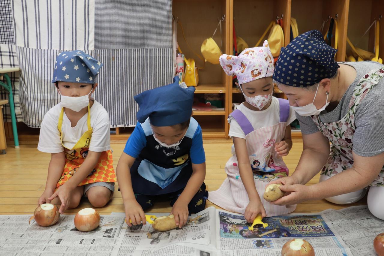 まずは、まつ組さんがおじいちゃん、おばあちゃんと一緒にカレーに使う野菜を切ったり、ピザのトッピングをしました!