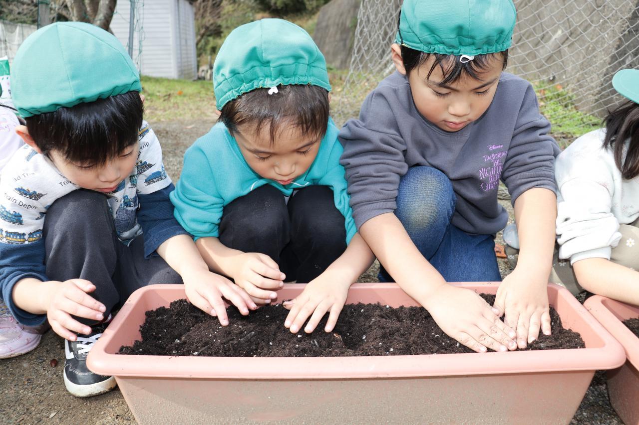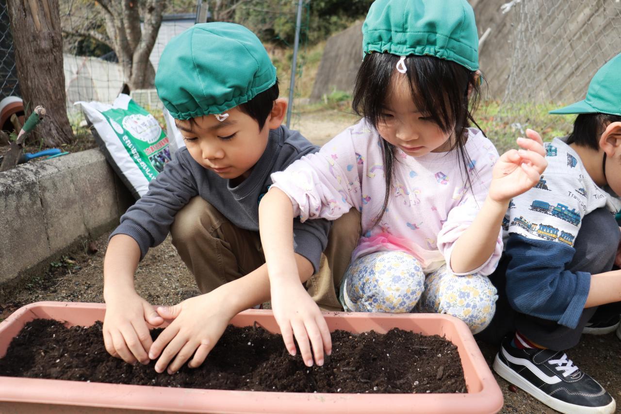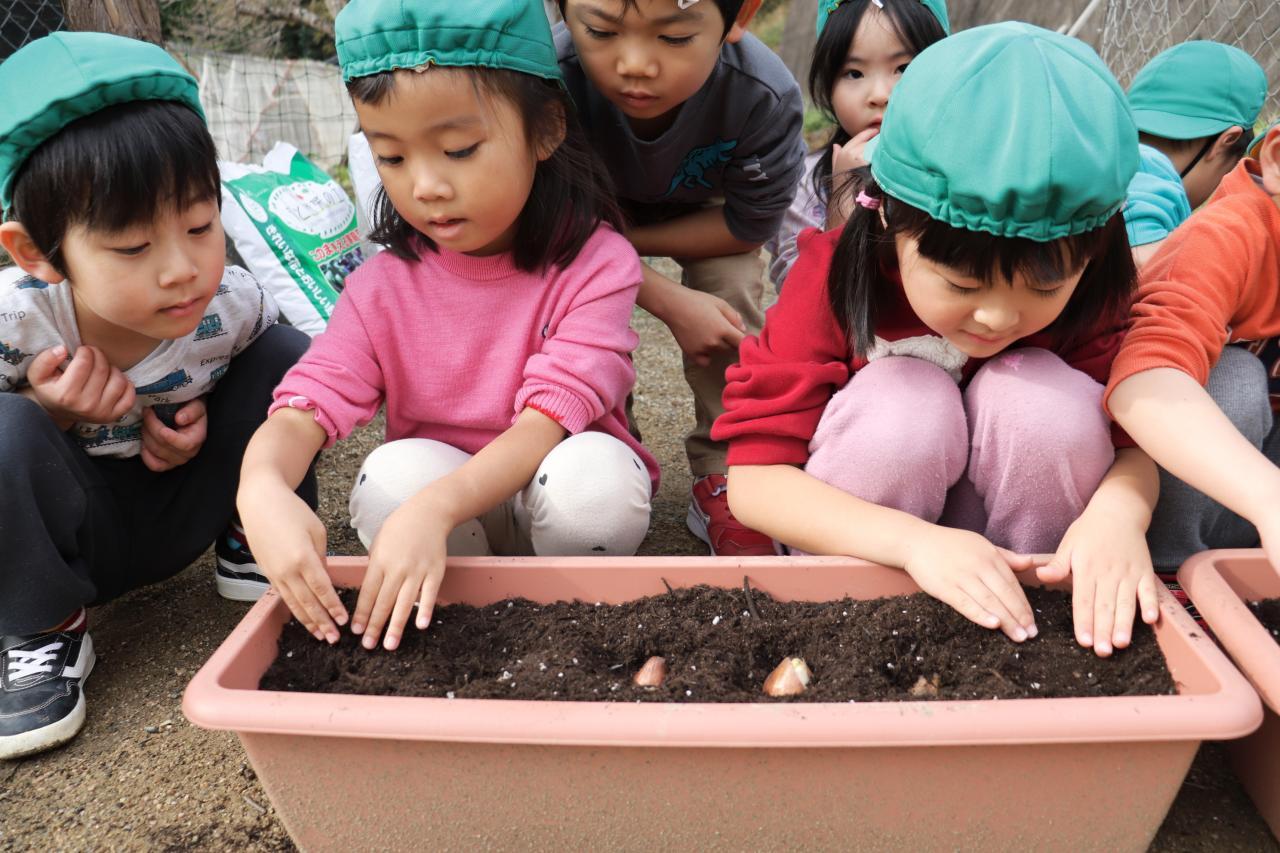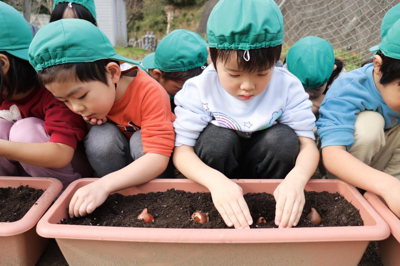 お手本を見た後は、いざ実践!優しく土をかけてあげていました☺️ 皆が幼稚園になる頃には元気なチューリップが咲いてくれるといいね!