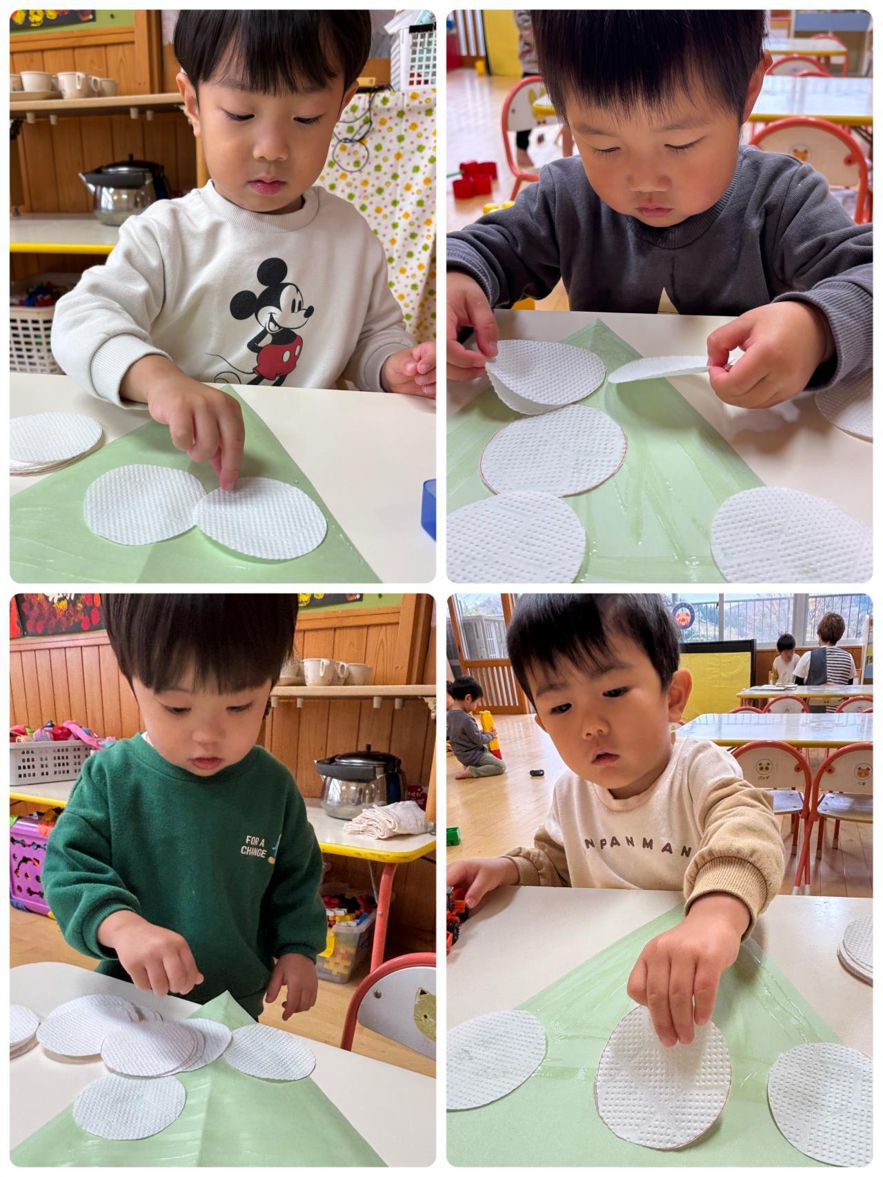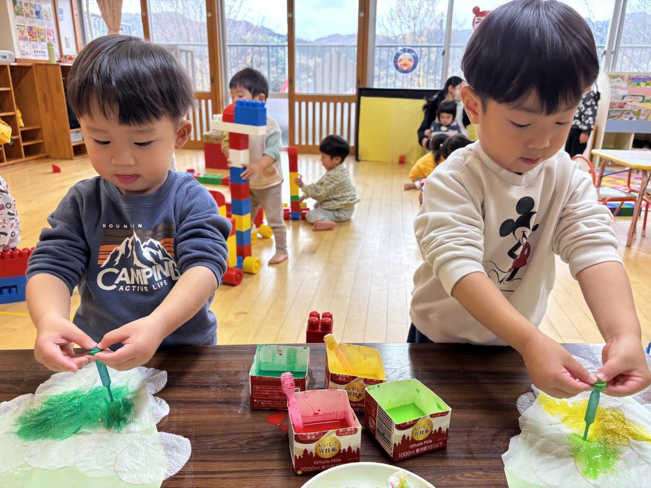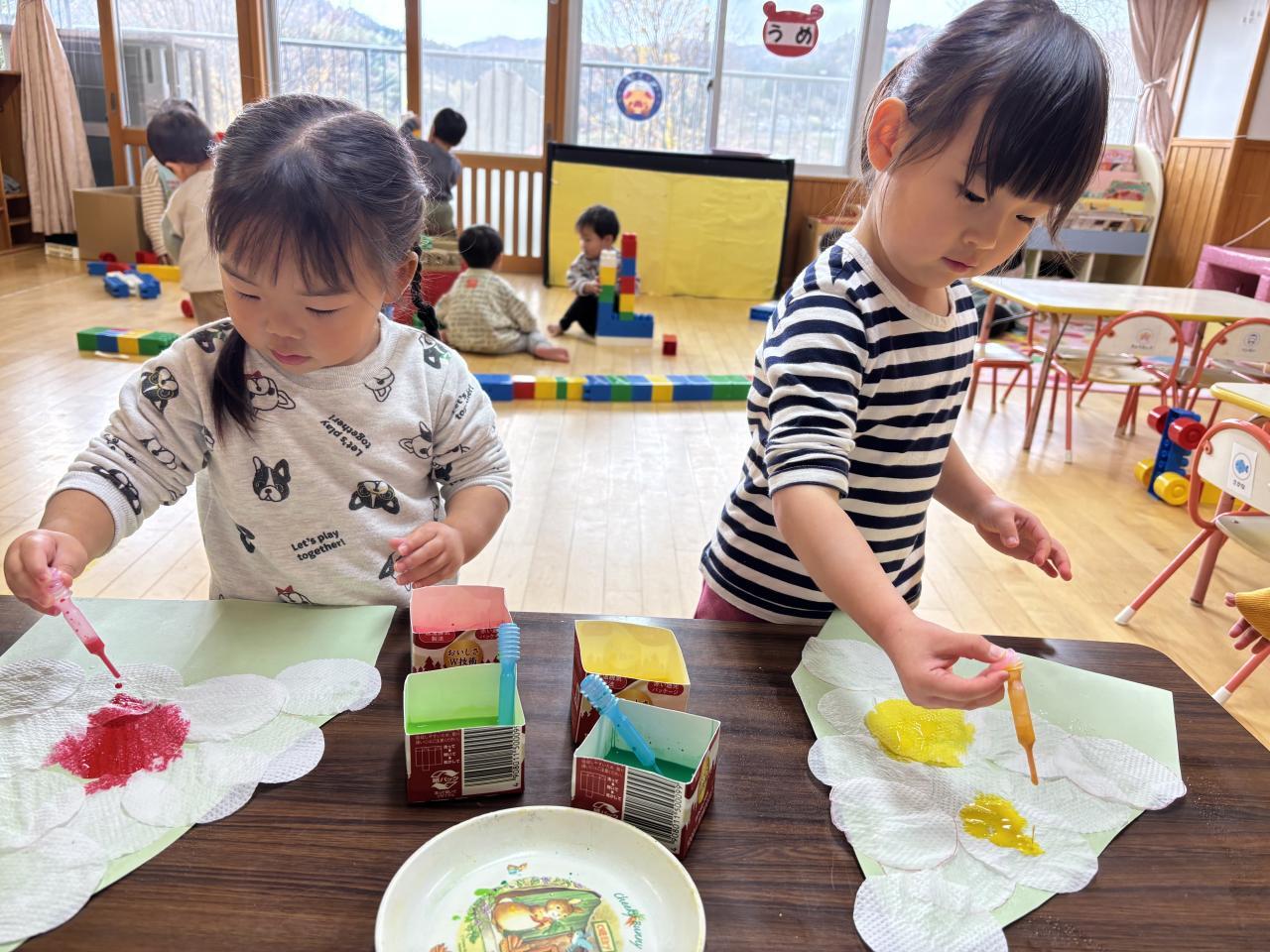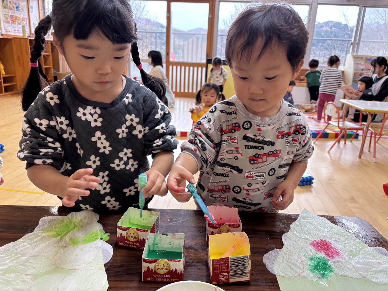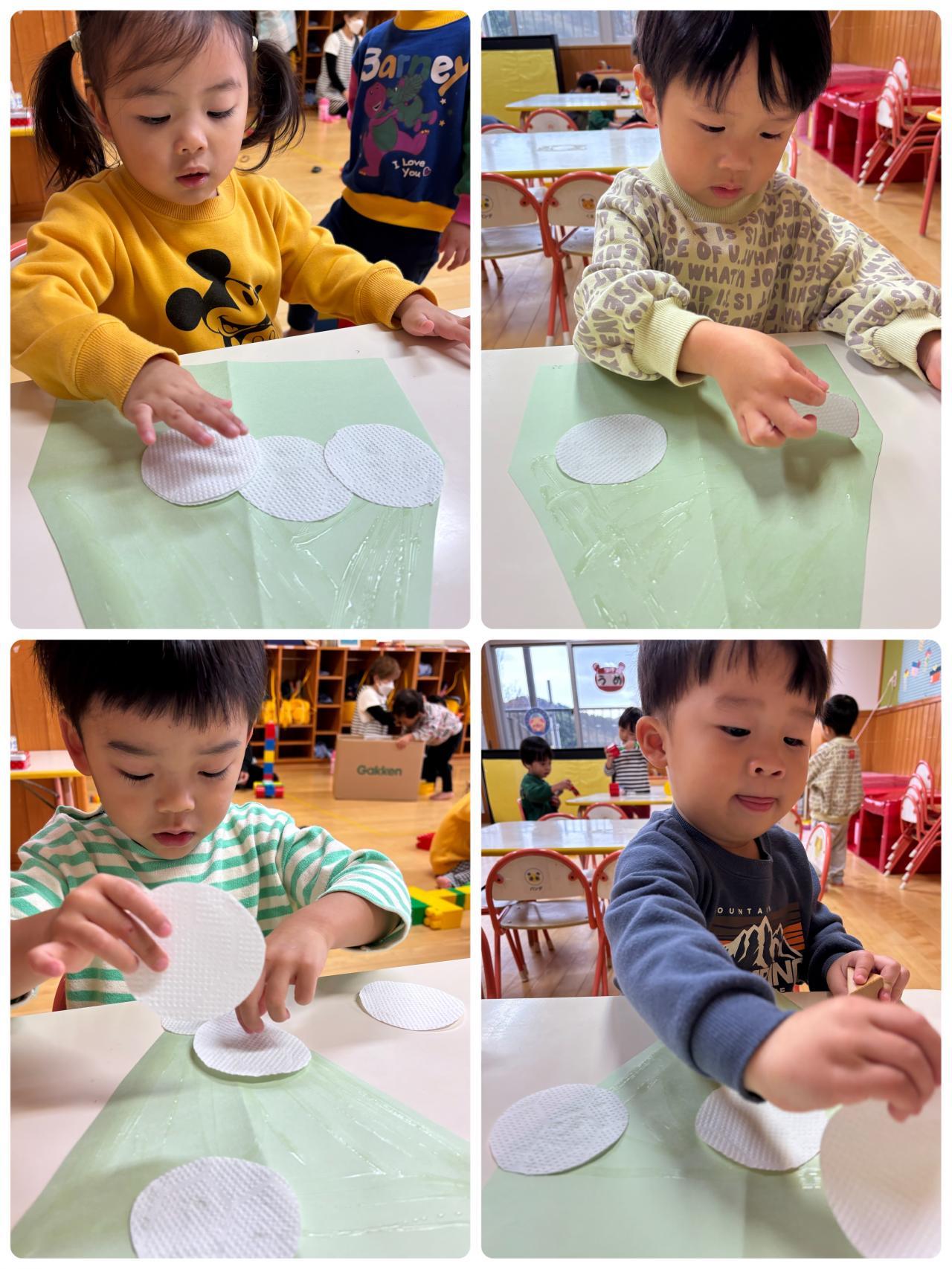 初めてスポイトを使ってみましたが、みんなコツを掴むと楽しかったようで、「まだする〜」「つぎはあか!」「おれんじになった!」など、いろんな発見をしながら楽しむ姿がみられました💡