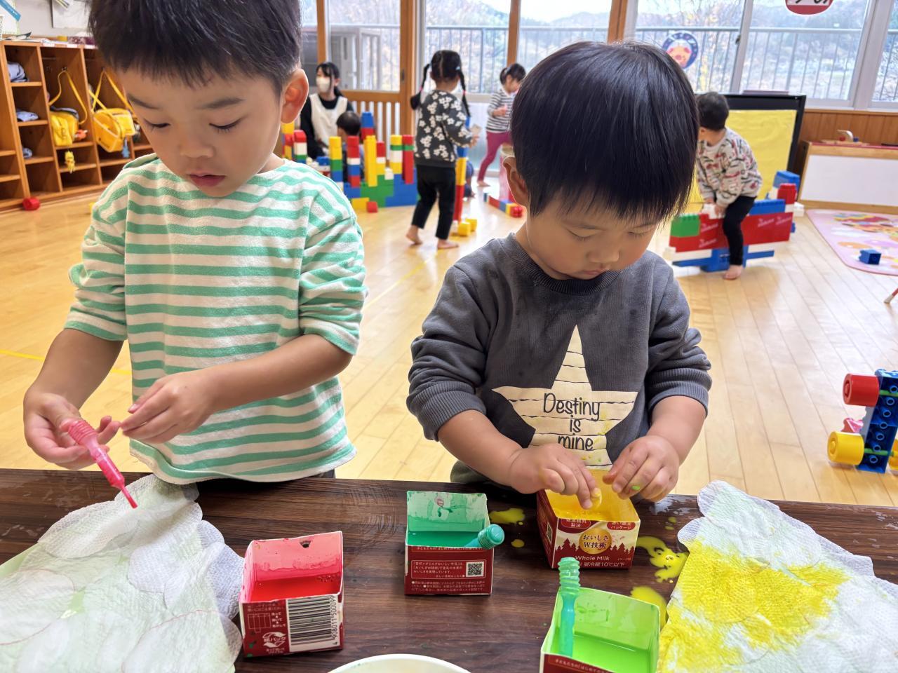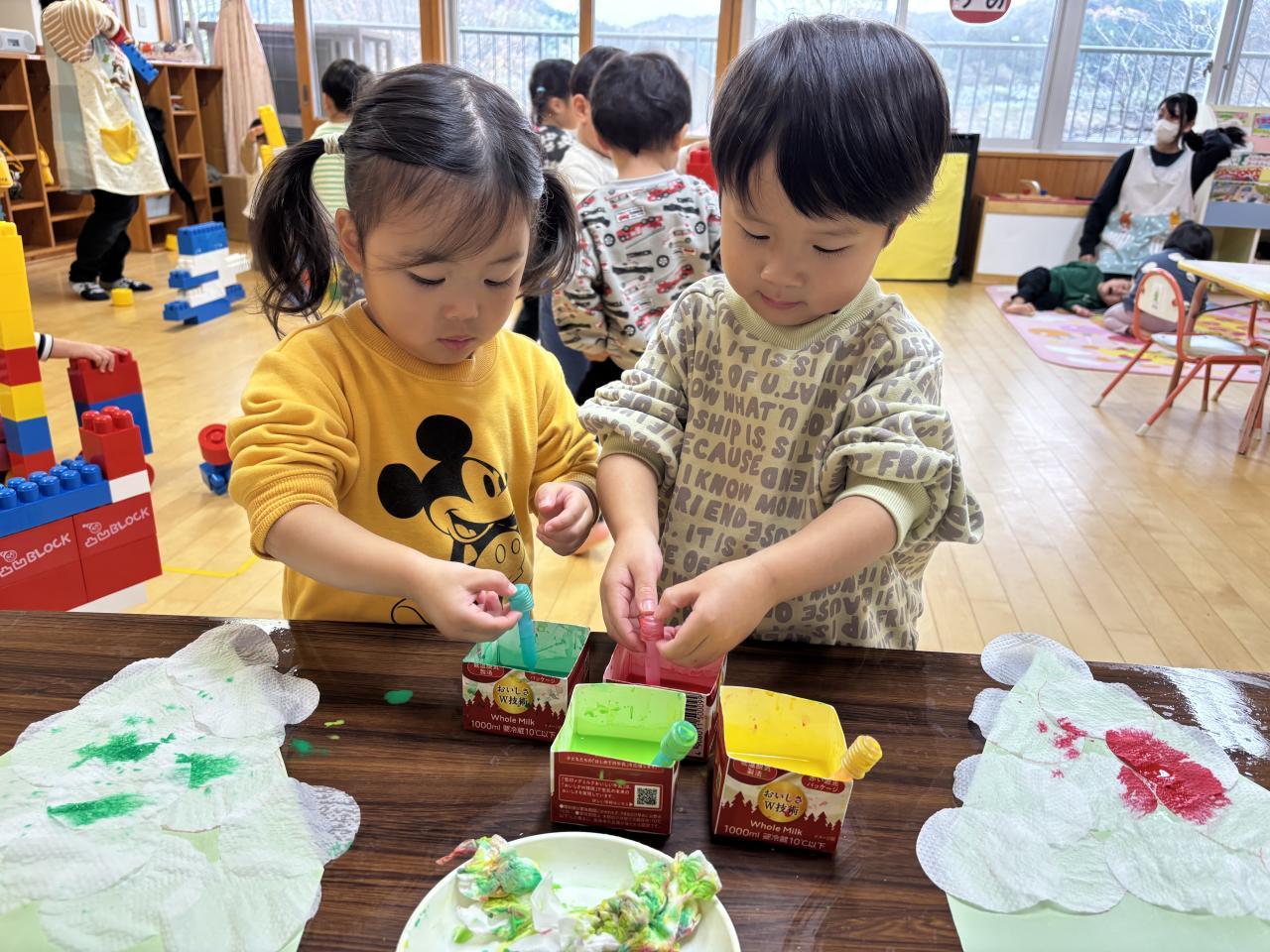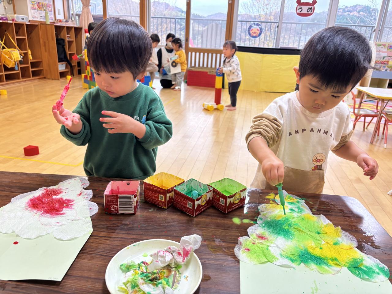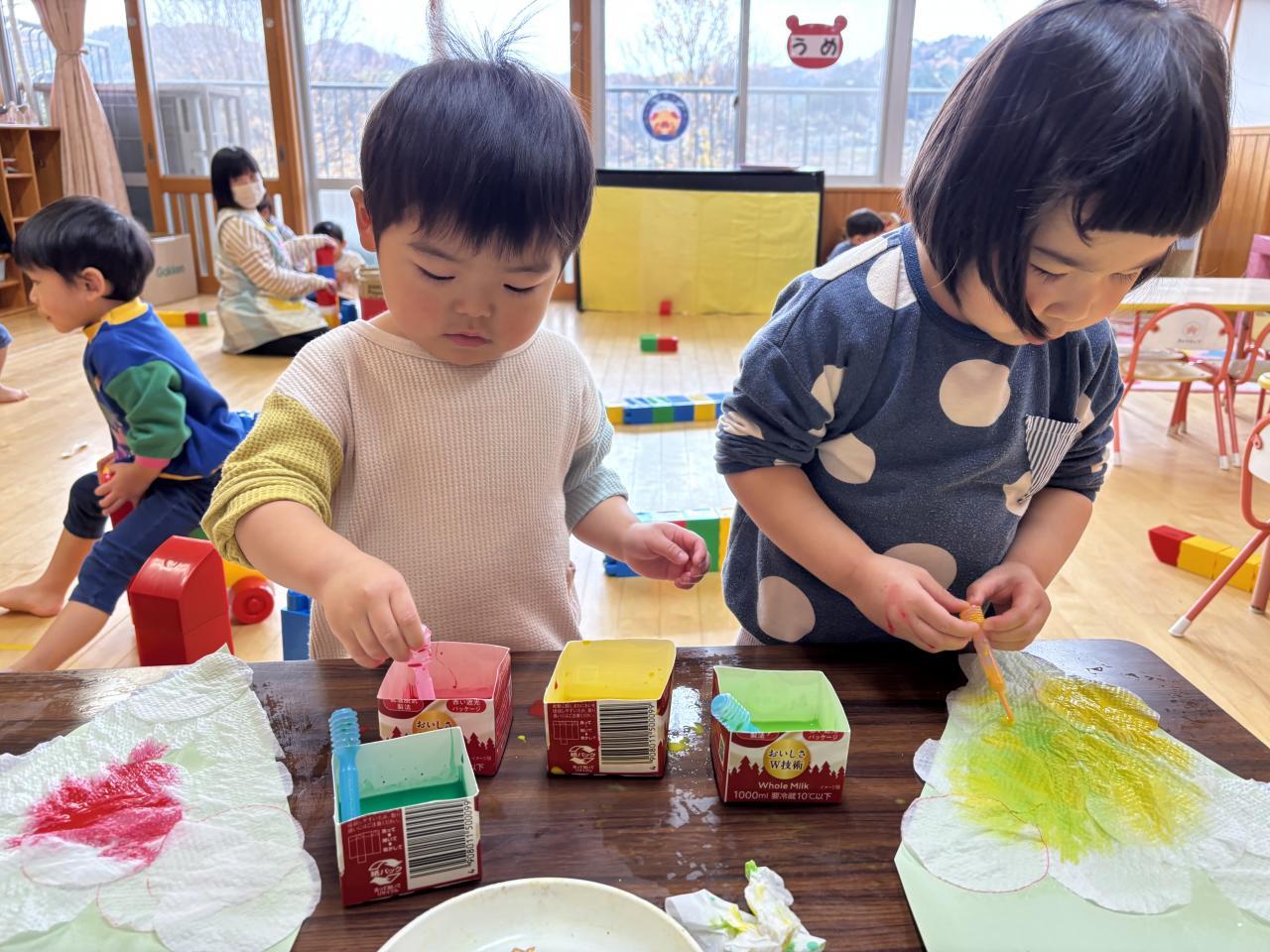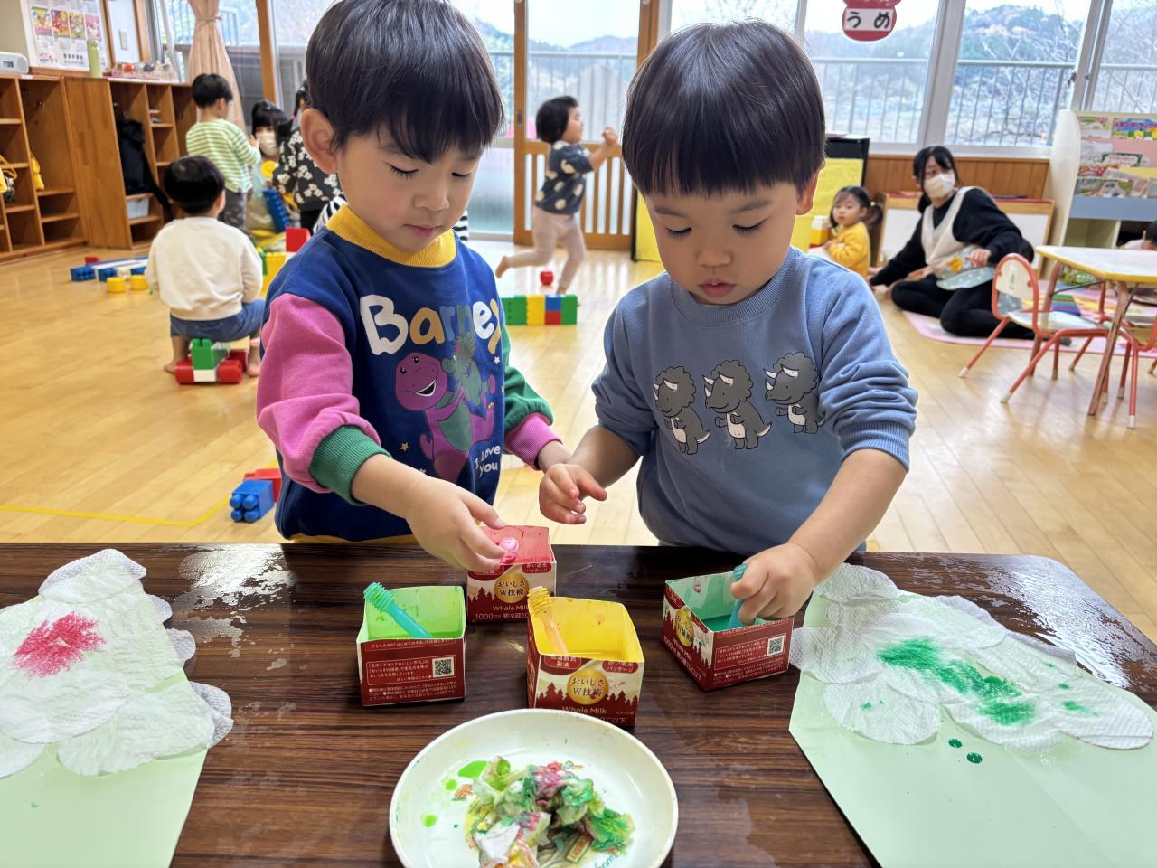 初めてスポイトを使ってみましたが、みんなコツを掴むと楽しかったようで、「まだする〜」「つぎはあか!」「おれんじになった!」など、いろんな発見をしながら楽しむ姿がみられました💡