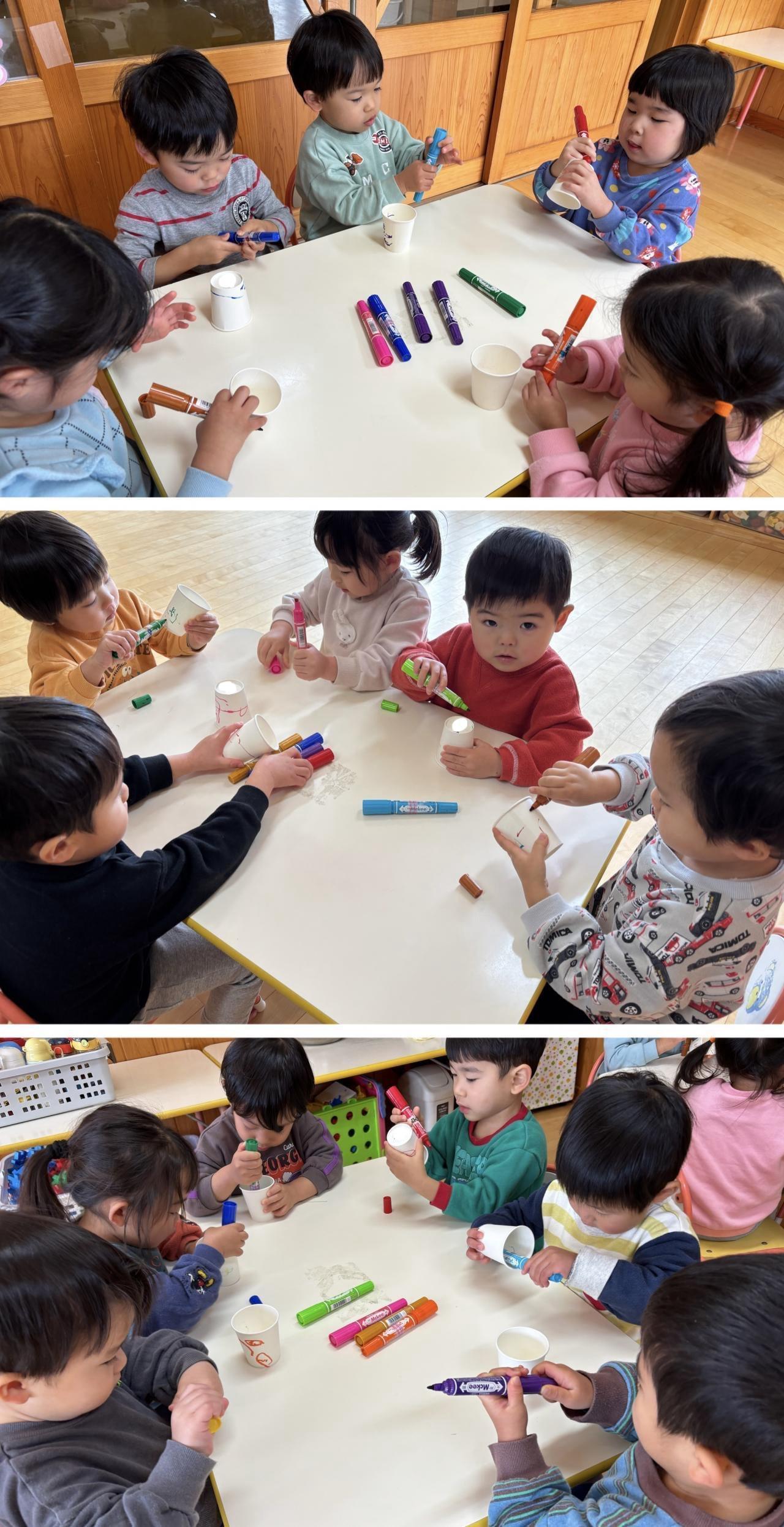 紙コップにマジックで好きな模様を描いていきます。