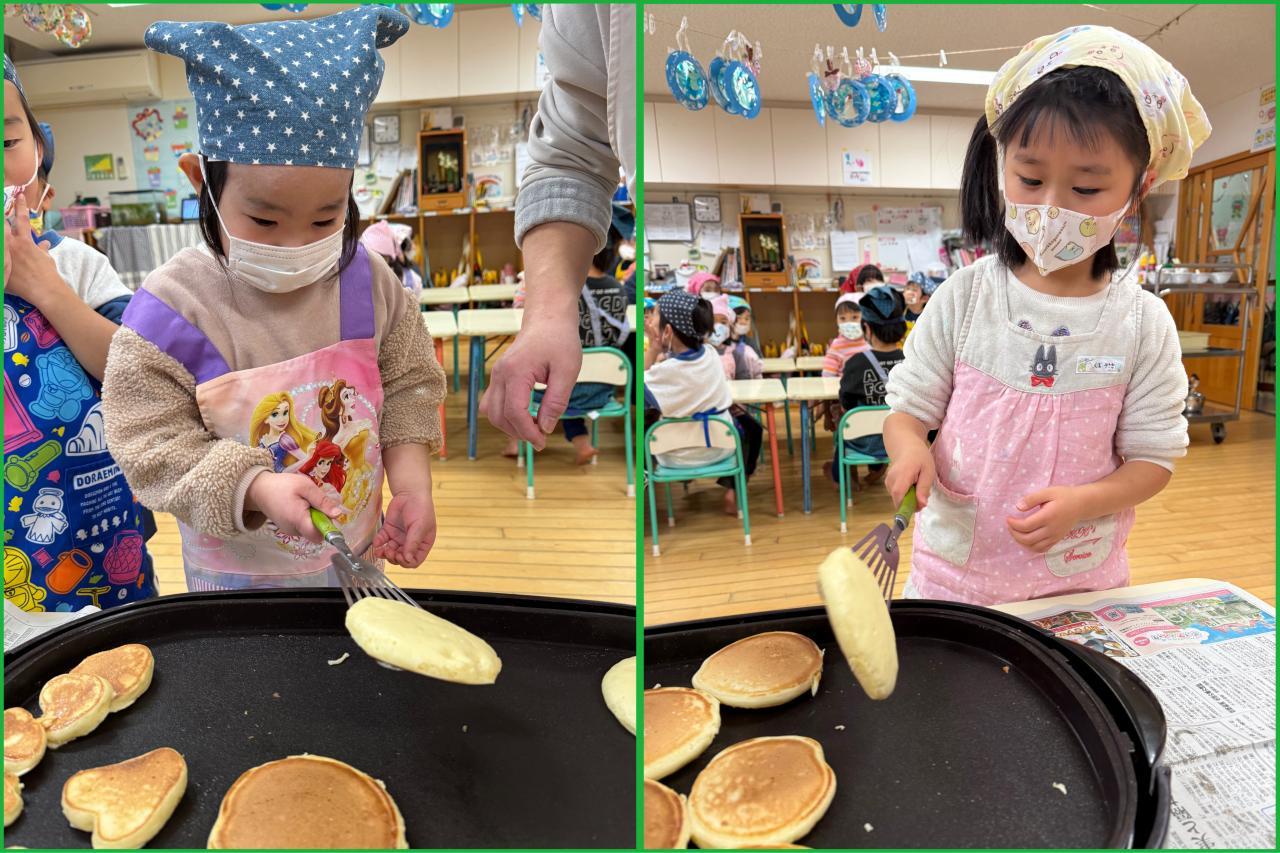 ホットプレートに生地を入れたり、ひっくり返したりするのもとっても上手に出来ました👏