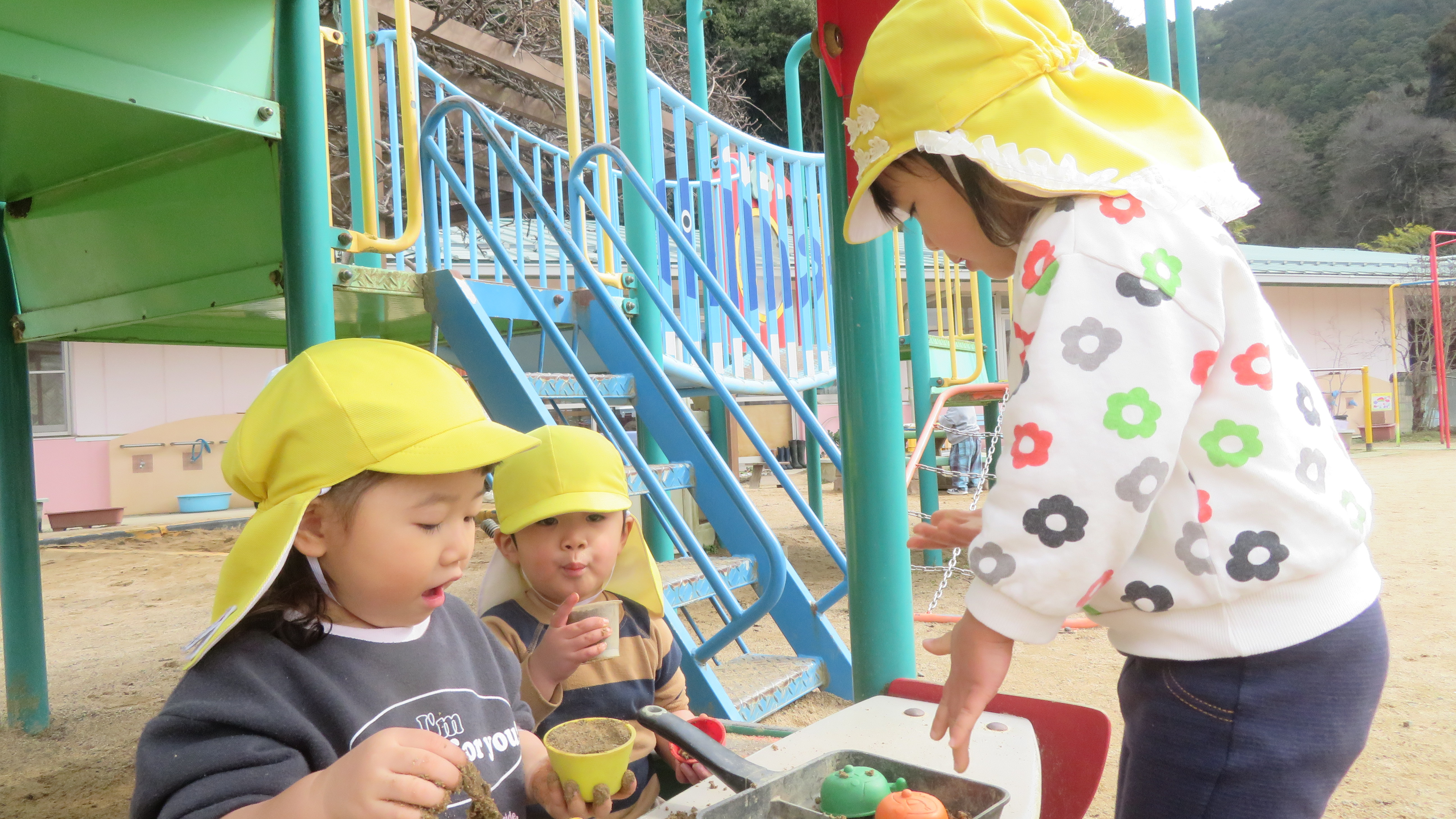 新年度がスタートして一週間が経ちました。新入園児のお友だちは、少しずつ園の生活に慣れ、好きな遊びを見つけて楽しんだり、友だちや先生と関わりながら笑顔も見せてくれるようになりました。進級児のお友だちも新しいクラスで、先生や友だちと好きな遊びを楽しんだり、園庭で元気いっぱい体を動かして遊んでいます。今日の子どもたちの様子をお知らせします。【ぴよ組】午前中のおやつを食べています!おいしい😋シーソーで遊ぼう!よちよち 歩くの楽しい!【ひよこ組】先生のピアノに合わせて歌を歌っています♬振りもつけて上手です!みんなでおやつ おいしい❣美味しいね😀【ねこ組】かめたろうに興味津々!お兄さん、お姉さんの真似っこで高いところも歩けるよ!おままごと楽しいね!園庭遊び 嬉しい!丹波市社会福祉協議会様を通じて市の善意銀行の事業で地域の方からほうれん草をたくさんいただきました。今日の給食のクリームシチューに使用し、美味しくいただきました。地域の方からほうれん草をたくさんいただいたお話を聞いています!「体が元気になるよ!」と話すと大きな口でパクッと食べていました!「おいしい❣」いっぱい遊んでしっかりと食べます!“かめたろう”と遊んだよ!きりん組さんが、甲羅やたらいを洗ってくれました。「えさもどうぞ!」