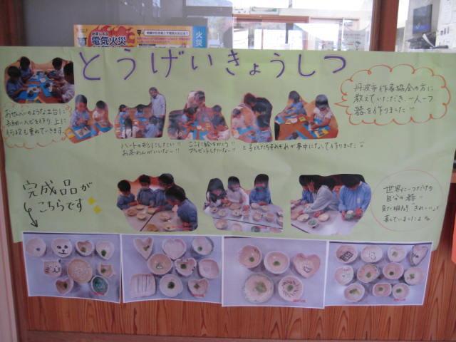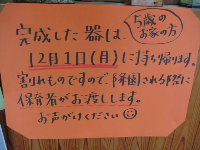 作品は、12月1日(月)に持ち帰ります。割れ物のため、お迎えに来られた時に、保育者に声をかけていただきました方からお渡ししたいと思いますので、よろしくお願いします。