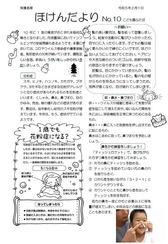 本日「ほけんだよりNo.10」を配付します。今回は花粉症特集です。「スギ、ヒノキ、ハンノキ、カモガヤ、ブタクサ、ヨモギなどさまざまな花粉がアレルゲンとなり症状があらわれるものを花粉症といいます。くしゃみ、鼻水、鼻づまり、目のかゆみ、充血、瞼の腫れなどの症状があります。最近は、低年齢化し幼児のスギ花粉が増えています。今年は、もう、症状がでているようです。」(「ほけんだよりNo.10」より一部抜粋)