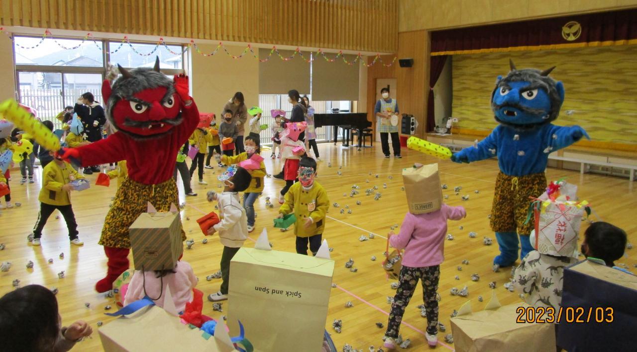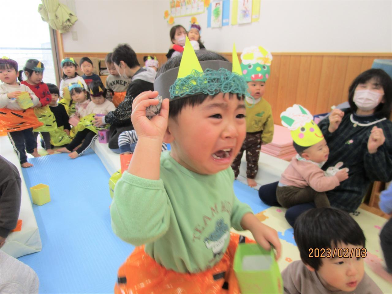 今日は朝から節分の催しを行いました。3・4・5歳児は遊戯室で0・1・2歳児は保育室で行いました。コロナ感染予防のため、例年より時間を短縮しました。「豆まき」の歌を歌ったり、鬼レンジャーを踊ったり、鬼退治をして楽しみました。泣きながら鬼に向かって投げている顔が何とも言えませんでした。