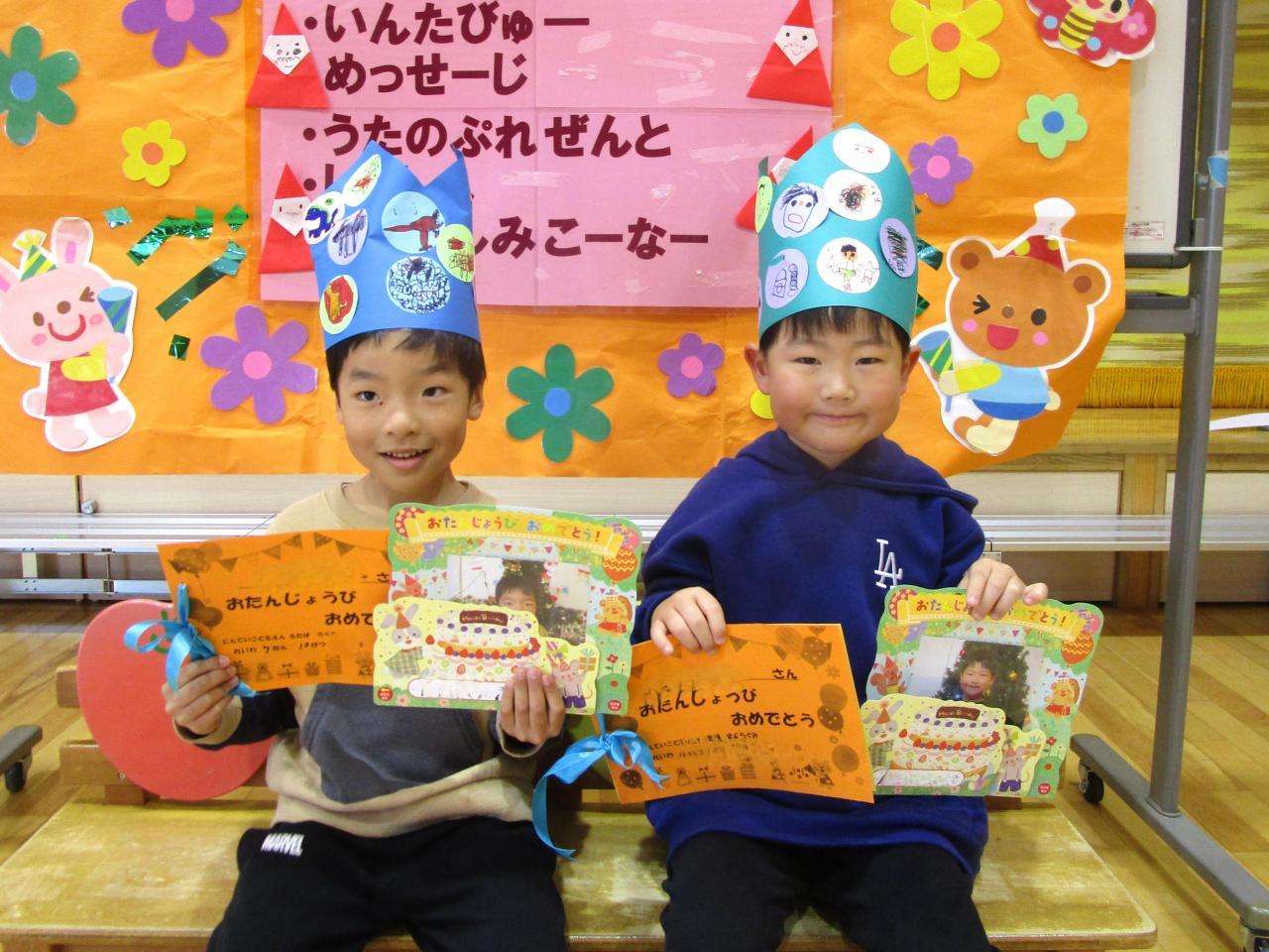 5歳児の12月生まれは3人(内1人欠席)です。保護者からのお祝いメッセージの一部をお届けしますね。