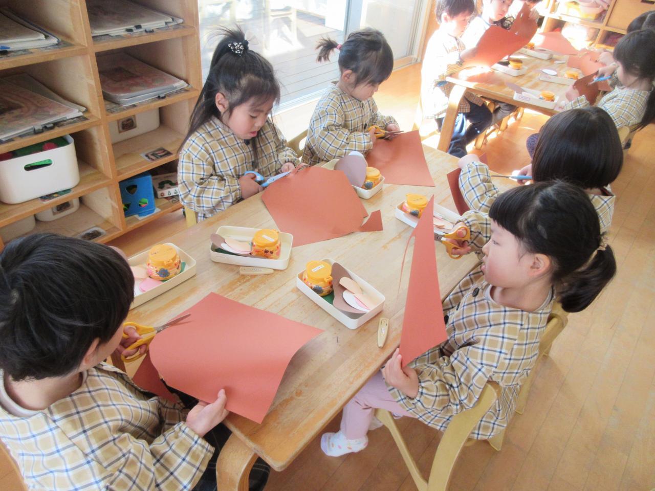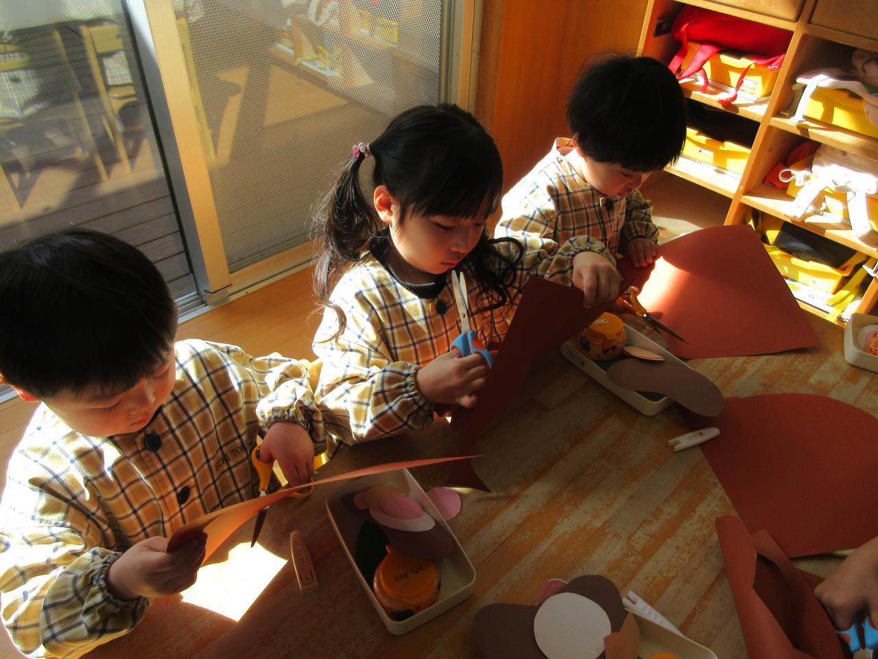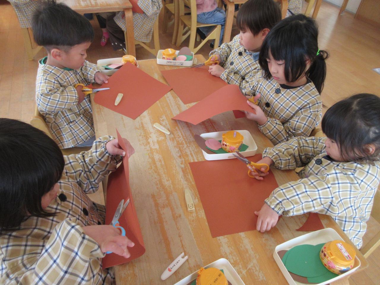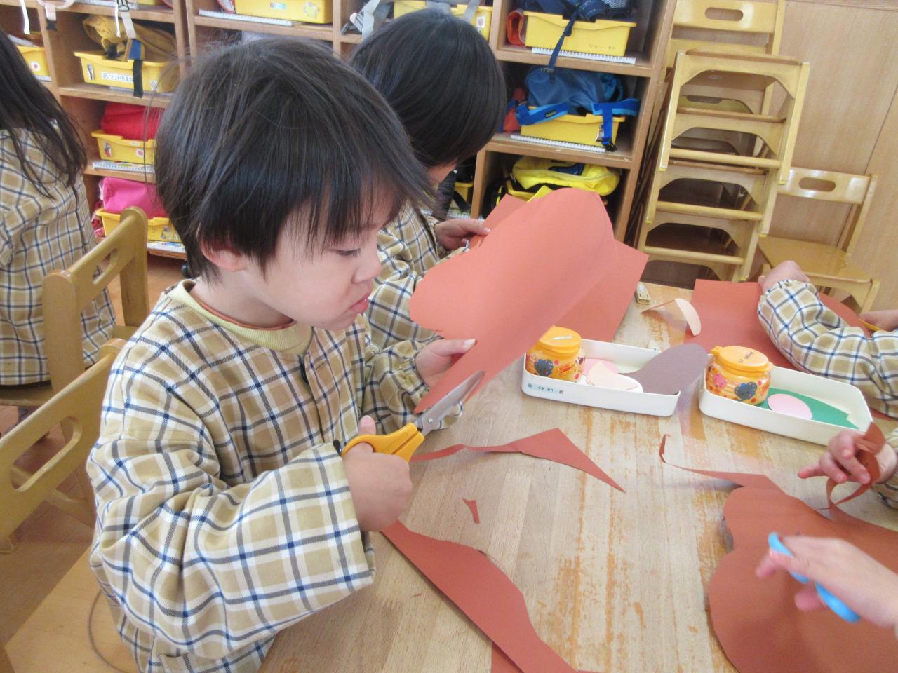 今日は発表会でぽんたのじどうはんばいきの劇をしたのでみんなで思い出の表紙にたぬき作りに挑戦しました。まずたぬきの顔をはさみで切り、持ち方に気を付けながら、線の上を集中して切りました。そのあとはのりで顔や目、ほっぺたや葉っぱなど見本を見ながら貼りました。のりをつける時はつけすぎず、しっかりとのばしたり、一本の指にだけのりをつけたりと約束ごとをしっかりと守りながら取り組むことができました。完成すると、「できた~」と喜ぶ姿が見られ、次に目などを描くのを楽しみにしています。