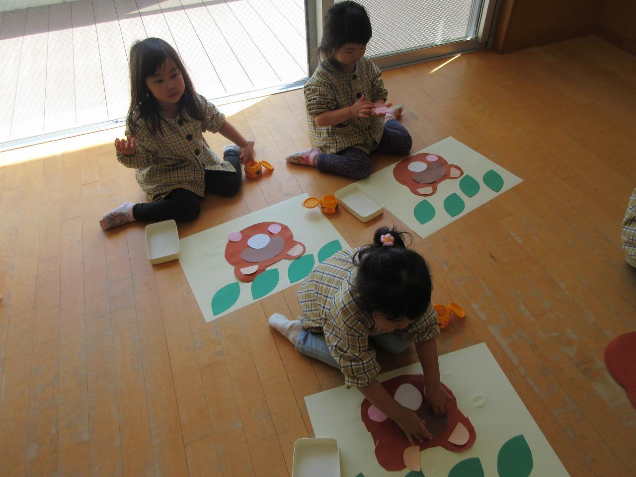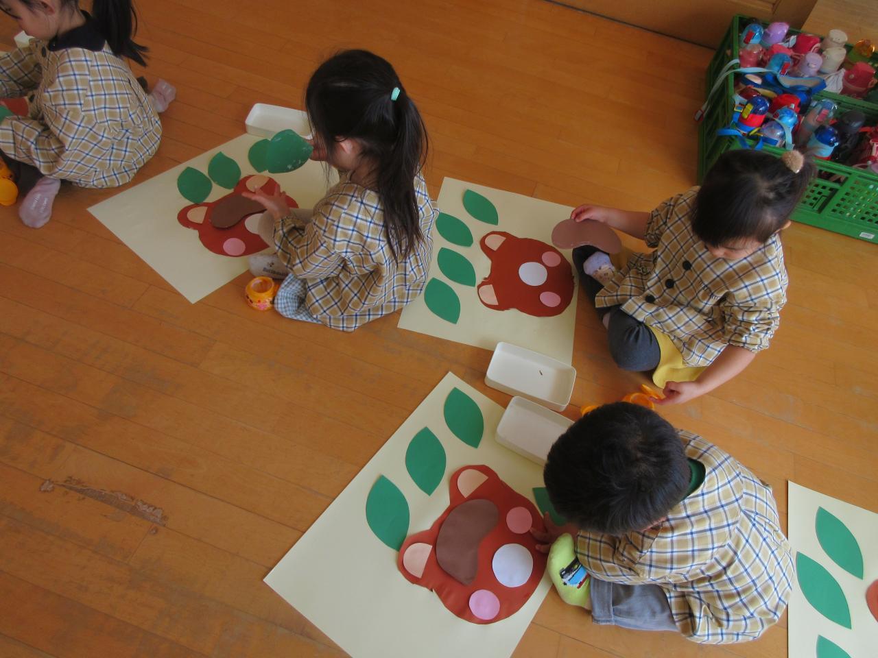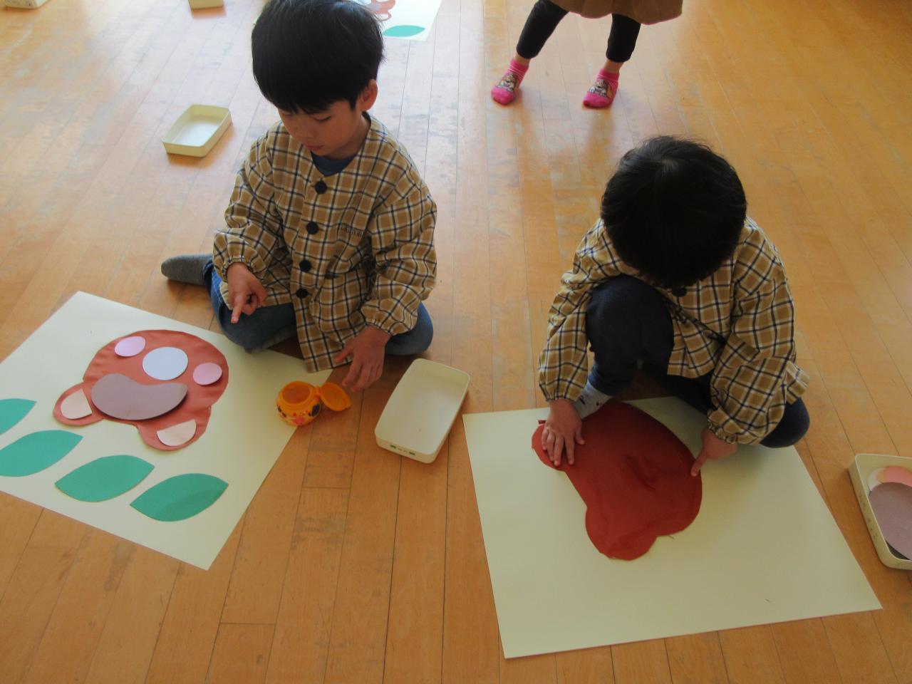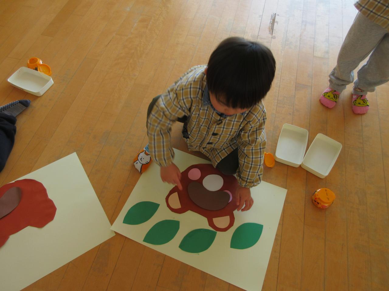 今日は発表会でぽんたのじどうはんばいきの劇をしたのでみんなで思い出の表紙にたぬき作りに挑戦しました。まずたぬきの顔をはさみで切り、持ち方に気を付けながら、線の上を集中して切りました。そのあとはのりで顔や目、ほっぺたや葉っぱなど見本を見ながら貼りました。のりをつける時はつけすぎず、しっかりとのばしたり、一本の指にだけのりをつけたりと約束ごとをしっかりと守りながら取り組むことができました。完成すると、「できた~」と喜ぶ姿が見られ、次に目などを描くのを楽しみにしています。