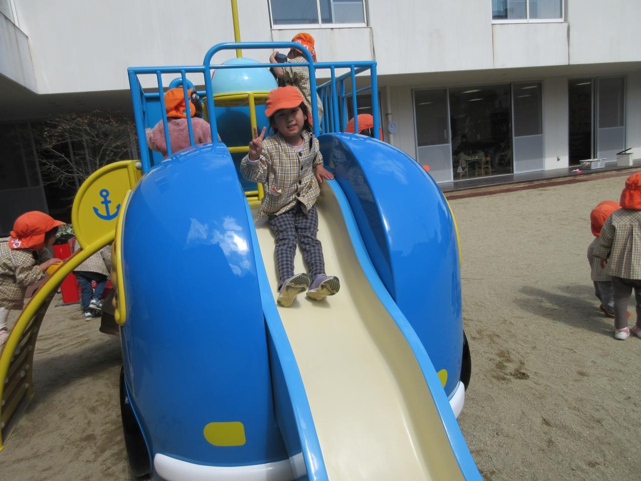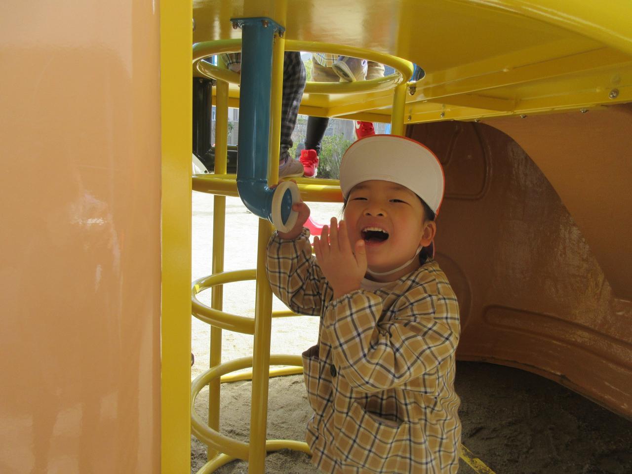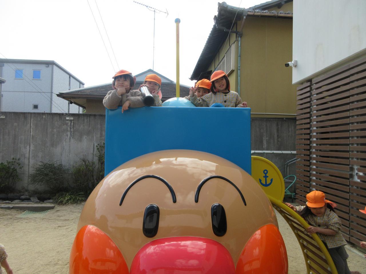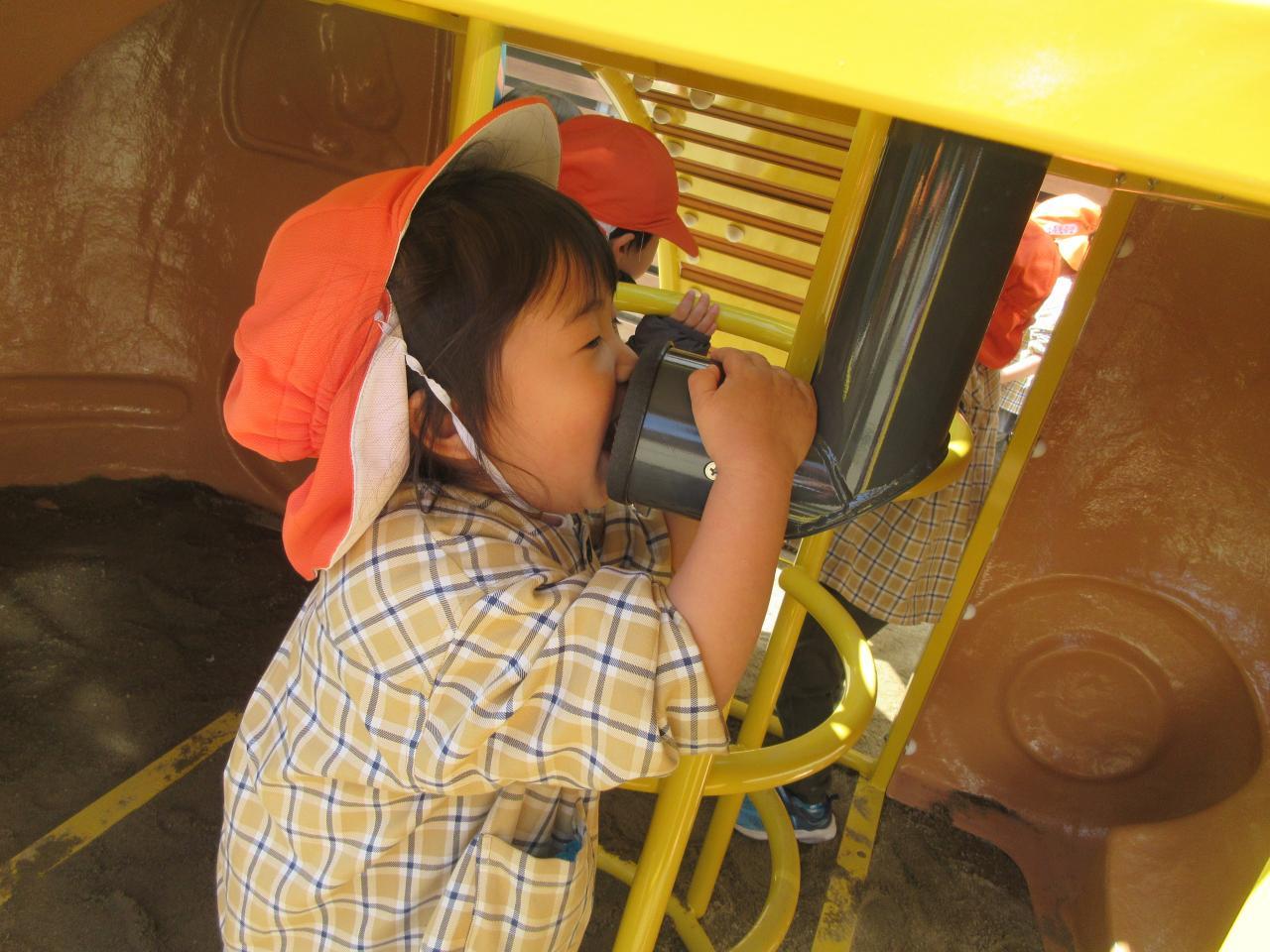 その後は戸外で好きな遊びをしました。雨が降っていてずっと遊べず、楽しみにしていた新しいアンパンマン号の滑り台で遊んだり、鬼ごっこや四輪車で遊びました。アンパンマンの滑り台では、ボルダリングのところが難しく、一つ一つ足をしっかりとかけながら挑戦し、また糸電話のように上と下で会話ができる遊びも大人気で、みんなで「○○です」「今何しているよう~」と楽しそうにやりとりをする姿が見られました。