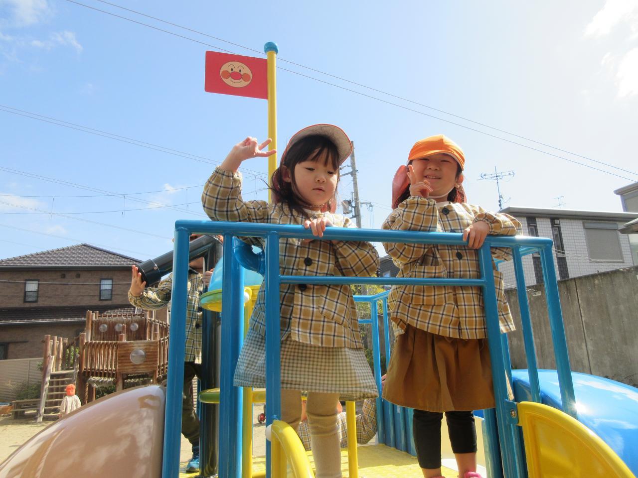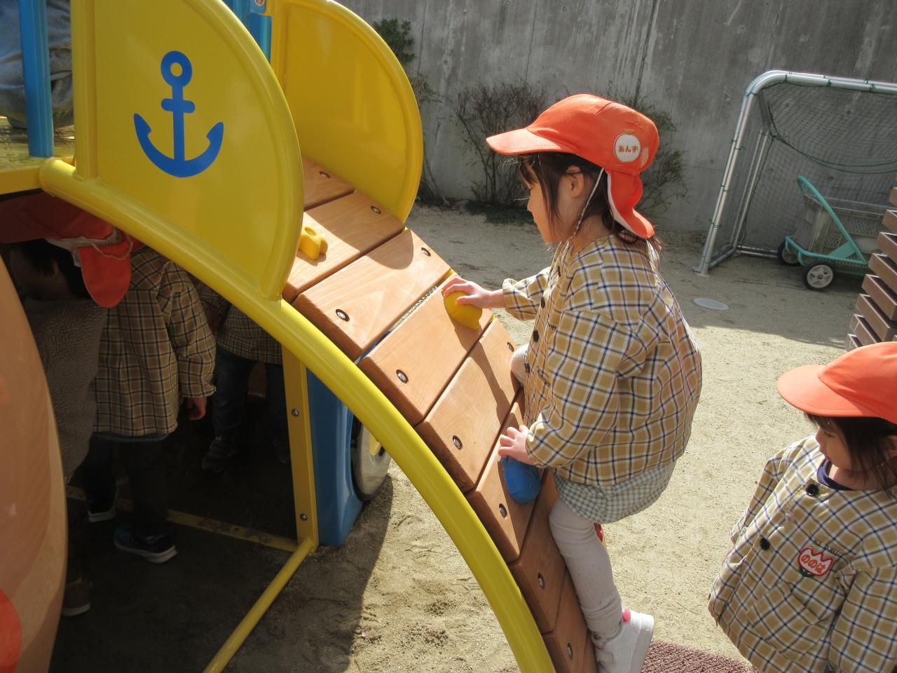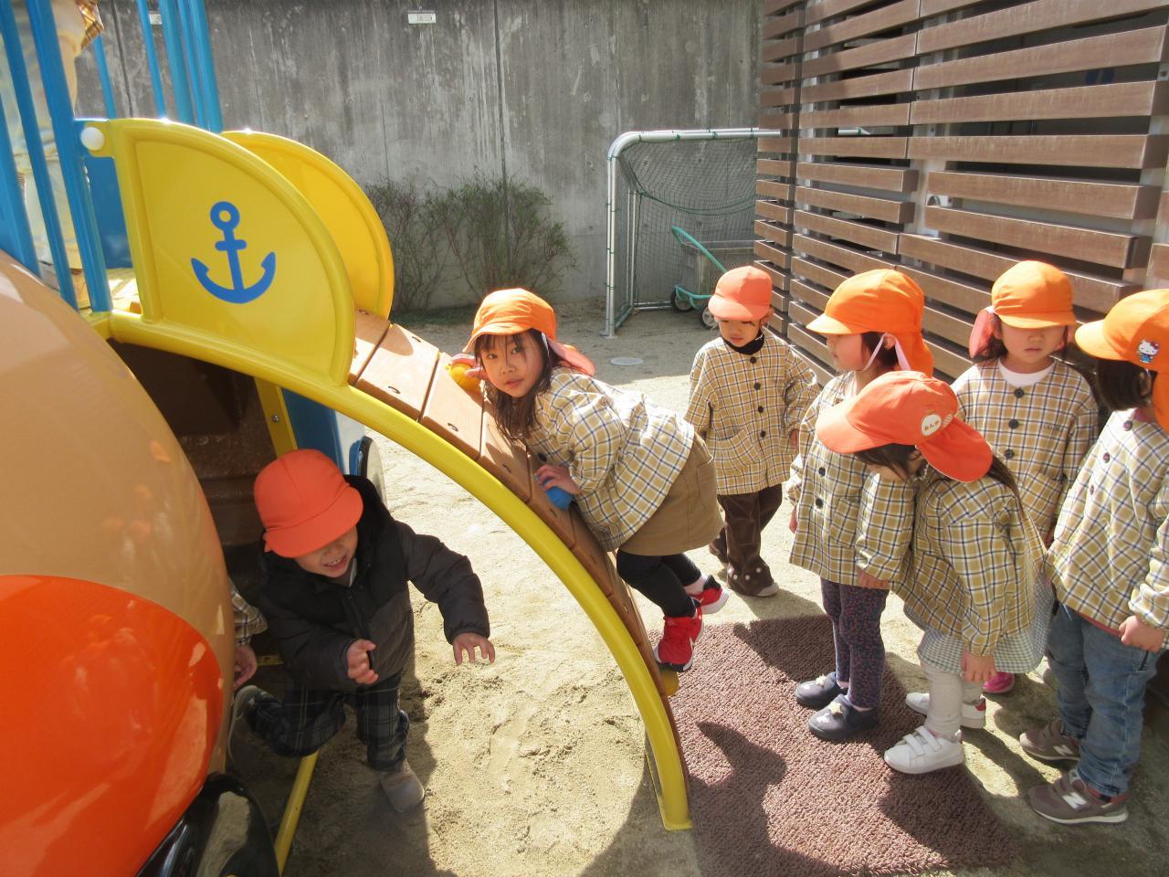 その後は戸外で好きな遊びをしました。雨が降っていてずっと遊べず、楽しみにしていた新しいアンパンマン号の滑り台で遊んだり、鬼ごっこや四輪車で遊びました。アンパンマンの滑り台では、ボルダリングのところが難しく、一つ一つ足をしっかりとかけながら挑戦し、また糸電話のように上と下で会話ができる遊びも大人気で、みんなで「○○です」「今何しているよう~」と楽しそうにやりとりをする姿が見られました。