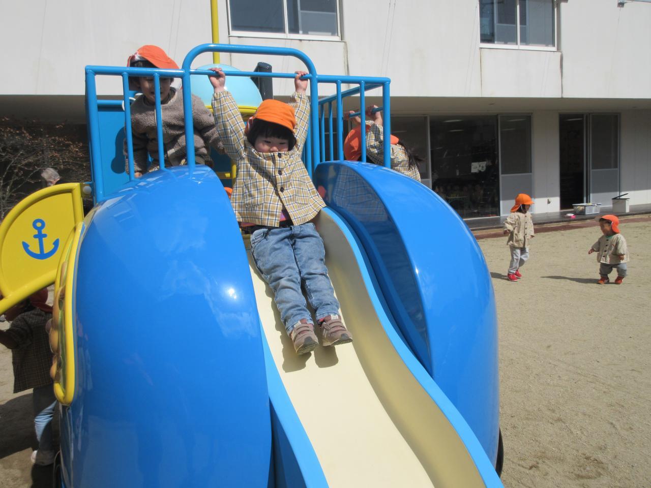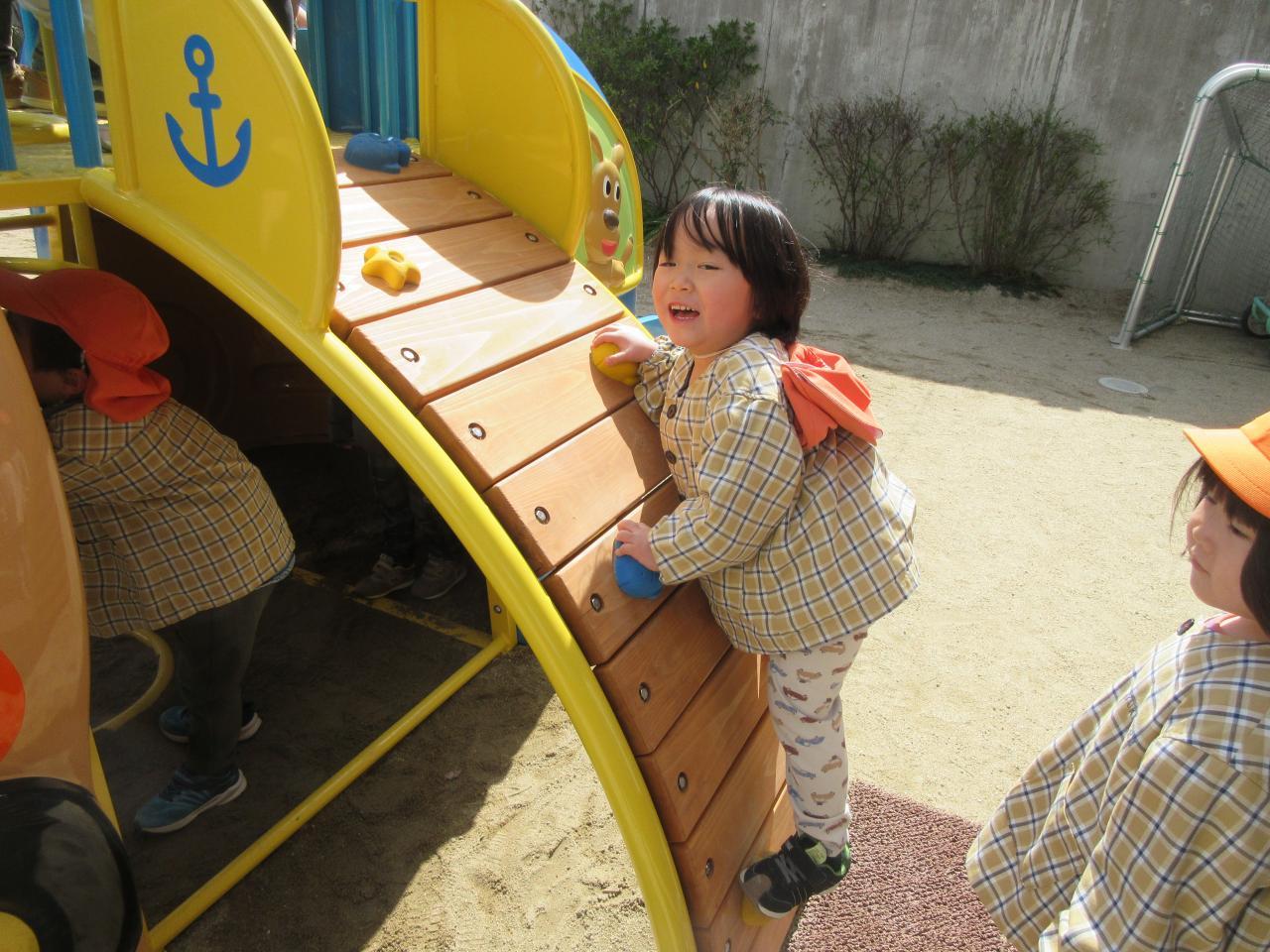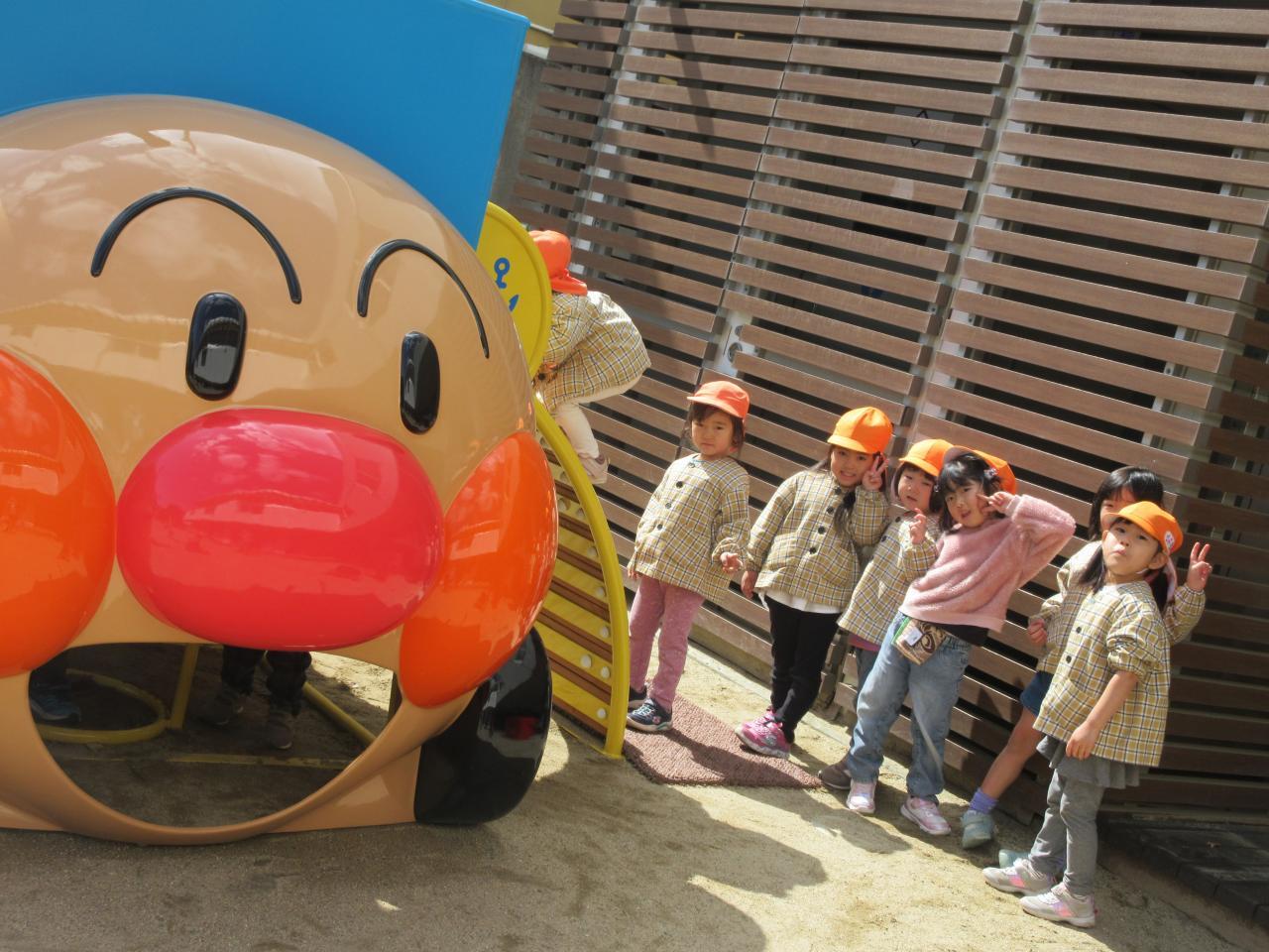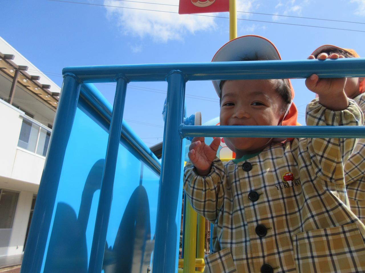 その後は戸外で好きな遊びをしました。雨が降っていてずっと遊べず、楽しみにしていた新しいアンパンマン号の滑り台で遊んだり、鬼ごっこや四輪車で遊びました。アンパンマンの滑り台では、ボルダリングのところが難しく、一つ一つ足をしっかりとかけながら挑戦し、また糸電話のように上と下で会話ができる遊びも大人気で、みんなで「○○です」「今何しているよう~」と楽しそうにやりとりをする姿が見られました。