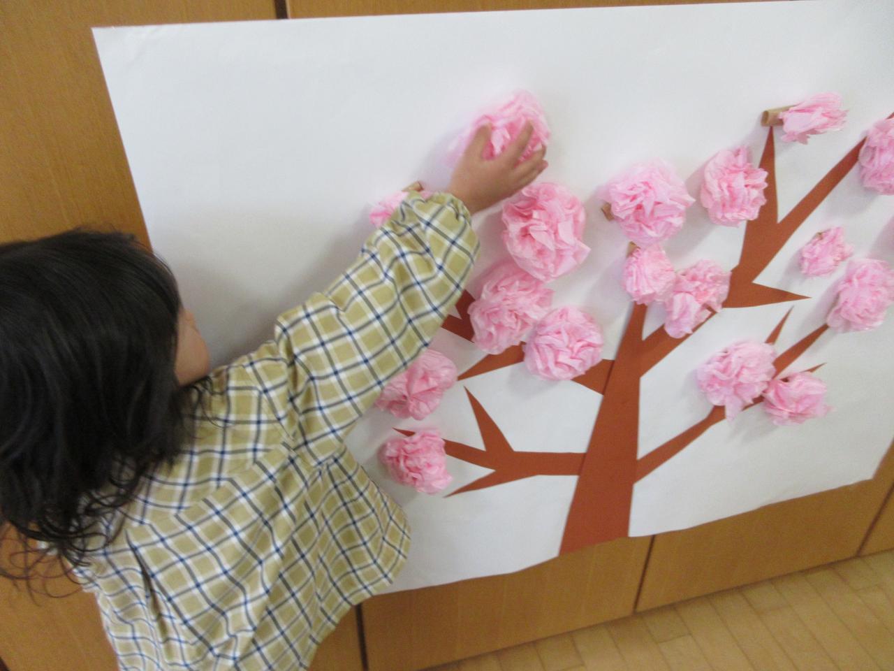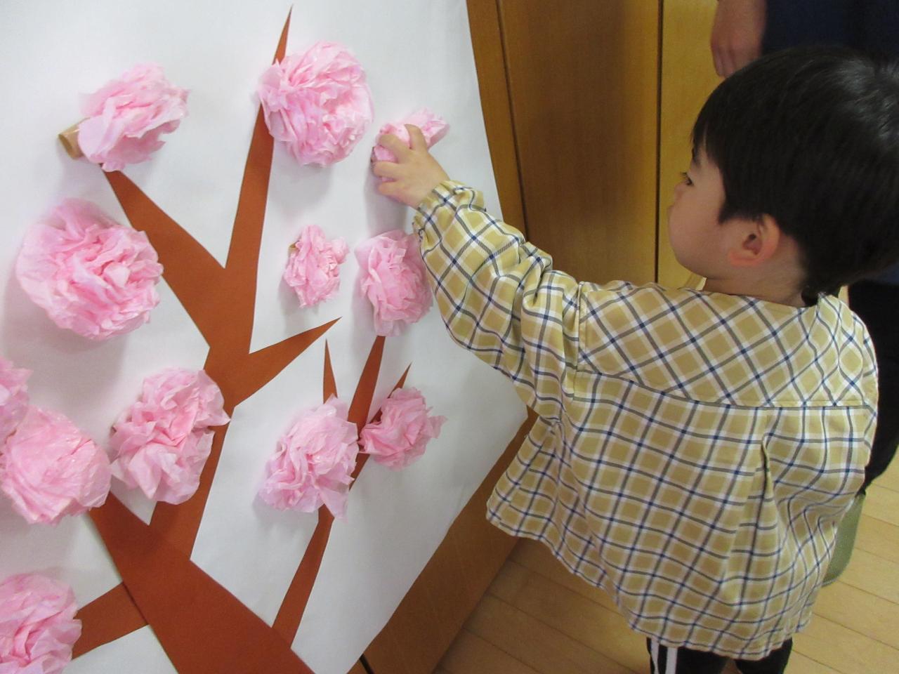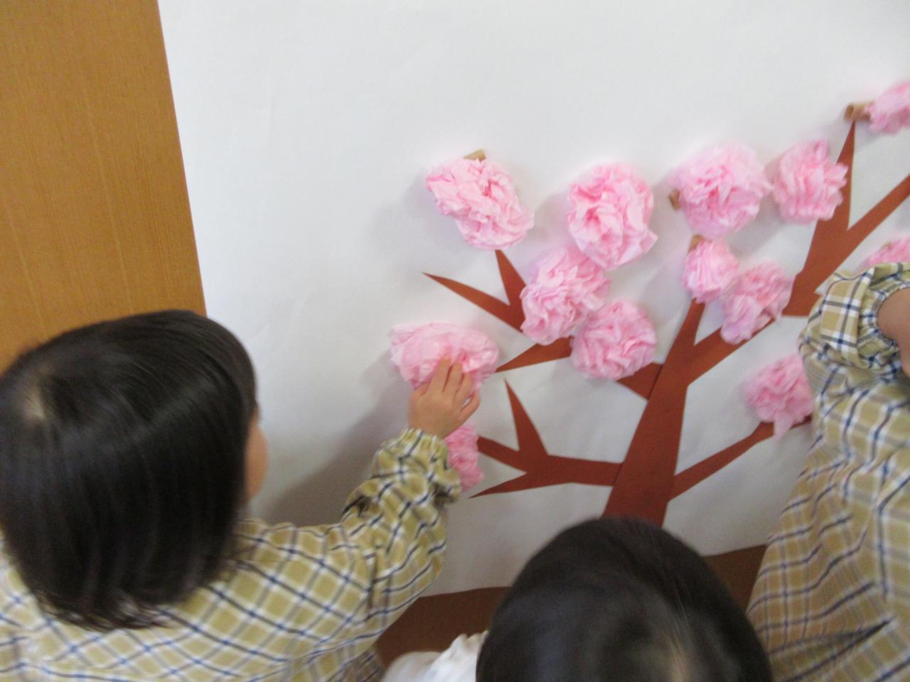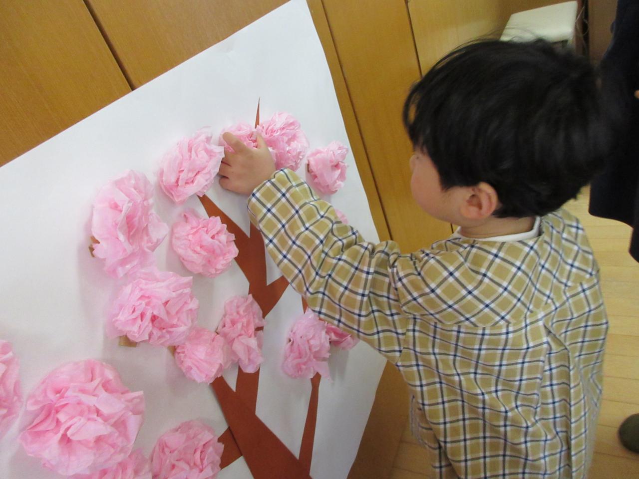 その後は、桃の花を探すゲームに参加しました。部屋に隠れている桃の花を探して、木に貼り付け桃の花の木を完成させました。出来上がると「めっちゃきれい~!」「もものはなかわいい~!」と話していましたよ。給食のちらし寿司もお花の形をしていて、嬉しそうに食べていました。