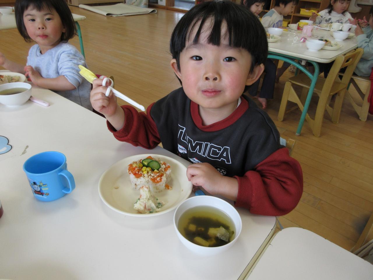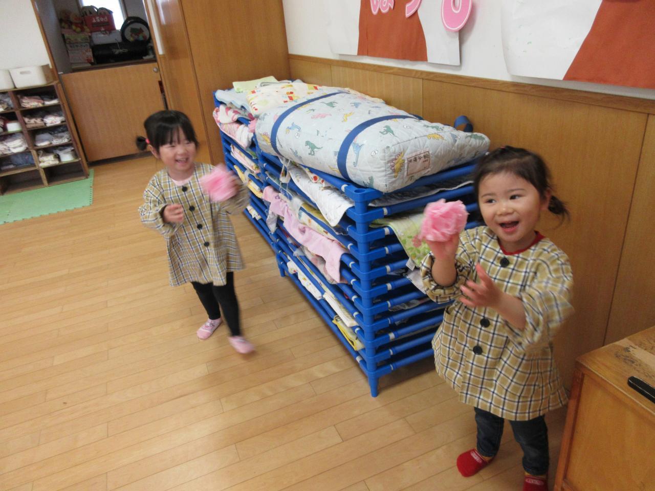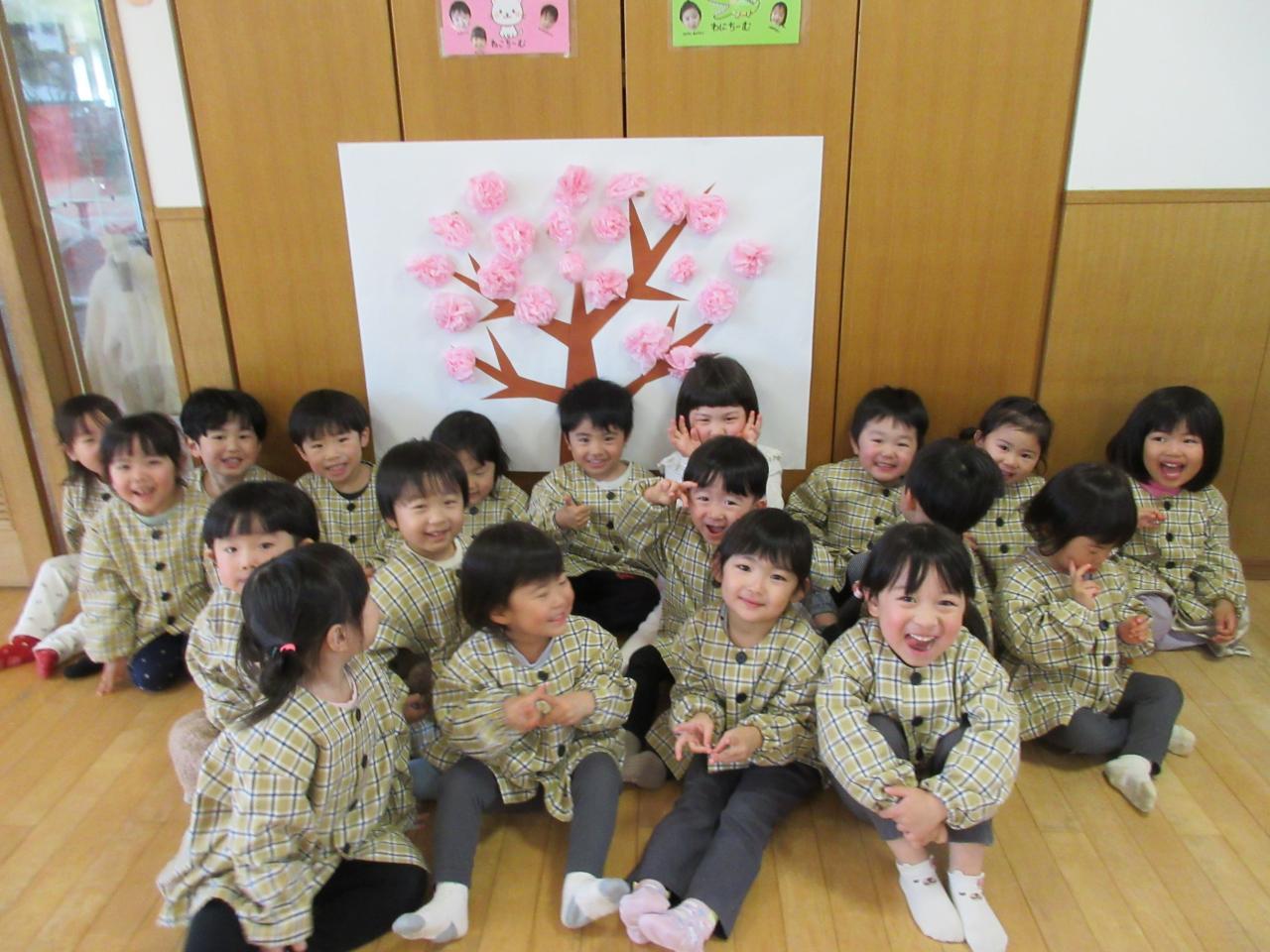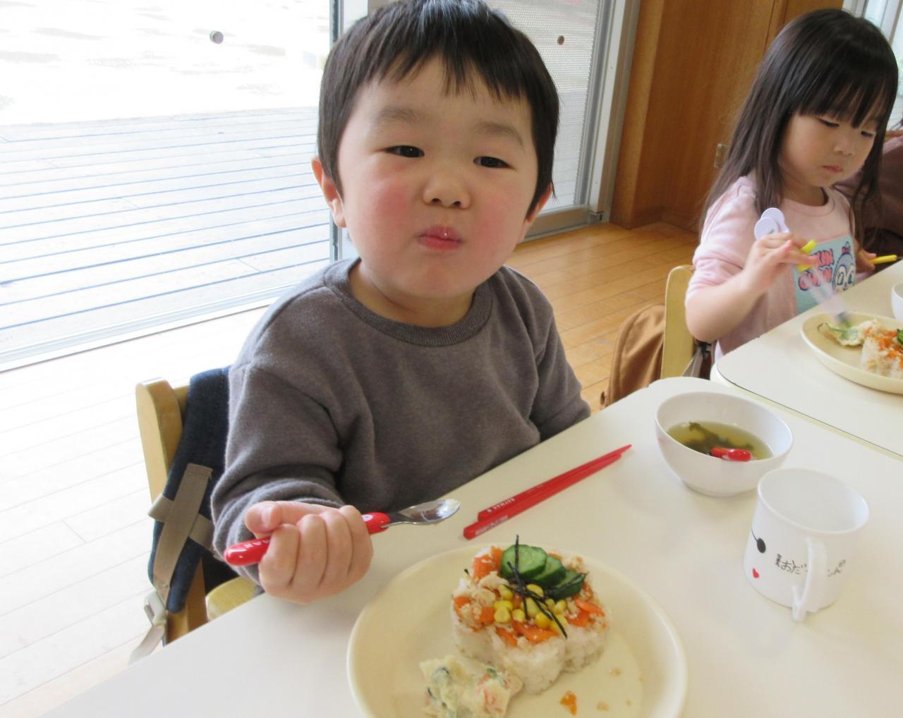 その後は、桃の花を探すゲームに参加しました。部屋に隠れている桃の花を探して、木に貼り付け桃の花の木を完成させました。出来上がると「めっちゃきれい~!」「もものはなかわいい~!」と話していましたよ。給食のちらし寿司もお花の形をしていて、嬉しそうに食べていました。