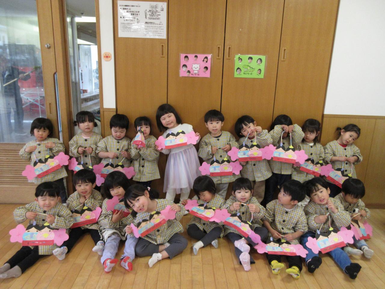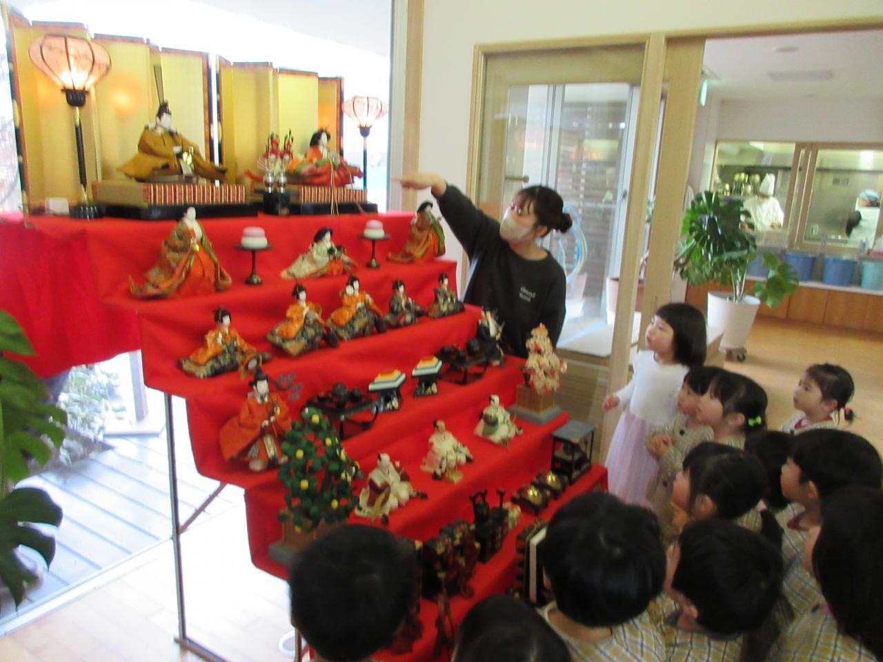 紙芝居には、お内裏様お雛様・三人官女・五人囃子などが出てきて、人形の手に持っている物は何かを一緒に考えたり実際にこども園にあるひな人形の飾りを見に行ったり、お歌を歌って楽しみました。