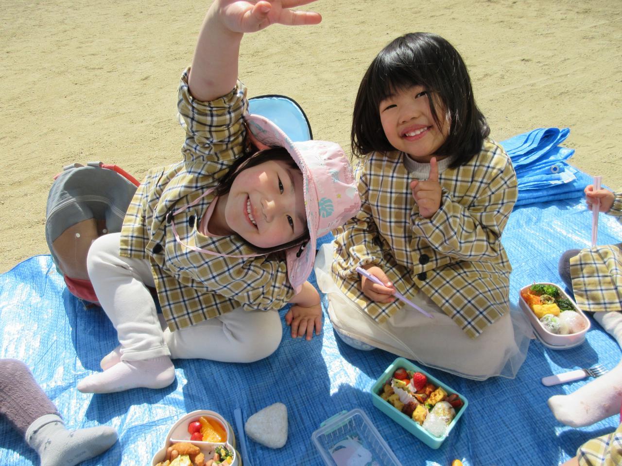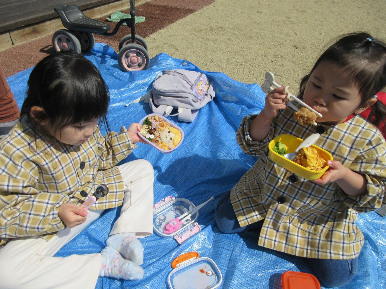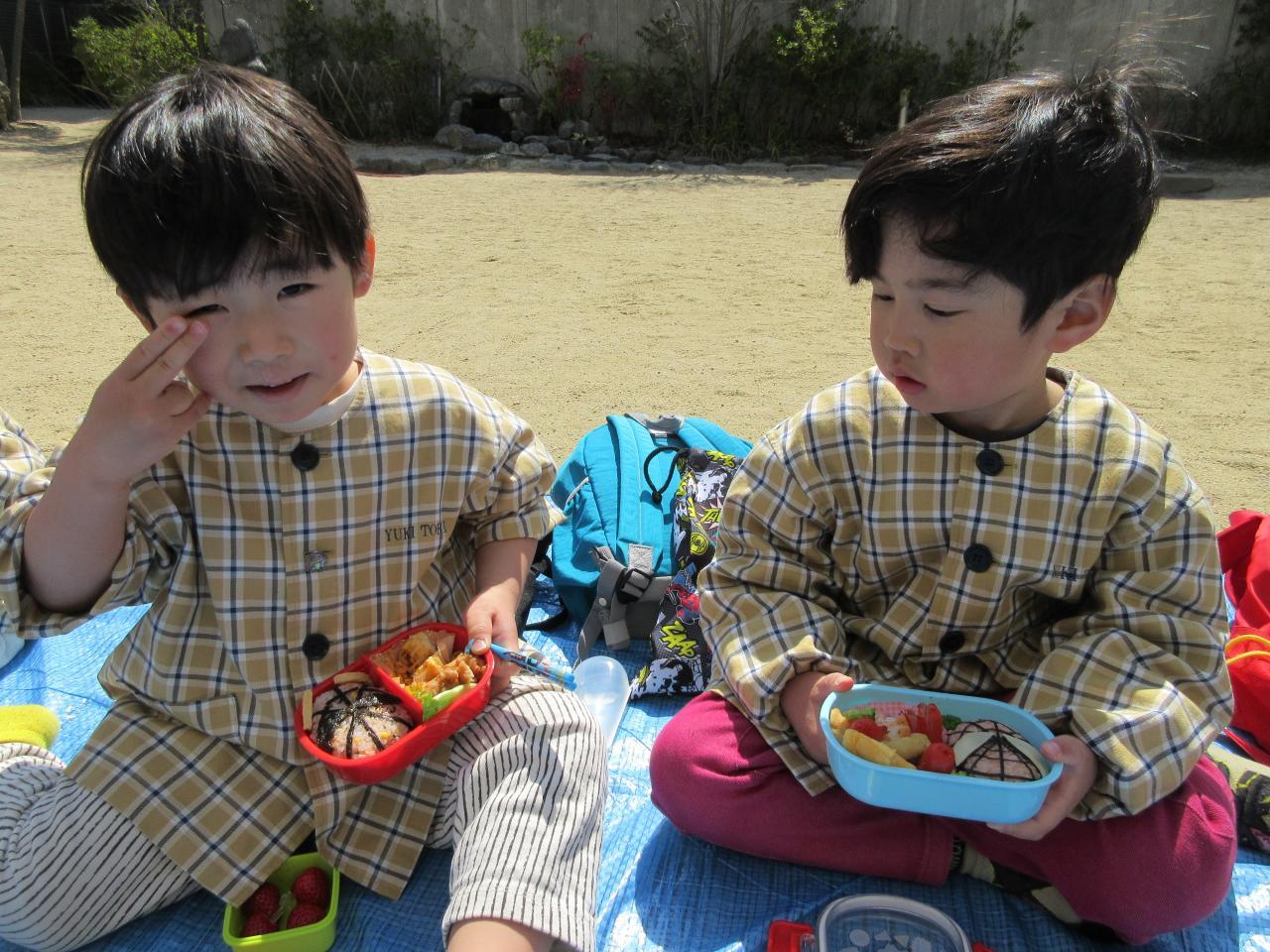 お昼ご飯はみんなが持ってきたお弁当を園庭で食べました。「私はキティーちゃん!!」「僕はスパイダーマンやで!!」と作ってもらったお弁当をものすごく嬉しそうにお友だちと見せ合いをしていました。ものすごく大事に味わってお弁当を食べていたりんご組さんでした。