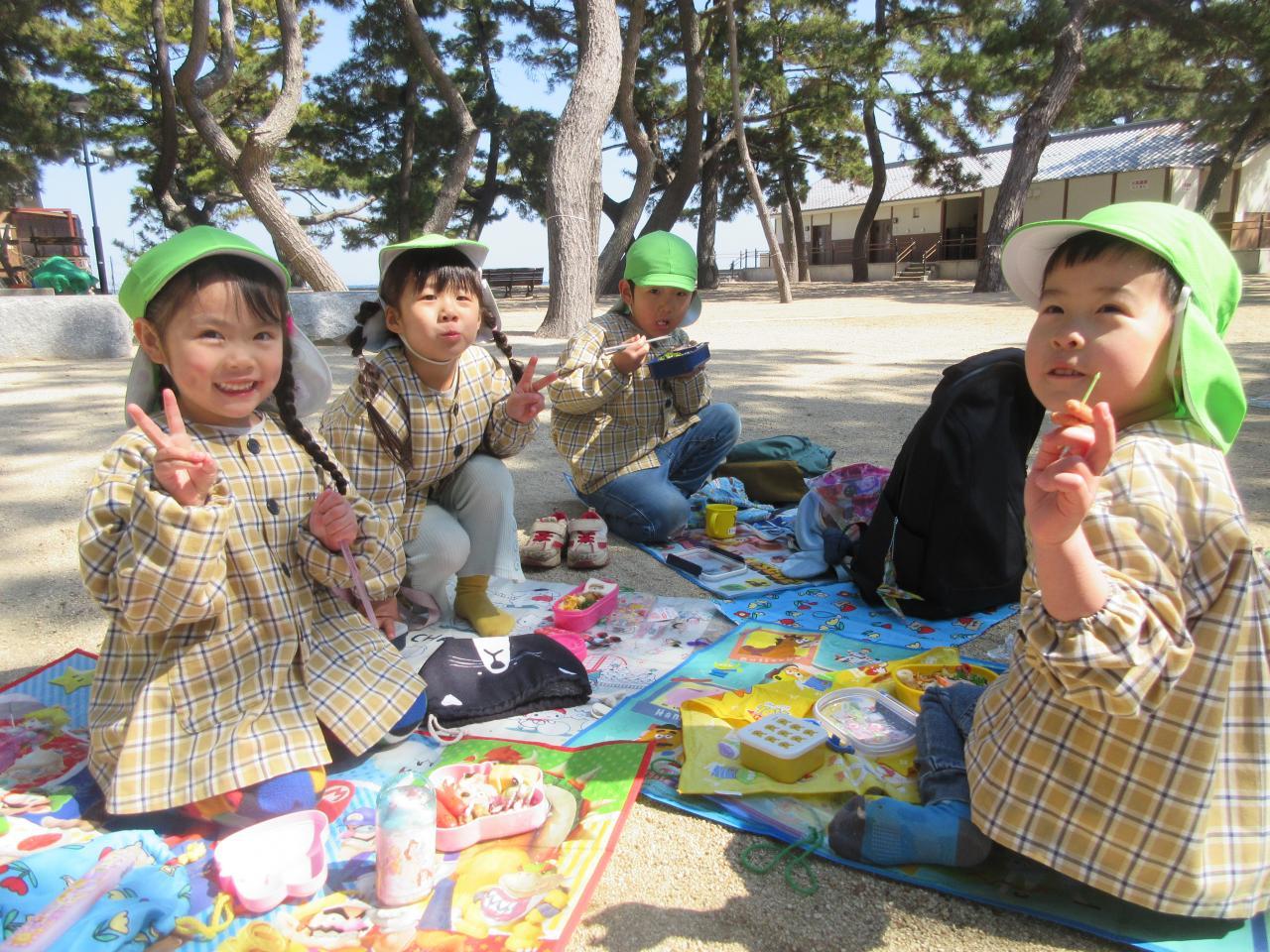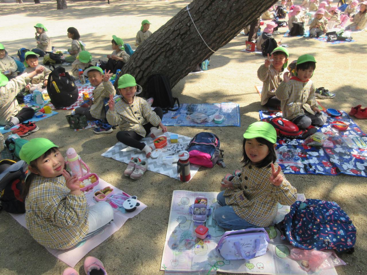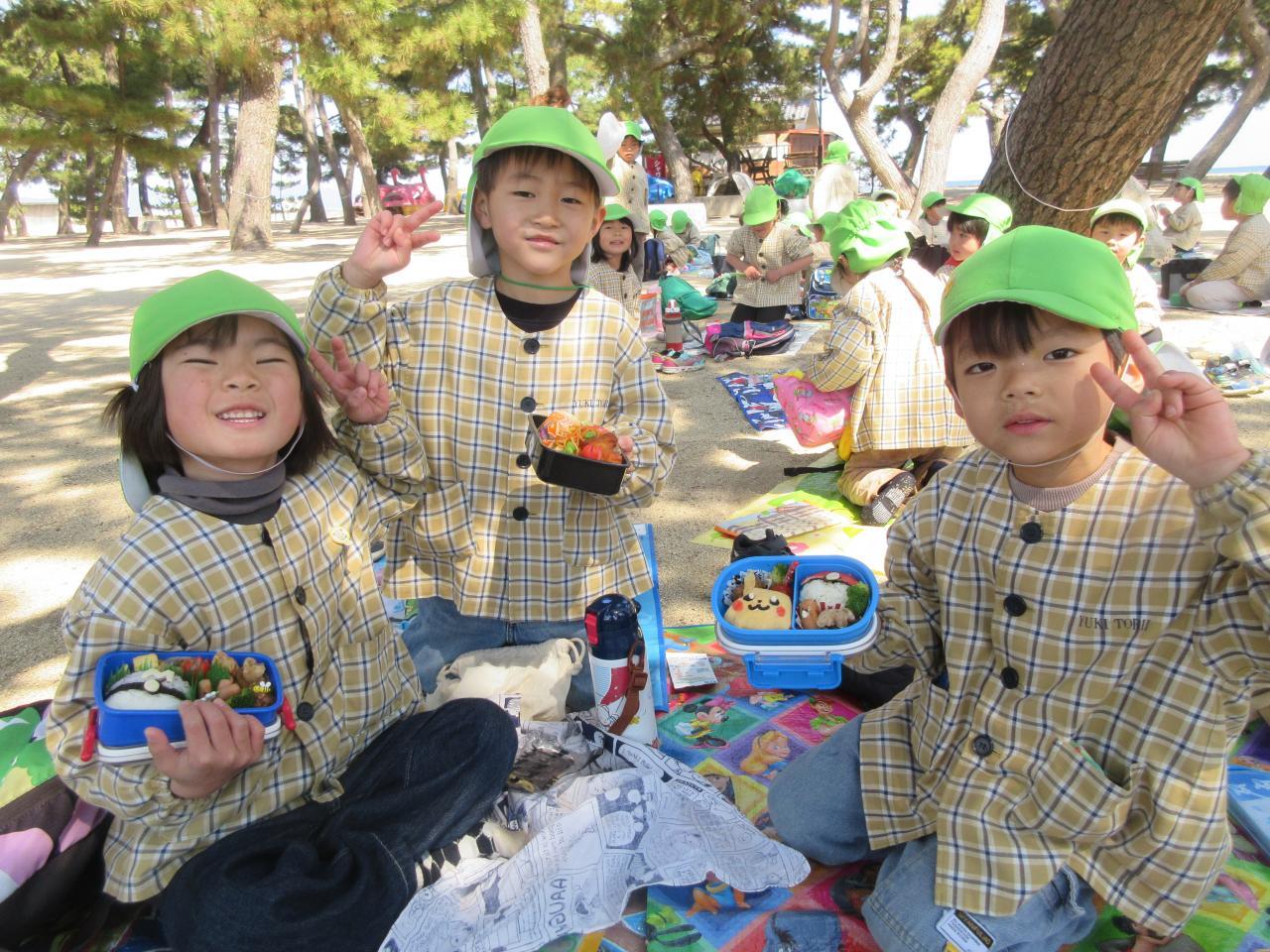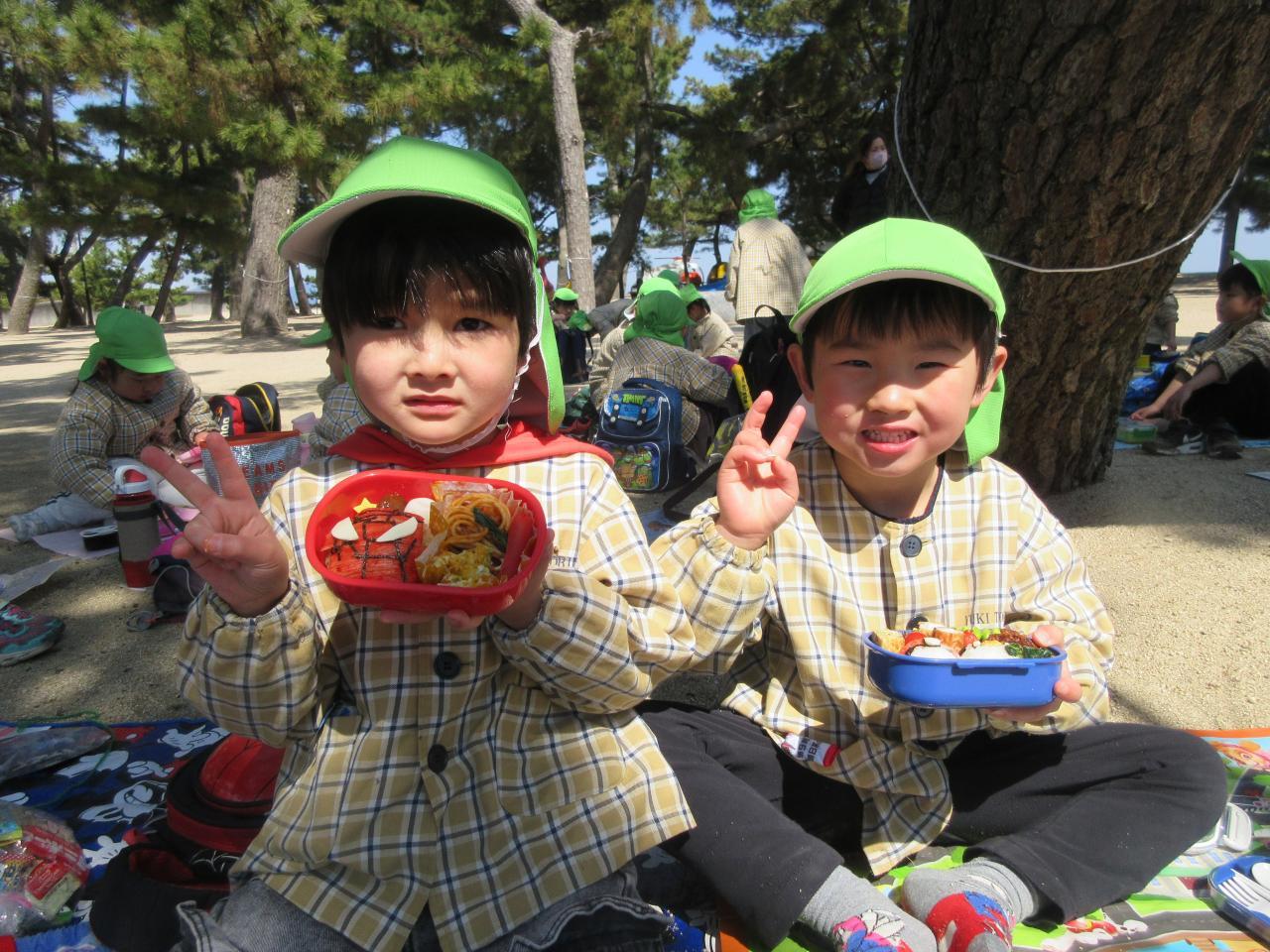 お昼には、楽しみにしていたお弁当をみんなで一緒に食べました。「みて~、ポケモンのおべんとう!!」「ママが作ってくれた~!」とお友だちと見せ合い「めっちゃ美味しい~」と大喜びで食べていました。