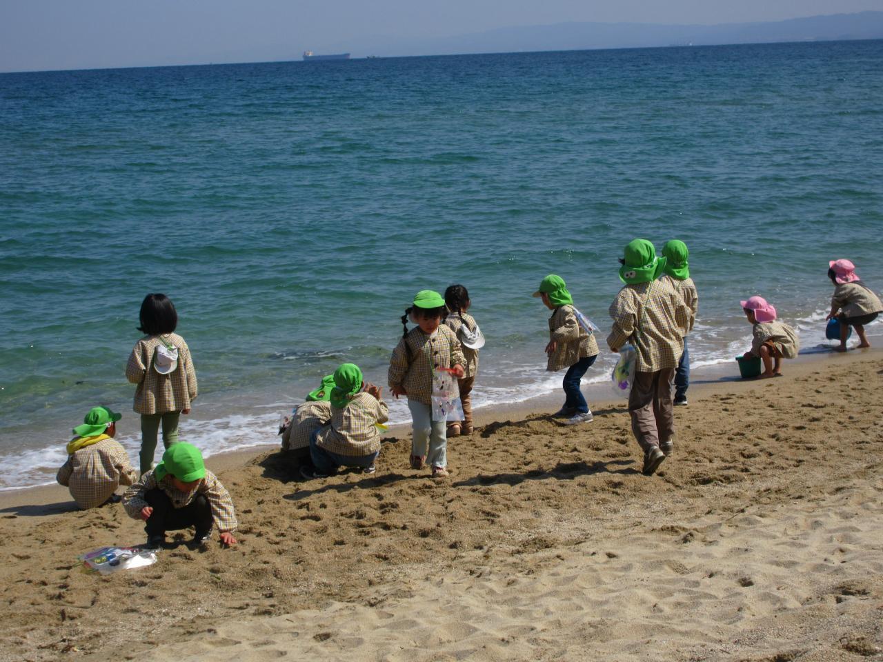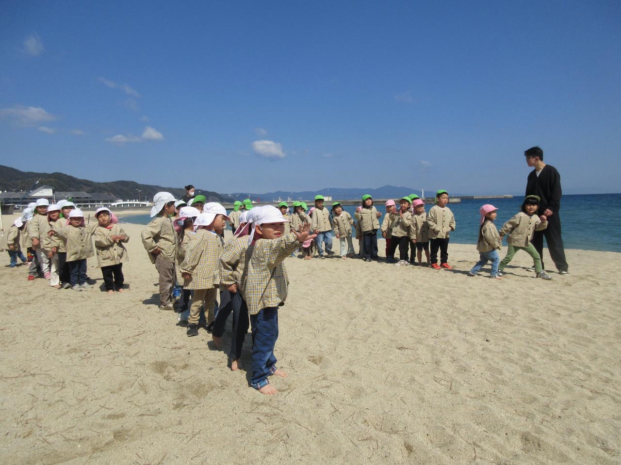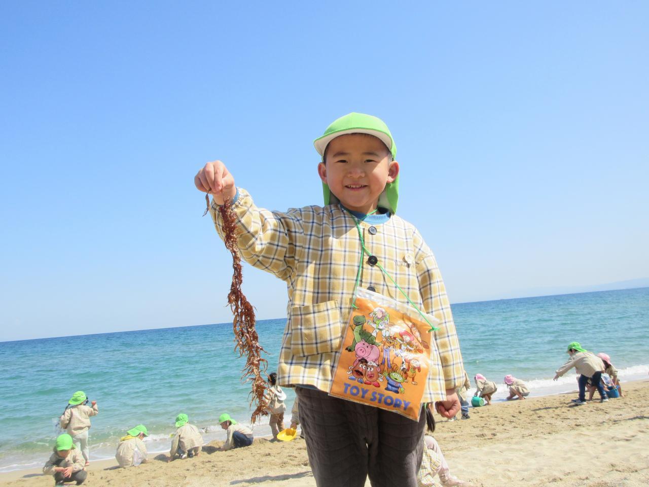 今日は、楽しみにしていたピクニックで大浜海岸へ行きました。うさぎ組のお友だちと手を繋ぎ会話を弾ませたり、優しく手を引いてあげながらウキウキとした様子で歩いていきました。着いてからは、みんなでしっぽ取りやリレーなどのゲームをし、その後それぞれ自由に好きな遊びを楽しみました。波と追いかけっこをしたり、貝殻や葉っぱを拾って昨日作ったお散歩バッグに集めたり、海に向かって叫んだりと広々とした砂浜で伸び伸びと遊んでいました。