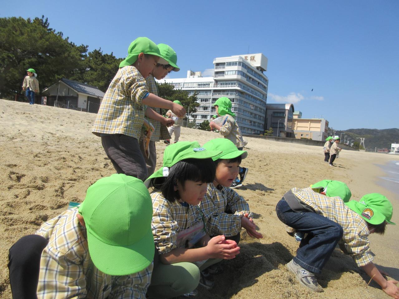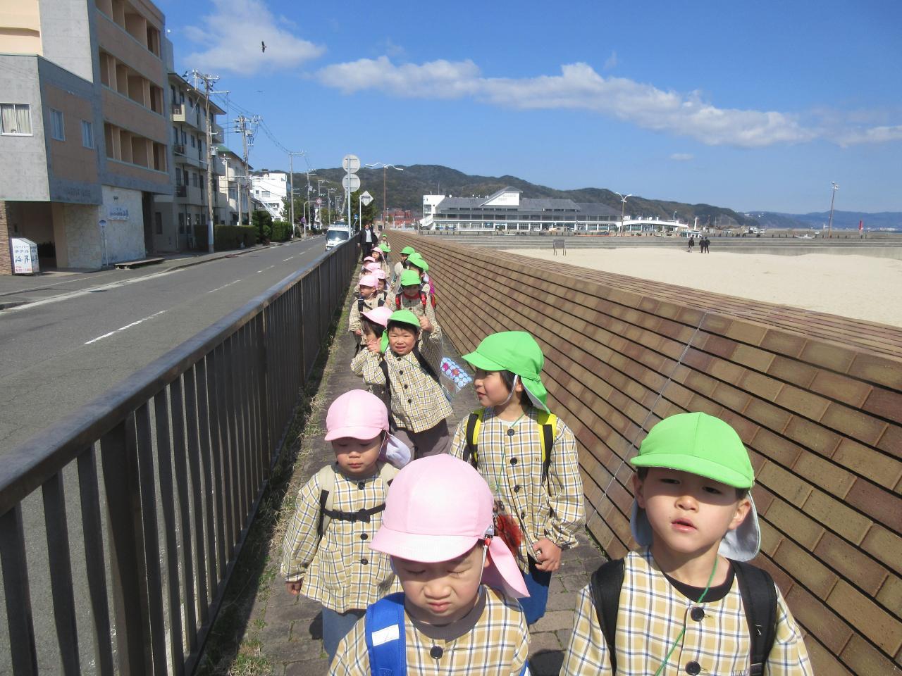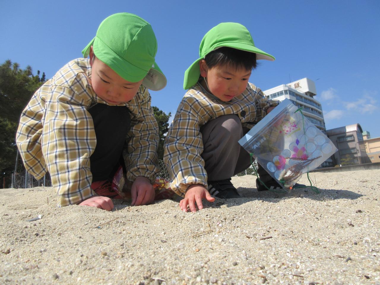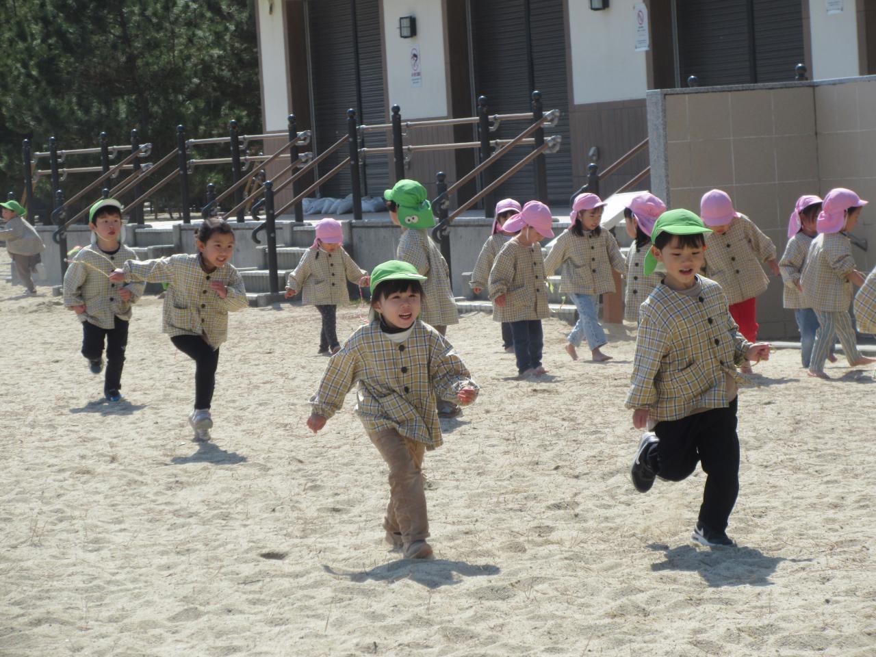 今日は、楽しみにしていたピクニックで大浜海岸へ行きました。うさぎ組のお友だちと手を繋ぎ会話を弾ませたり、優しく手を引いてあげながらウキウキとした様子で歩いていきました。着いてからは、みんなでしっぽ取りやリレーなどのゲームをし、その後それぞれ自由に好きな遊びを楽しみました。波と追いかけっこをしたり、貝殻や葉っぱを拾って昨日作ったお散歩バッグに集めたり、海に向かって叫んだりと広々とした砂浜で伸び伸びと遊んでいました。