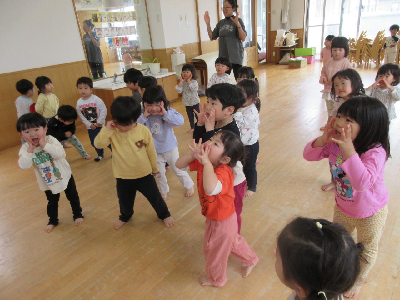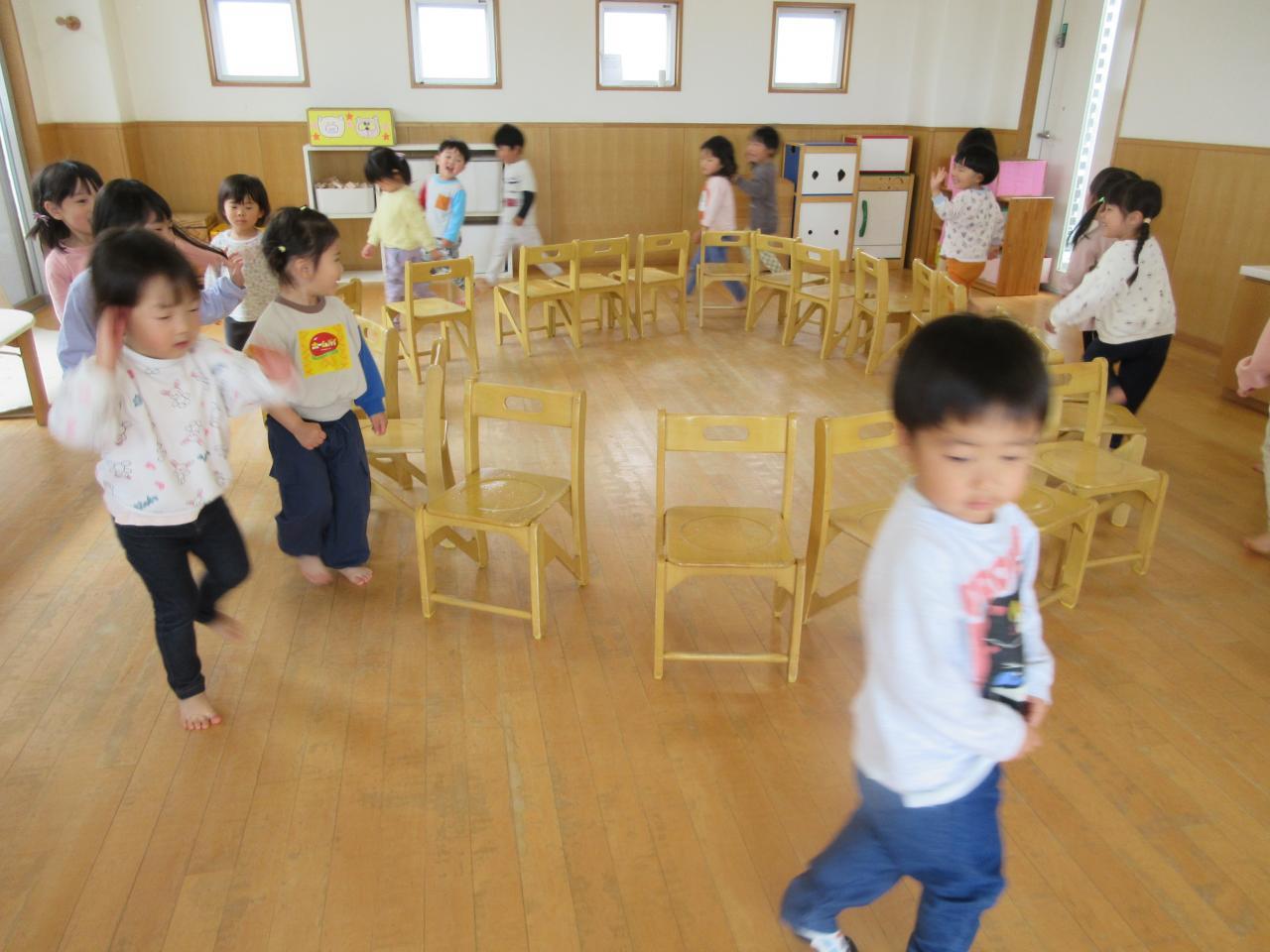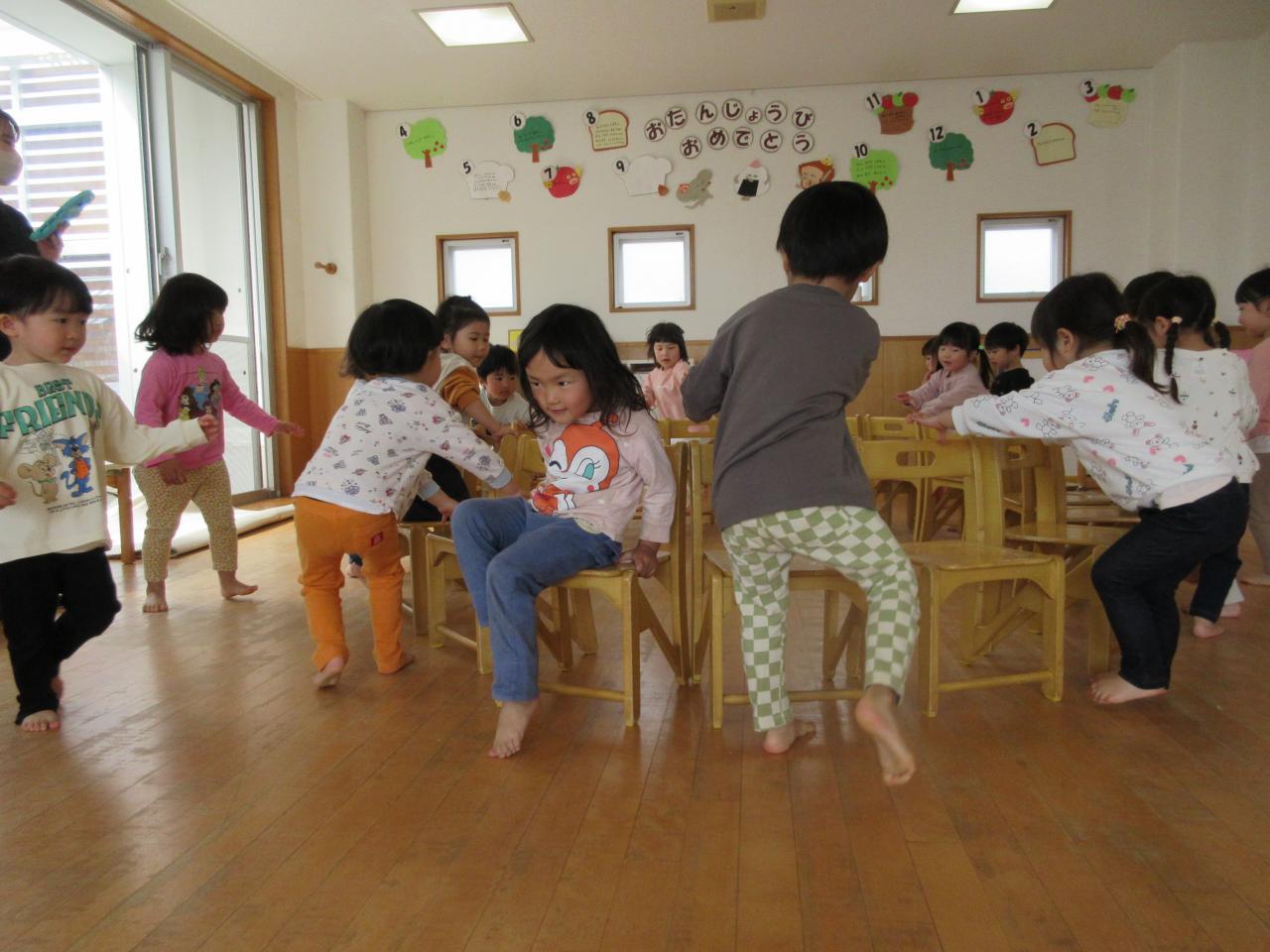 あいにくの雨で園庭には出ることができなかったですが、お部屋で椅子取りゲームをしたりダンスをしたりして過ごし、笑顔あふれる時間となりました。