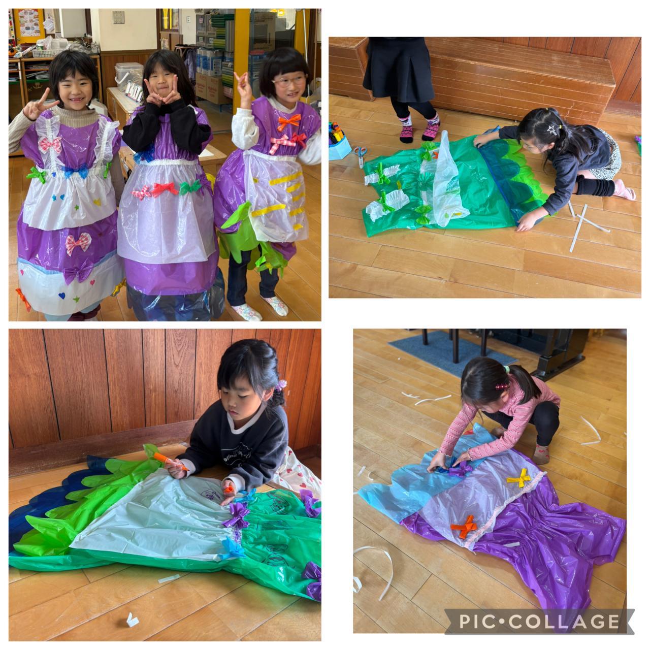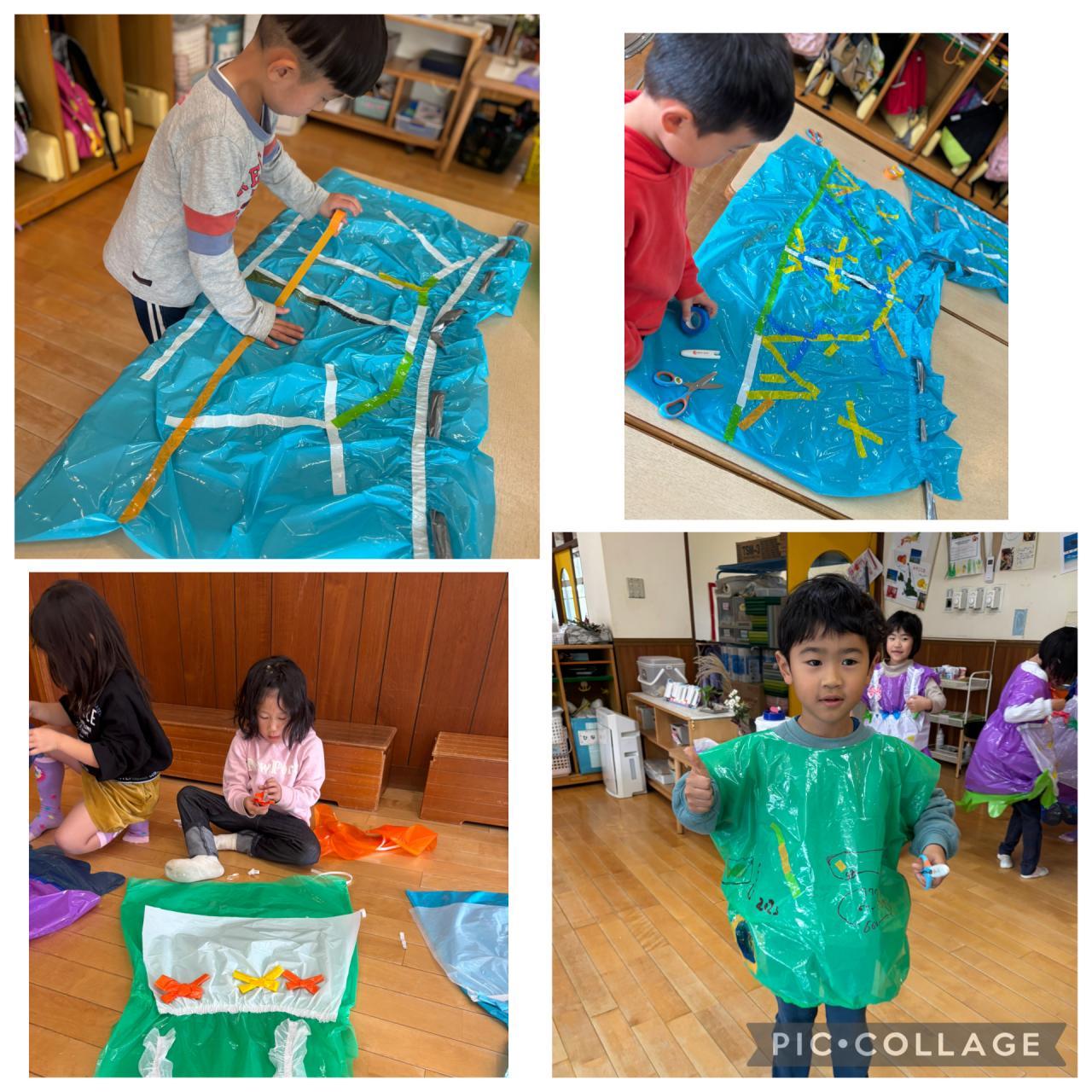 女の子はワンピースタイプがいいということ、男の子は短い服タイプ・マントタイプがいいということでペンで模様を描いたり、カラーテープで模様を描いたり、リボンをつけたり、ふりふりをつけたりと自分のしたいようにデザインしました。