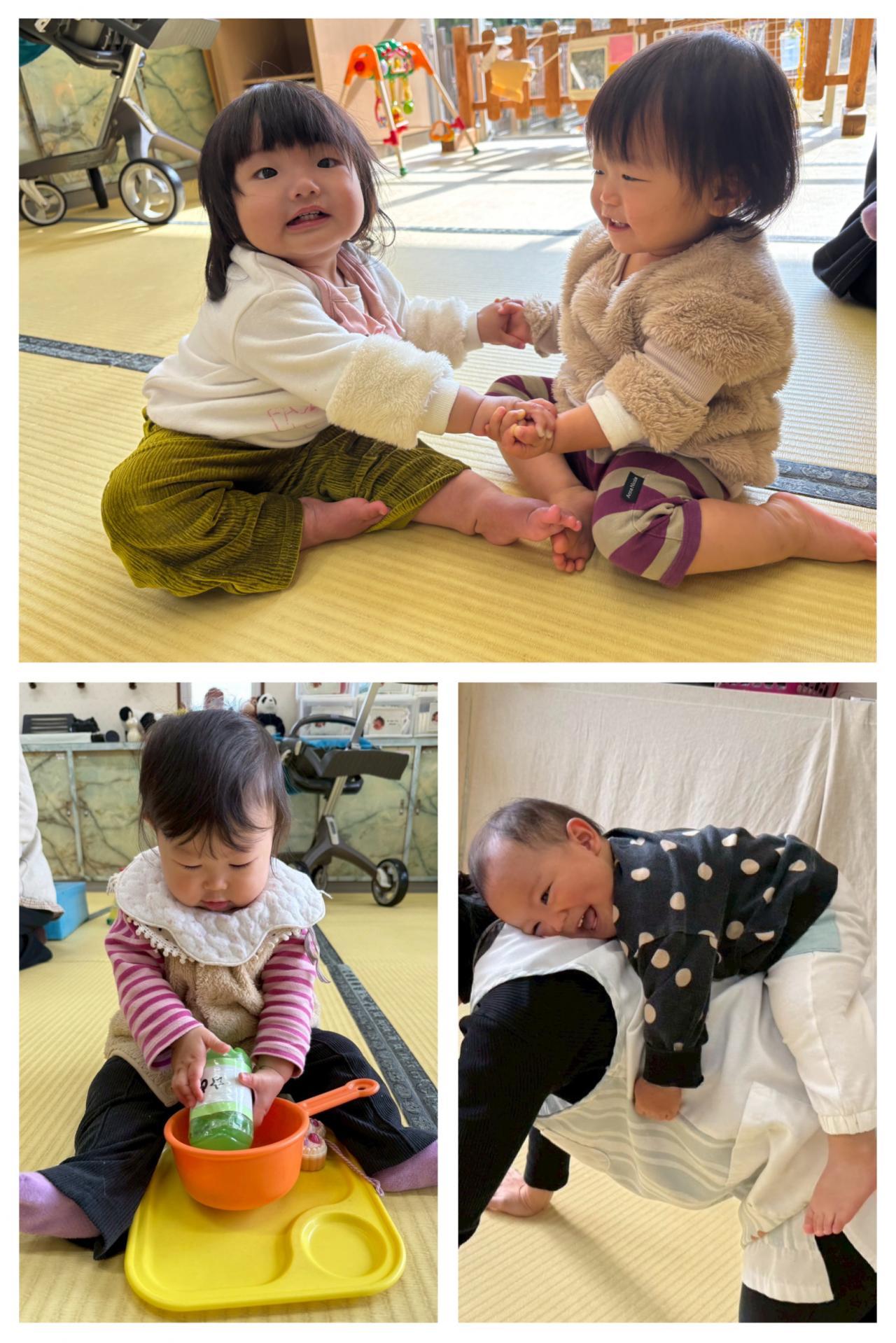 新島先生チームはお部屋でおままごとやリズム遊びをしました。手遊び『やさいのうた』を一緒にしてみたり、「どんぐりどんぐりコロコロ」と転がったり、「おふねがぎっちらこ」と友だちと手を繋いで歌に合わせてゆらゆら揺れたりすることを楽しみました。今日のリズム遊びや、今までしていたカエルの歌などは覚えていて歌が始まると自然に身体が動き出しリズム遊びを楽しんでいる様子でしたよ^^