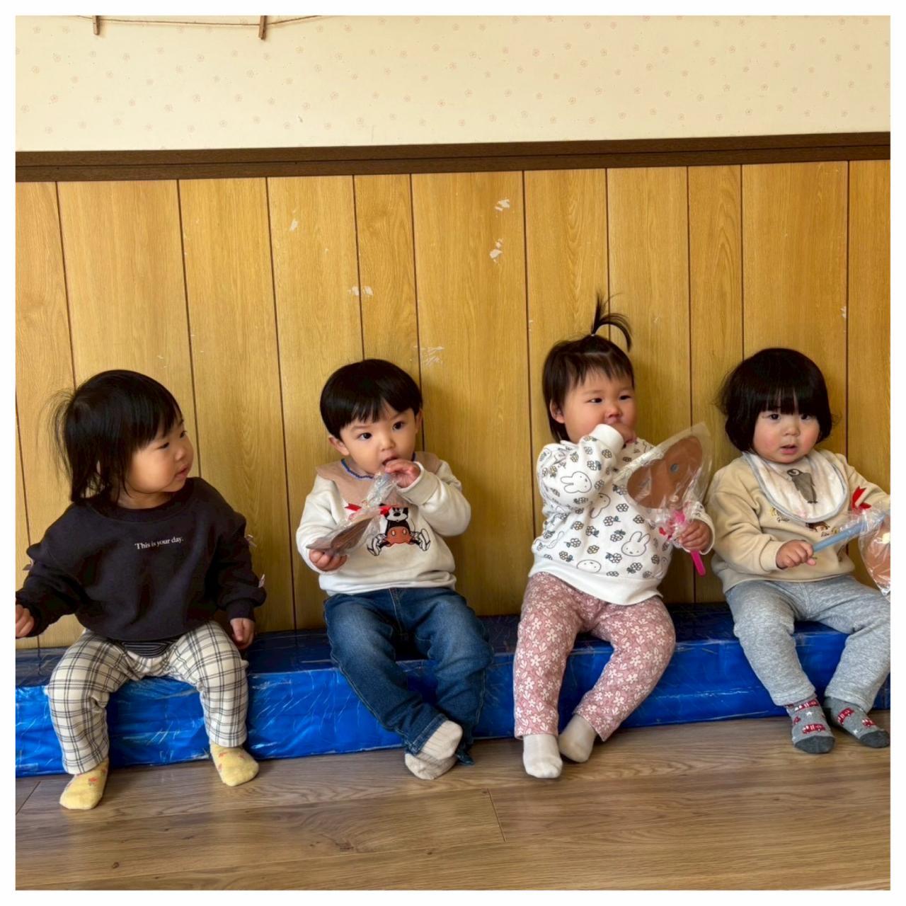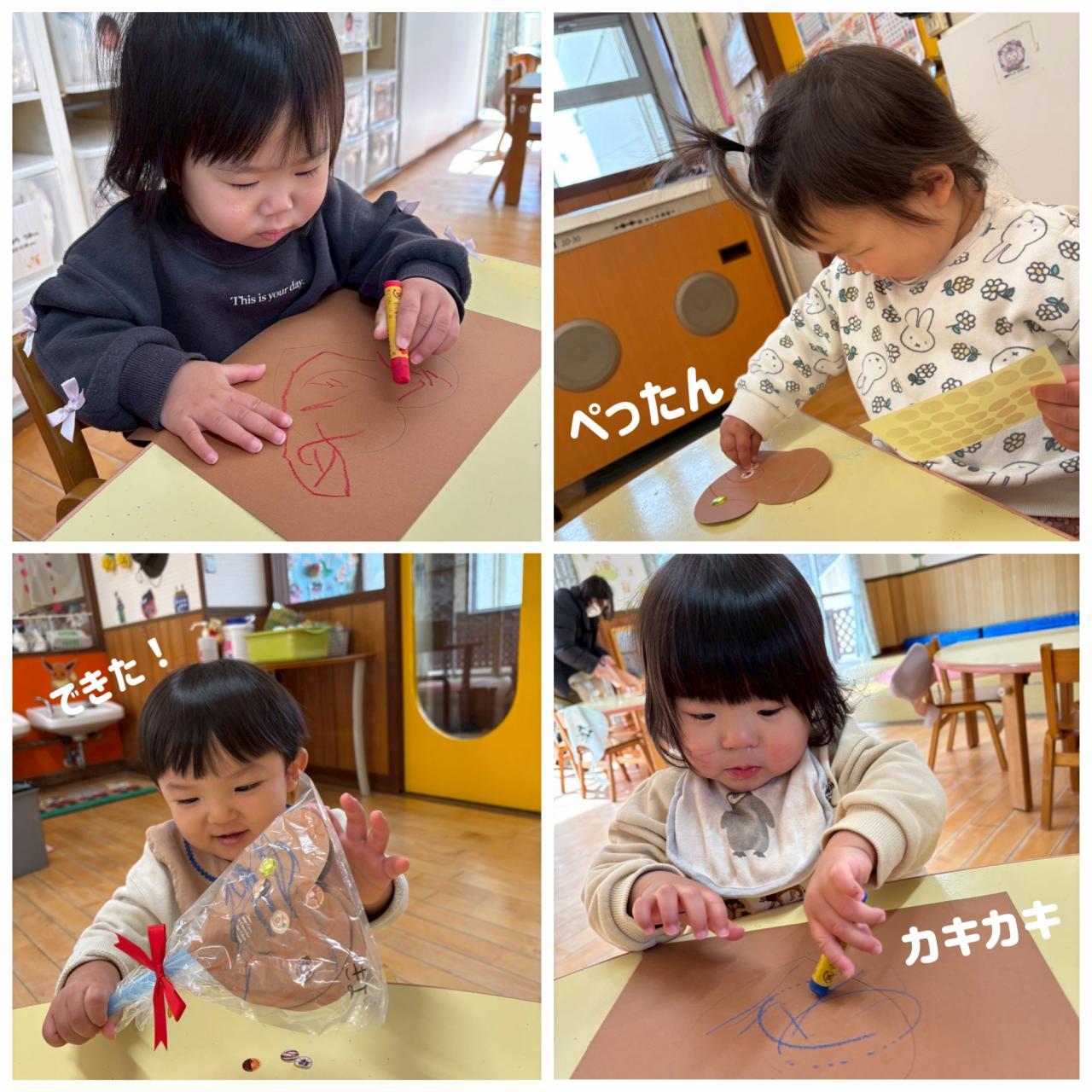 バレンタインのチョコ作り♡お絵描きやシール貼りをしました!ラッピングをしてみると嬉しい子どもたち。完成して「できたよー」と写真を撮りました。その後は、お雛さんを見たり、ふれあい遊びやリズム遊びをしました。音楽に合わせて手を叩き身体を揺らしたり、顔に手をあてたりして表現して楽しみました。