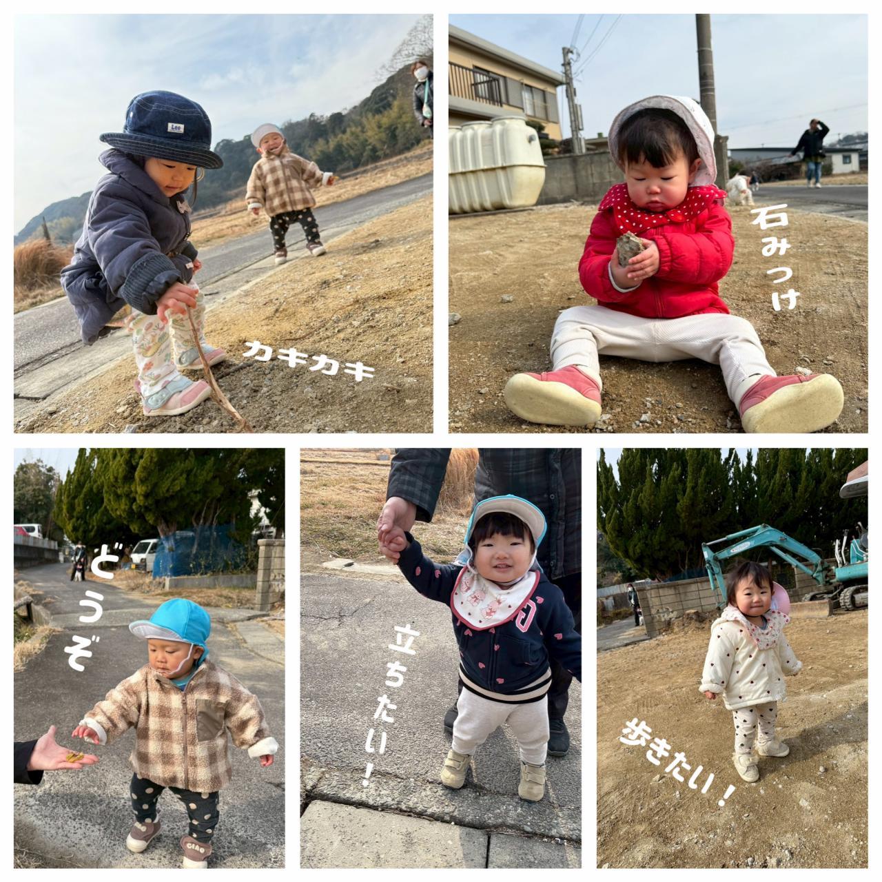 お散歩ではバギーを使わずに歩いて行きました。お友だちと手を繋いだり、保育者と手を繋いで一生懸命に歩いたり、目的地を超えてもっとたくさん歩きたかったりもっともっと歩きたい子どもたちの様子が見られましたよ。石を集めたりねこじゃらしや周辺の草花に触れたり、生えてる根っこを引っ張ったり探索をたのしんでいましたよ。