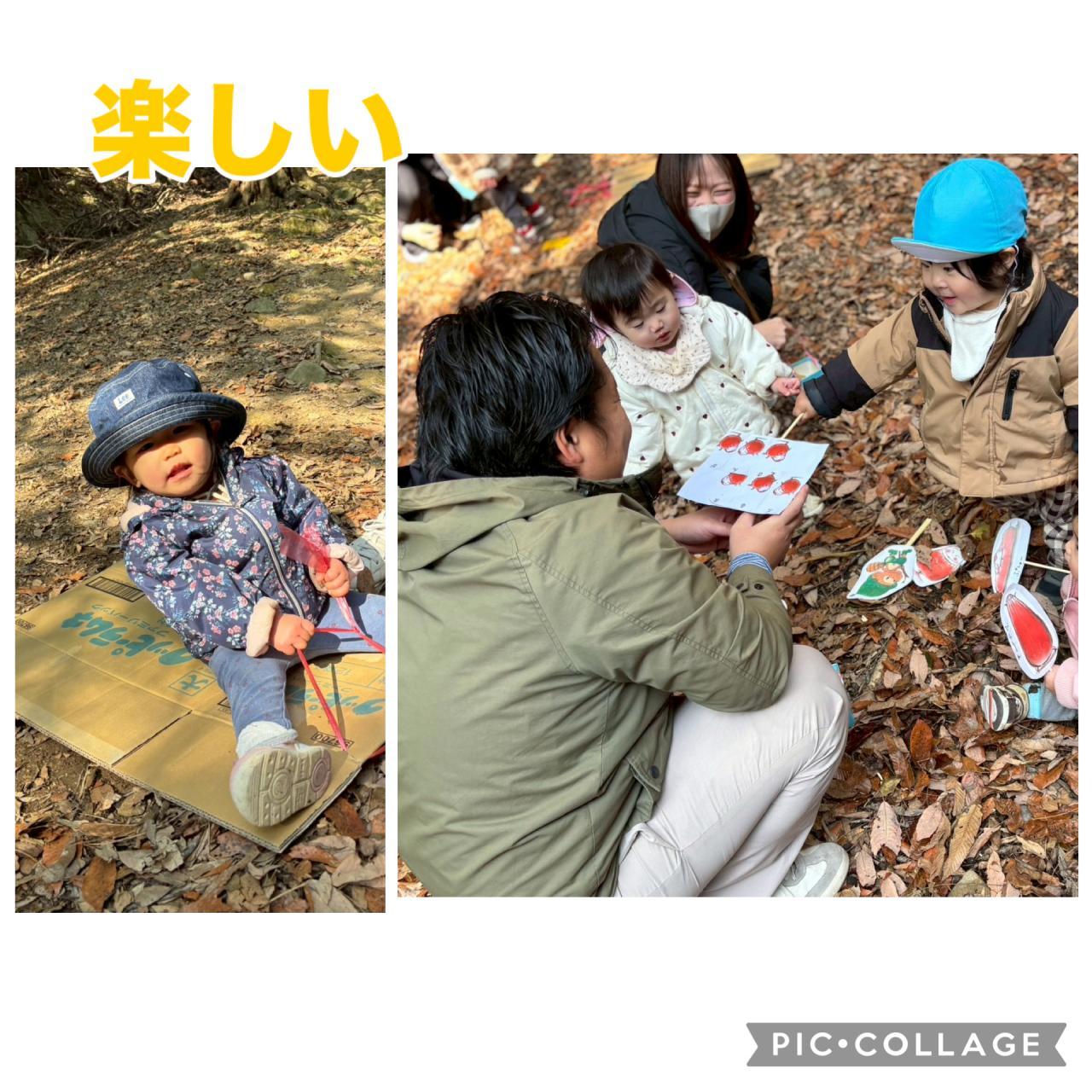 ラクーンくんやラクールちゃんのペープサートもしてみると、「どこだろう」とキョロキョロして探してみたり、その後はどんぐりを見つけたり落ち葉シャワーをしたりソリに乗って滑り台をしたりと、笑顔いっぱいのもも組さんでした♡