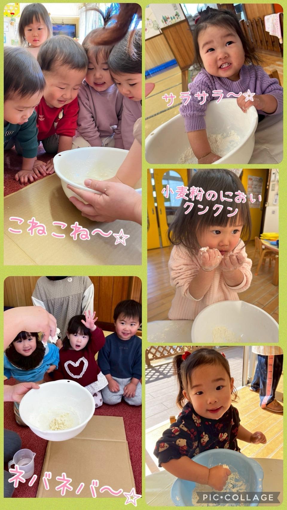 ※小麦粉粘土遊びを楽しむ中で、衣服に小麦粉が付着しています。お手数をおかけしますが、お洗濯をお願いいたします。