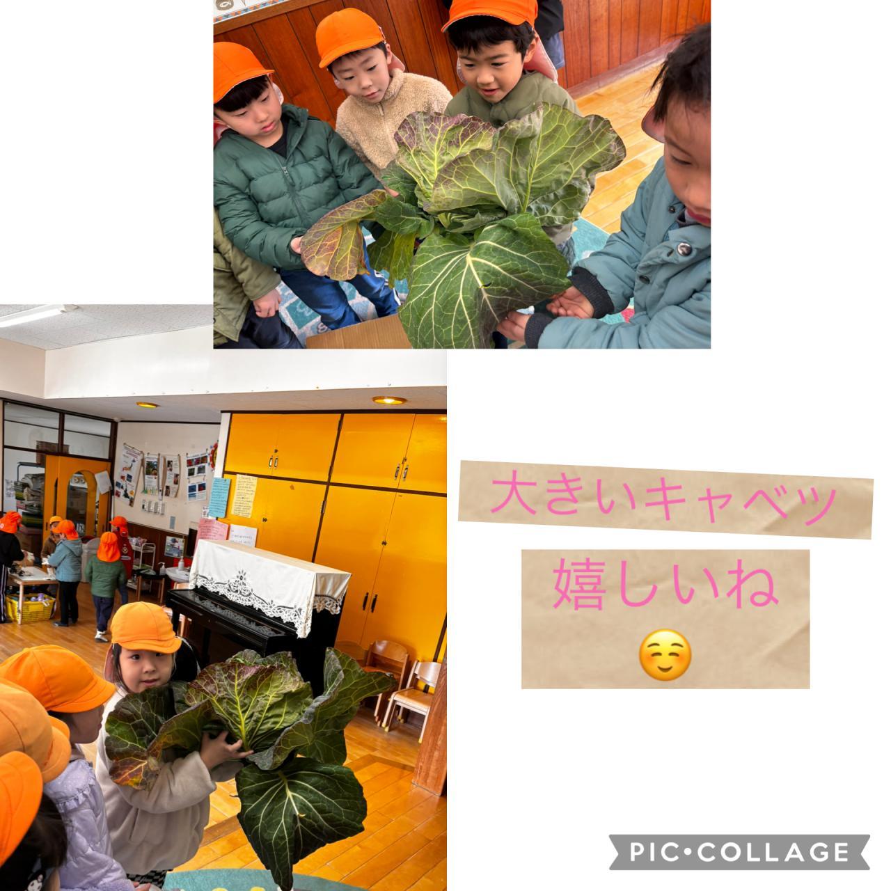 みんなの植えたキャベツが大きくなり、収穫の時期を迎えています。大きなキャベツにビックリでした⭐️