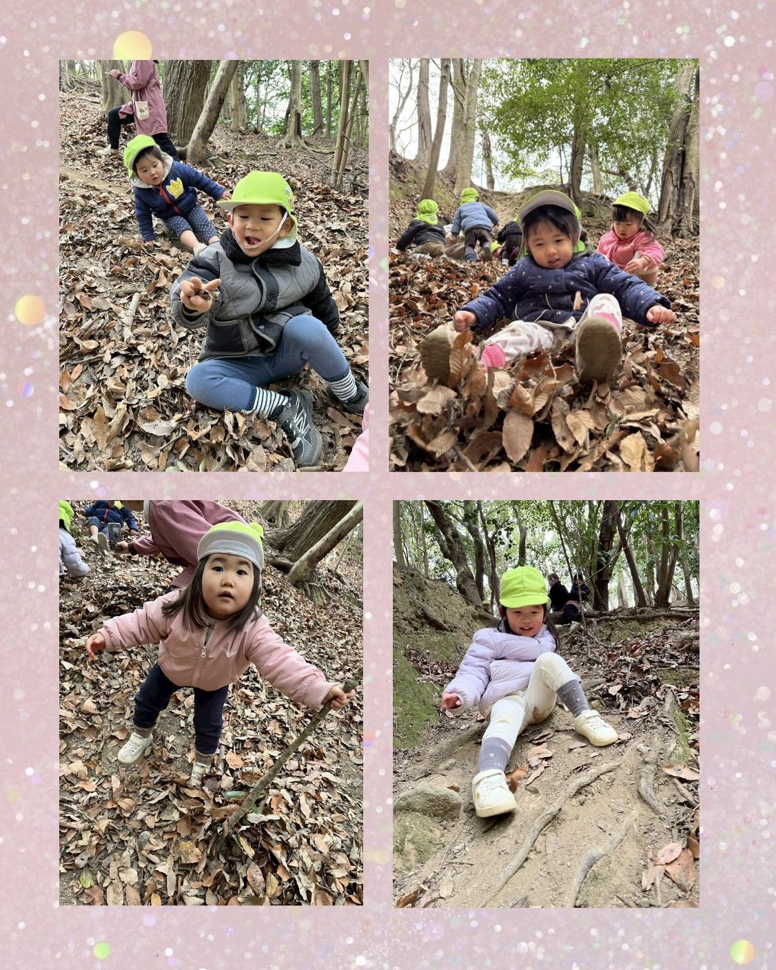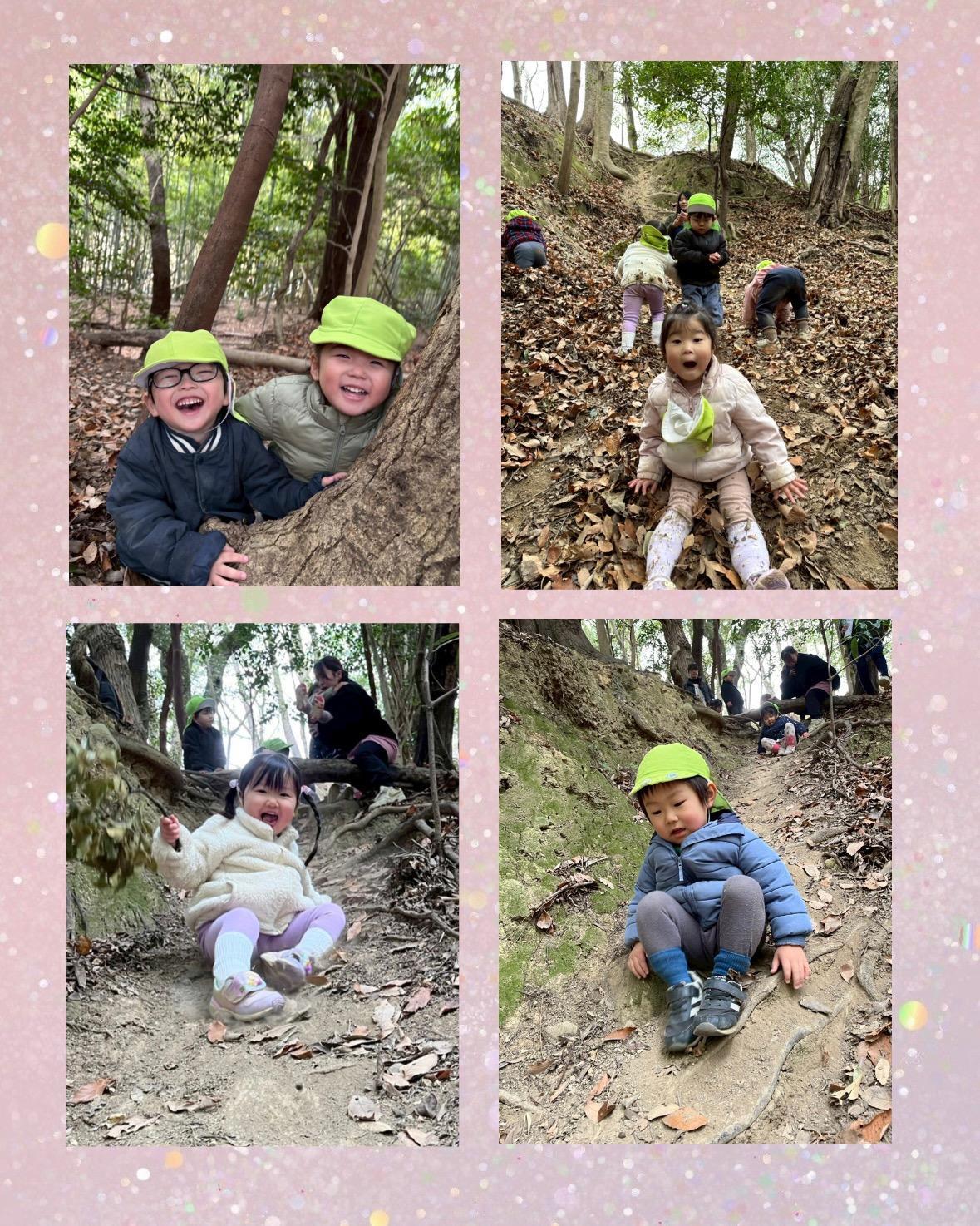 まずは『だるまダディーとゆかいなかぞく』を読みました。絵本ではだるま家族が崖登りをしていたので、さくらさんも大好きな崖登りに挑戦!緩やかな崖は全員が登ることができました☺︎その後は、少し急な崖に挑戦する子やかくれんぼをする子に分かれて、思いきり楽しみましたよ(^^)