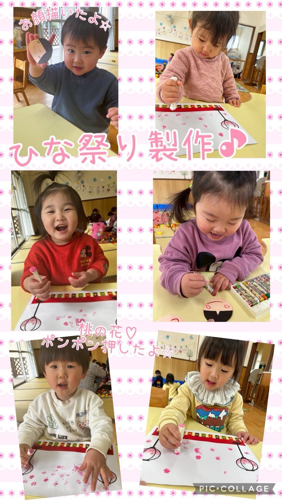 今日は、ひなまつりの製作をしました。綿棒を花型にしてももの花をスタンプ。平行に押したり、力加減をしたり考えながら押し、きれいな花模様に子ども達も満足そうでした。お雛様の顔も「この色にする」と色を選んだり、思うところにパーツを描いたり、個性あるお雛様が出来上がりました。1年間を通して色々な経験をしてきたので今日は、みんな自分で‼︎という気持ちも強くやりたい気持ちを大切にして楽しむ様子を見守りました。また出来上がり楽しみにしていて下さいね♪