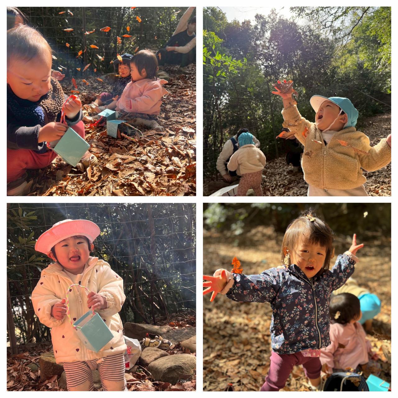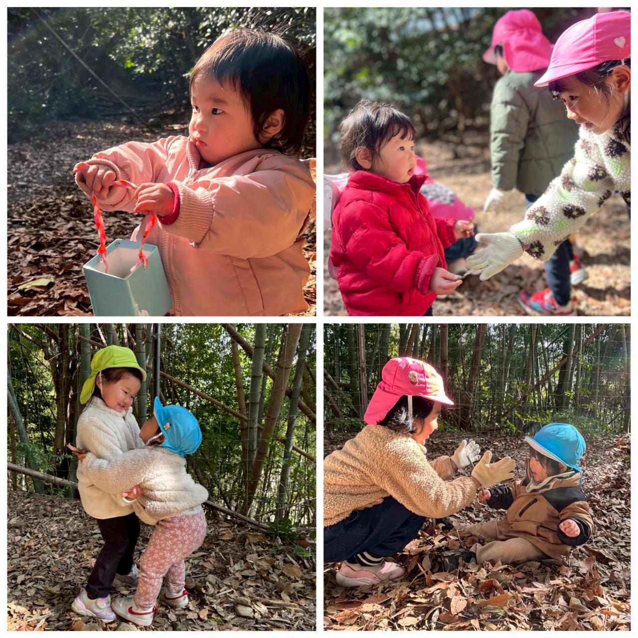 今日はみんなでどんぐり山へ行きました。歩けるお友だちはでこぼこ不安定なところもどんぐりや枝や石を拾う余裕も見せながらズンズン歩いて行っていましたよ。落ち葉がたくさんあるから「ぱっぱ」と言い葉っぱを示したり、空を見上げて葉っぱから差し込む日差しを観察したり、葉っぱにも興味津々。坂道になっている所も四つ這いになり横歩きで進んだり、降りるときはお尻をつけて降りようとしたり、危険!ということがわかることに驚きでした。葉っぱのシャワーをして喜んだり、保育者と葉っぱに足を埋めて「足いないいない」と遊んでいる子をみて真似をして落ち葉で自分の足を埋めてみたりよく聞いて、見て、考えて遊んでいました。