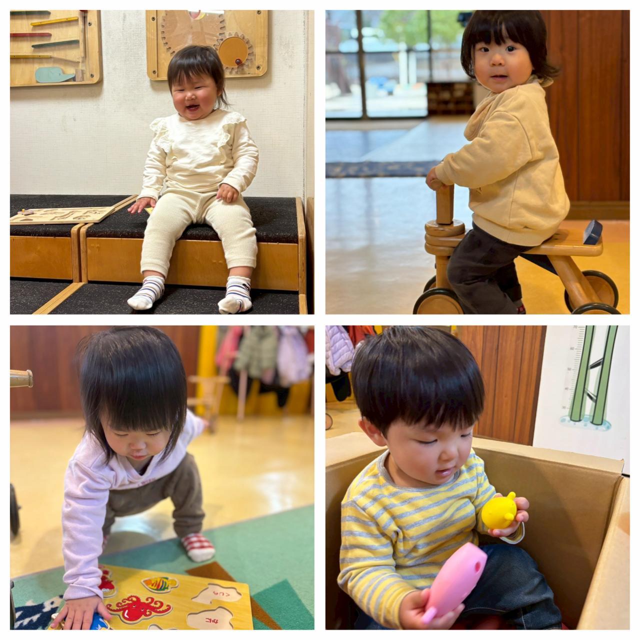 正井先生チームは廊下で三輪車や玩具で遊びましたよ。保育者と一緒に型はめにも挑戦。「ここ?」と聞きながら「できた」と言い、喜びながら楽しみました。三輪車で身体を動かしたり、好きな絵本を手に取り見たりのびのびと楽しみました。