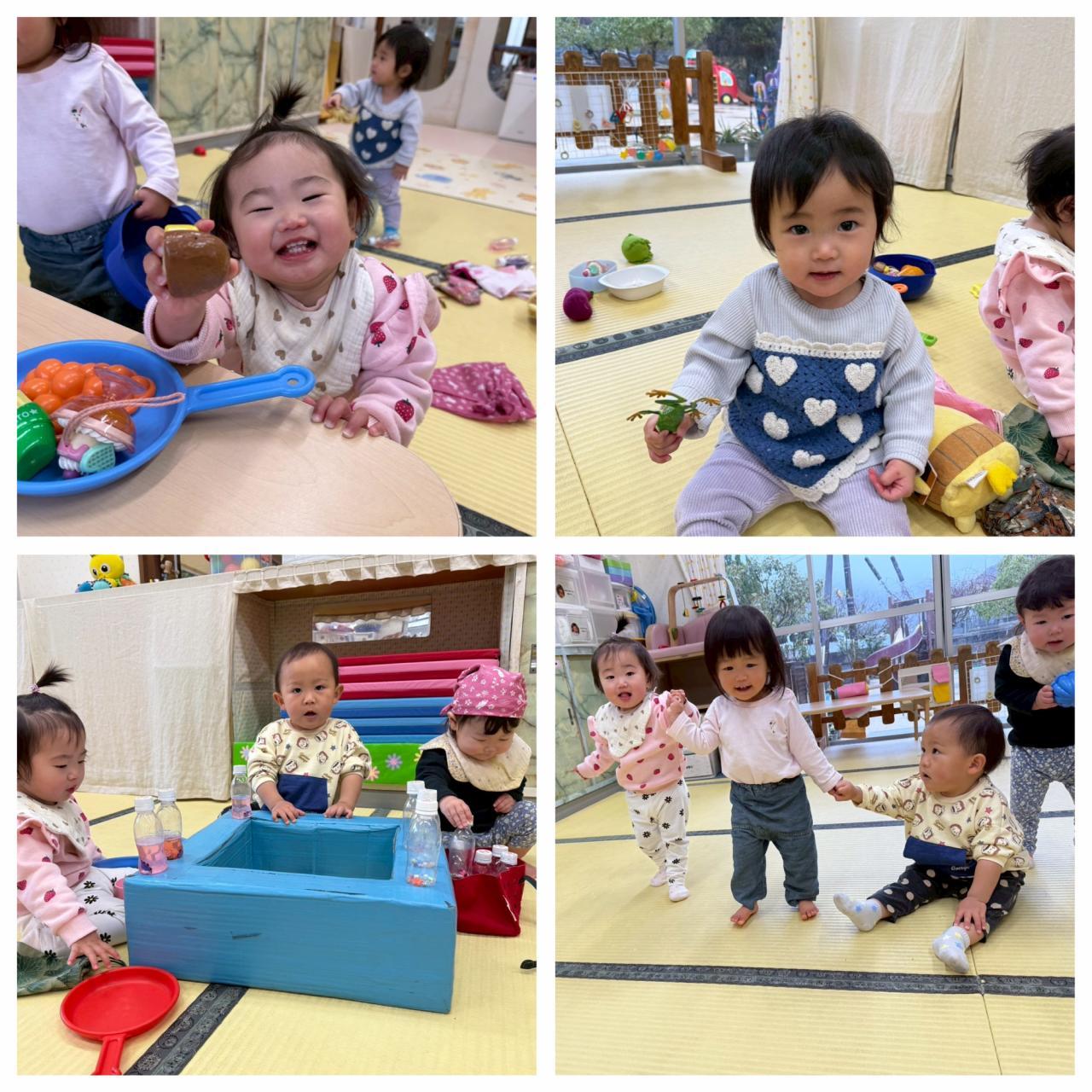 今日は久しぶりの恵みの雨ですね。今日はお部屋ですごしました。新島先生チームはおままごとをしました。テーブルを用意すると食器やフライパンに食材を乗せて料理する子どもたち^^お友だちの遊んでるものが欲しくなるので友だちと「かーしーて」を練習しながら一緒に遊びましたよ。リズム遊びではピアノの音を聴くとこの動き!と曲に合わせて身体を動かしました。リズム遊びでも友だちと関わるのが楽しいようです^^