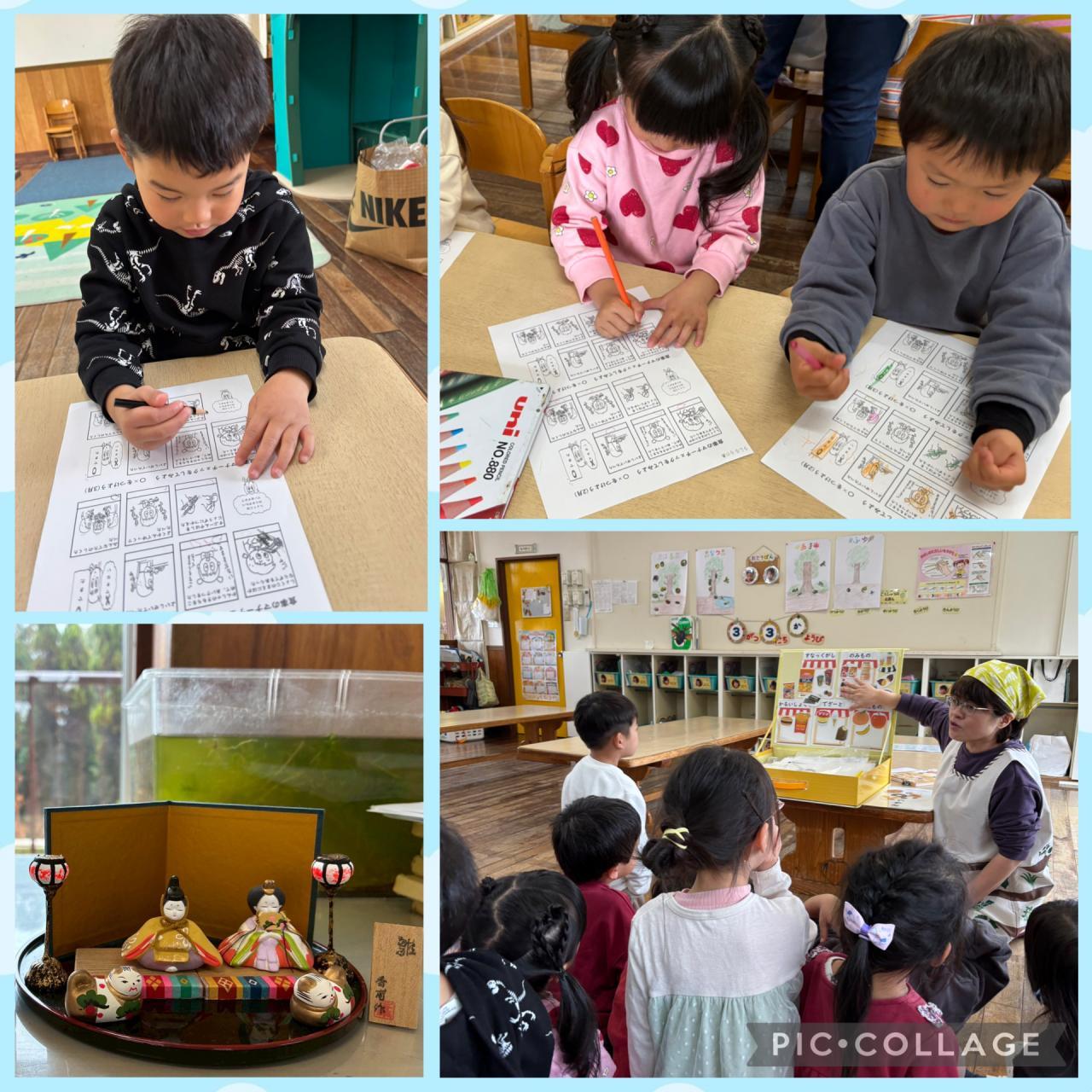まずは、ひなまつりやおやつについてのお話を聞きました。おやつは、スナック菓子やケーキ、ジュースなどの甘いお菓子よりも果物や野菜、ヨーグルトや牛乳などの栄養のあるものが良いと教えてもらいました。「ジュースすきやけどな〜」「ポテトチップスはちょっとだけにする」などと普段みんなが食べているおやつの種類や量を思い出しながらお話していました😌
