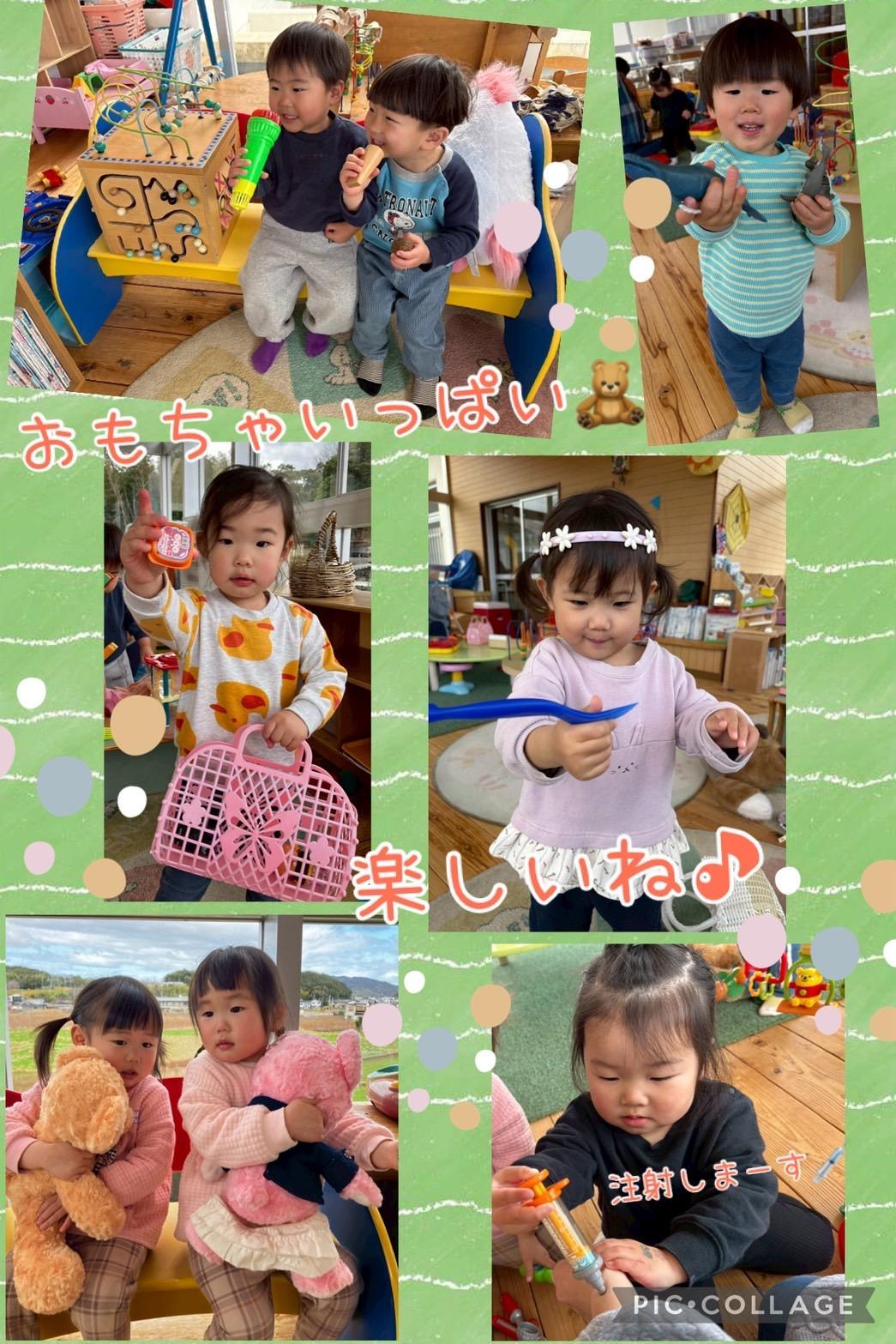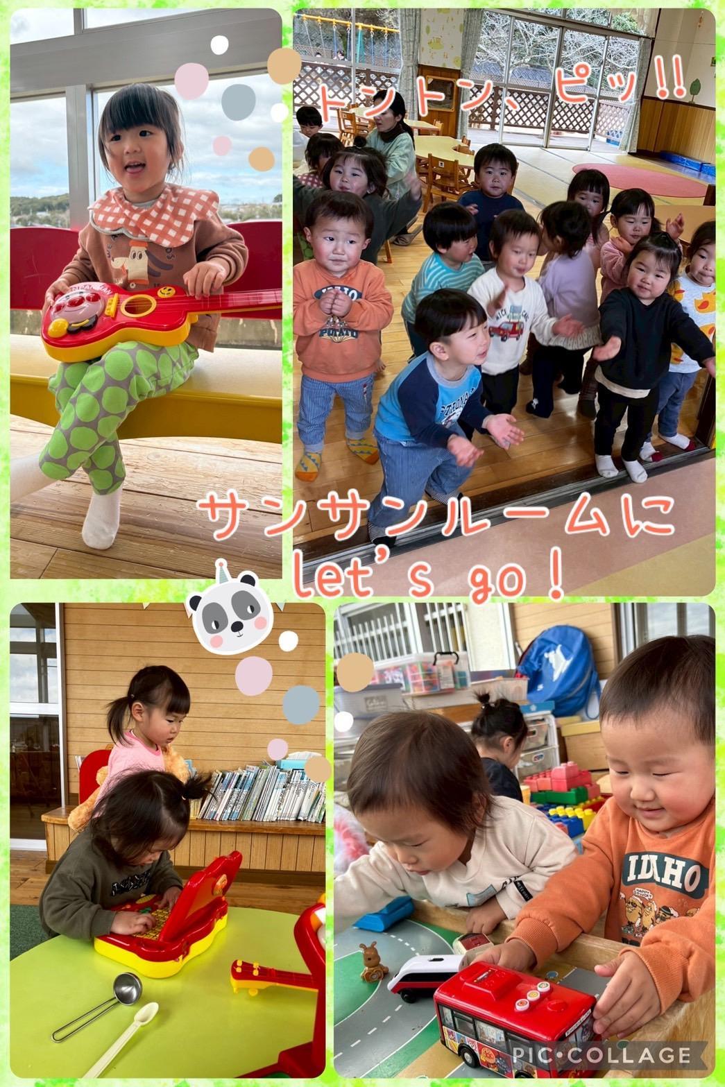今日は、ぽかぽか陽気の中、サンサンルームで遊びました。「かしてー」「いいよ〜」「いっしょにあそぼう☺︎」と声をかけ合いながら、友だちと誘い合って遊ぶ姿が見られるようになってきました。