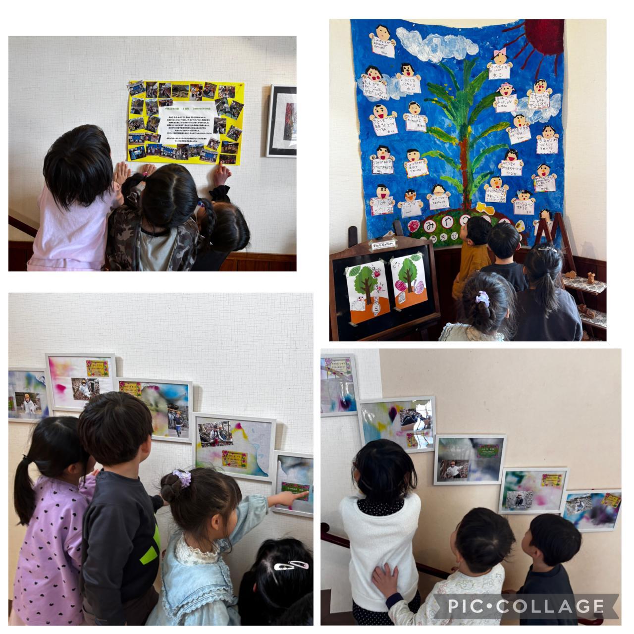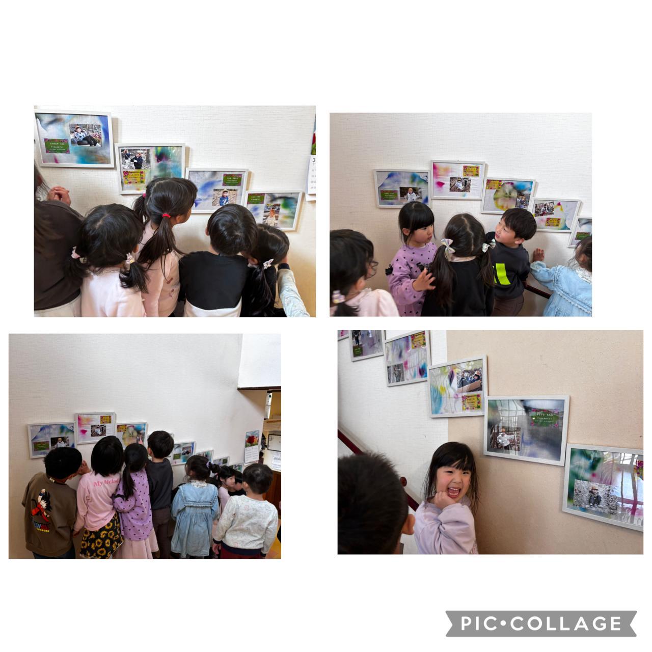 階段に卒園記念の絵と写真が貼られました♪絵はみんなで描いたサトウキビと