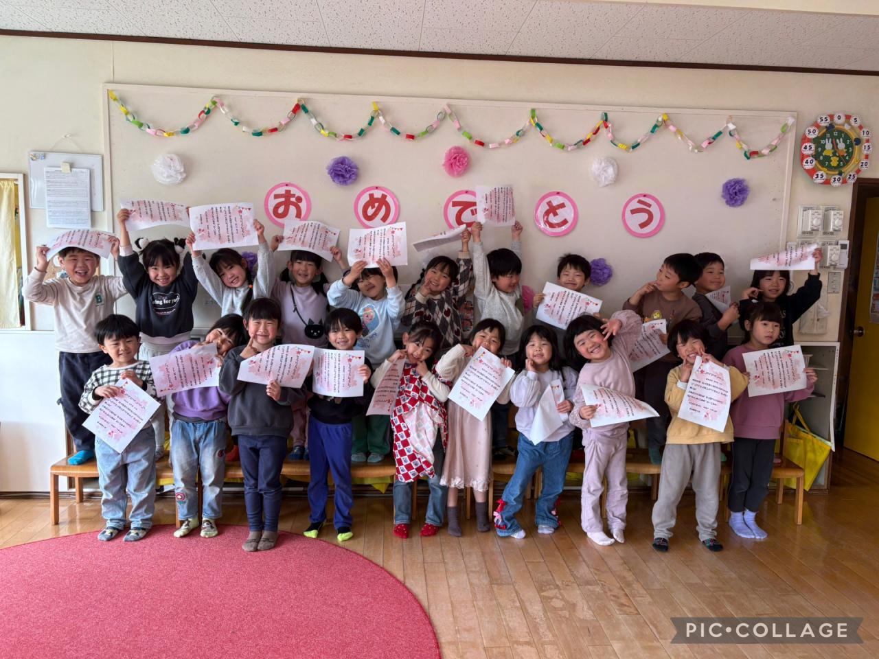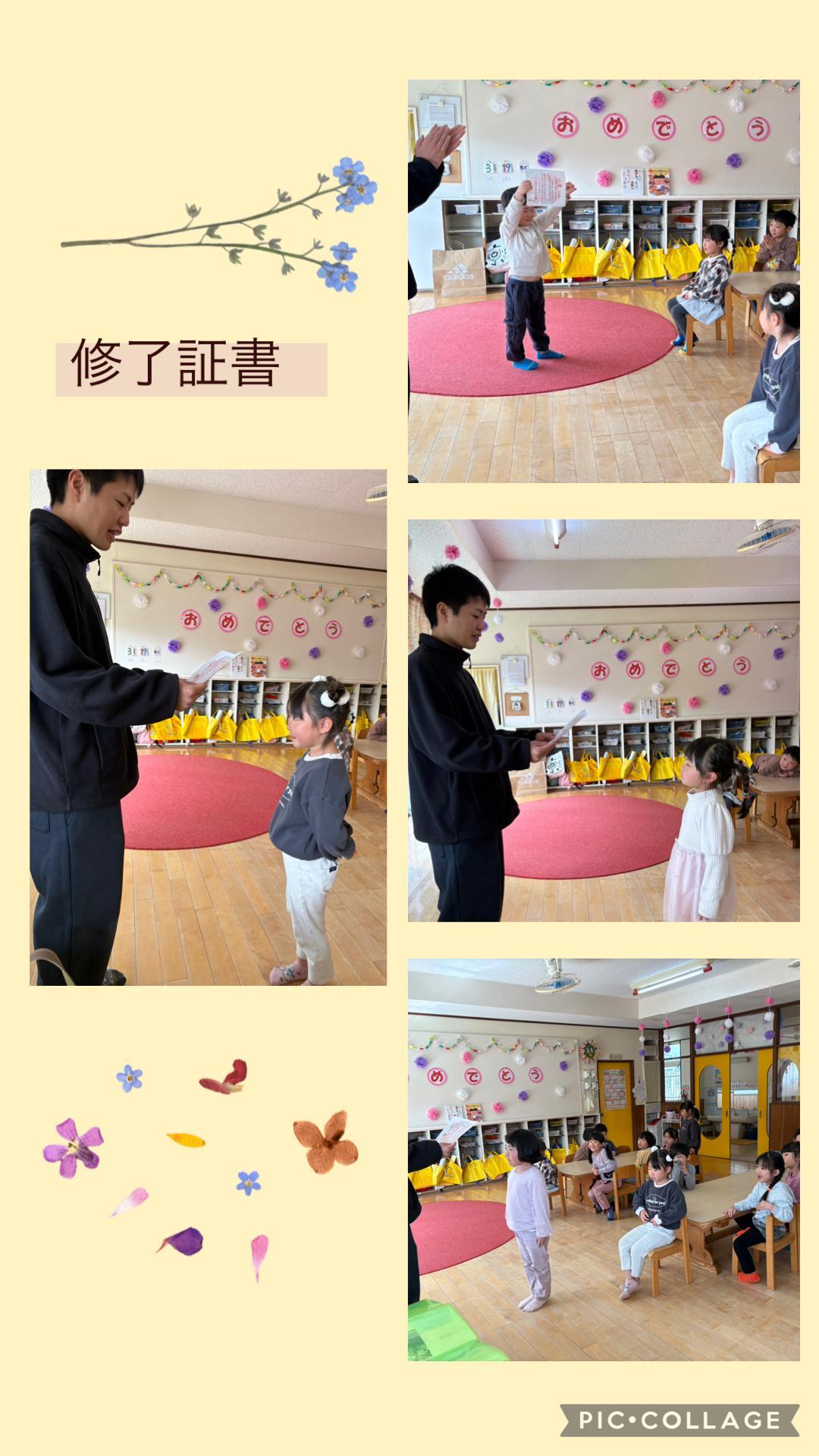 最後に修了証書を渡しました。ひまわりさんのように名前を呼ばれると元気に返事をしたり礼をして証書をもらうことができました。とってもかっこよかったですよ!