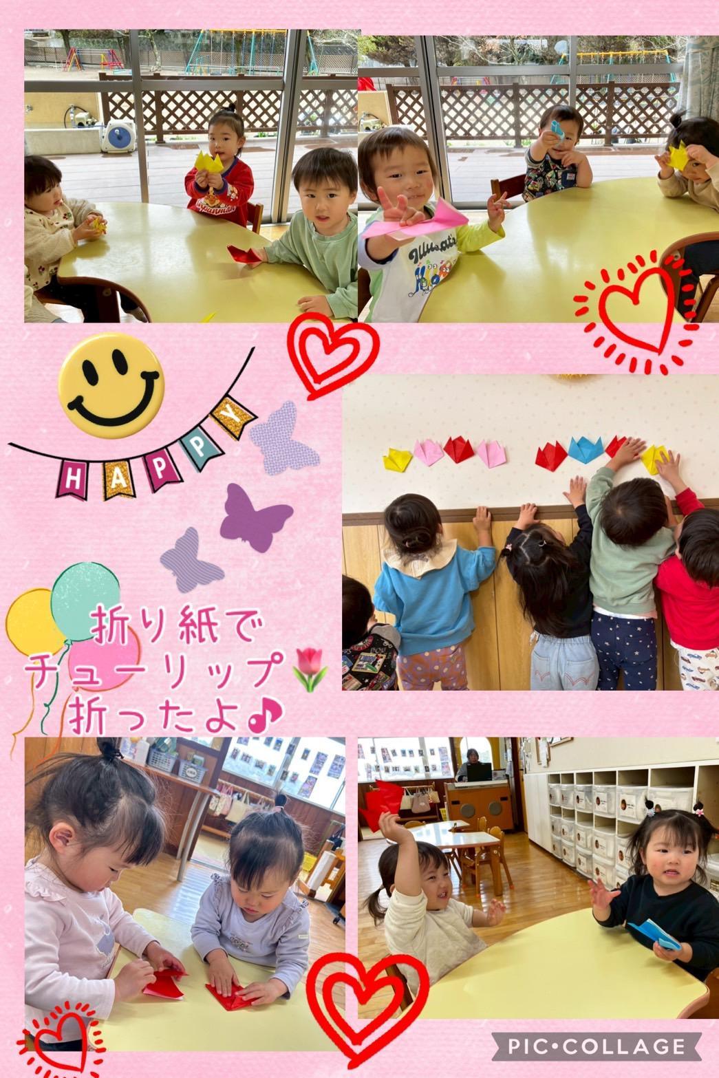 ちゅうりっぷの折り紙も保育者と一緒に作り、「見て〜!」と嬉しそうに見せてくれる姿がとても可愛らしかったです。自分たちで壁に飾ると、「ちゅうりっぷ」の歌を口ずさみながら楽しんでいました🌷