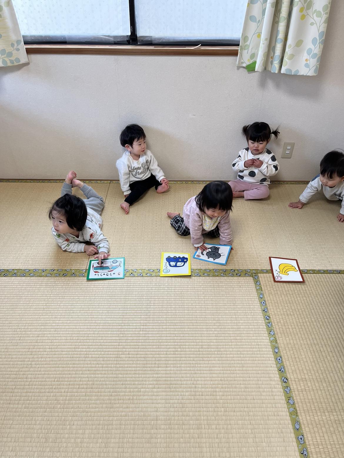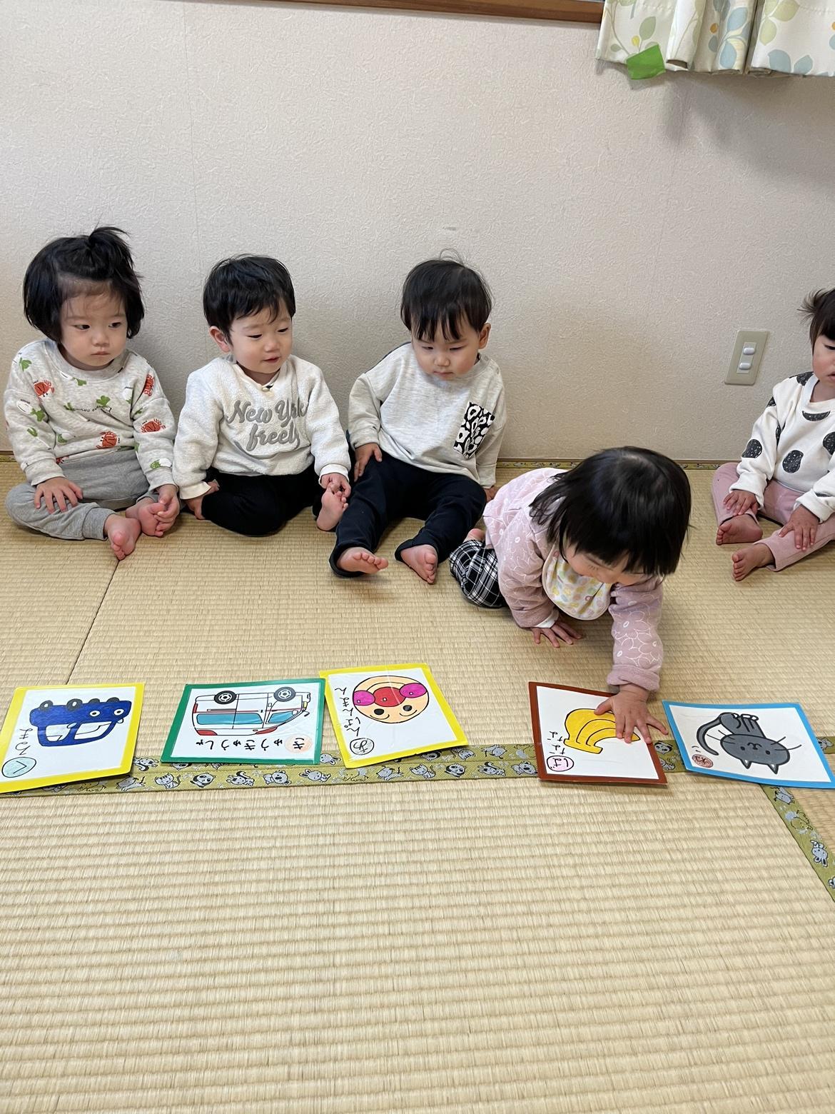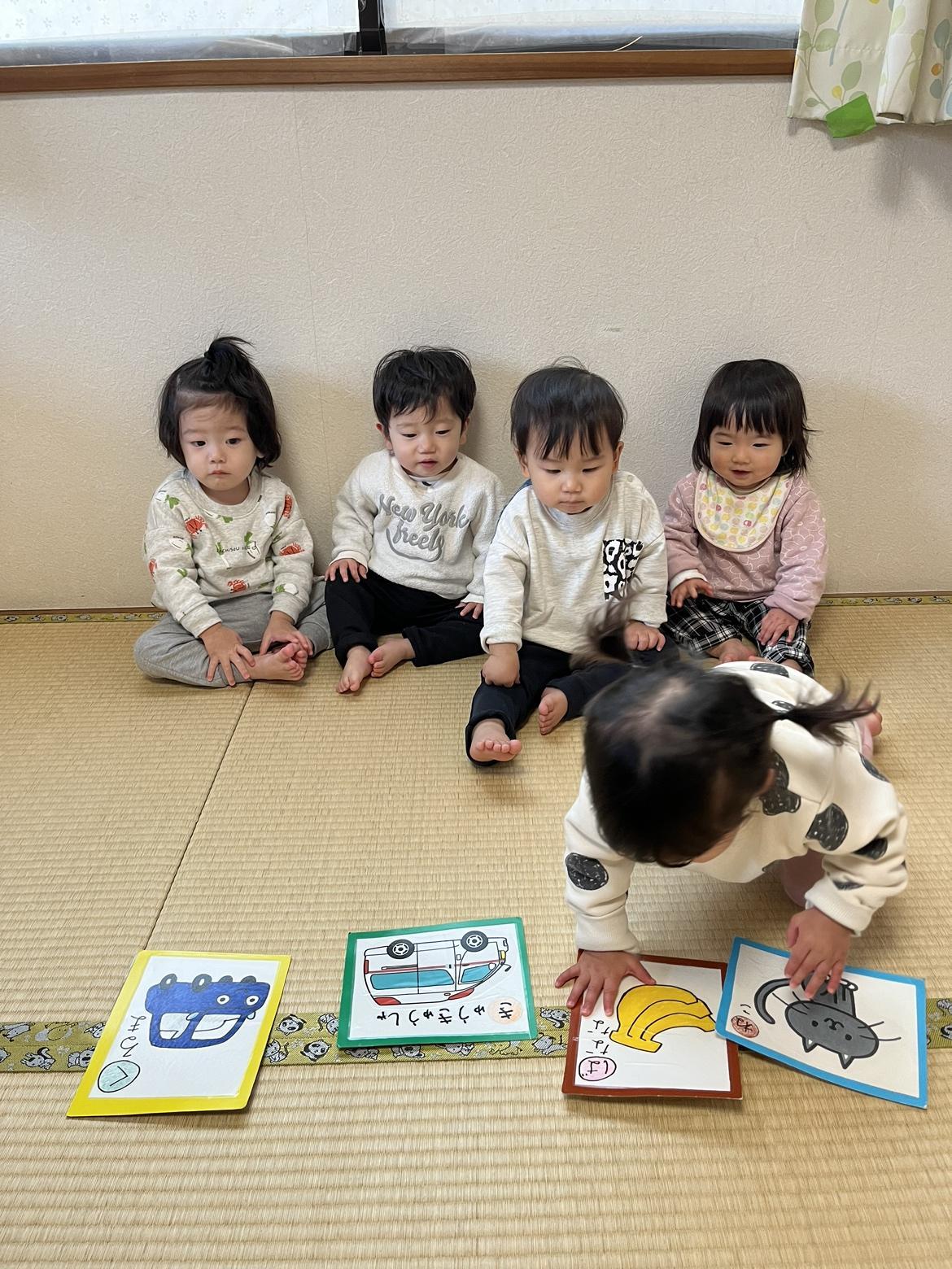 保育園での生活リズムにも慣れ、天気の強い日は園庭やベランダで「1・2」「1・2」とマラソンをしたり、室内ではぞうさん、アンパンマン、バナナなどの絵かるたを作り、名前を覚えたり、読み上げてくれるのをじっと待って「アンパンマンはどこだ」と言うと取りに行ったりと、待つことや言葉を理解し、声かけを理解して行動ができたりとみんなで一緒に遊べるようになりました。
