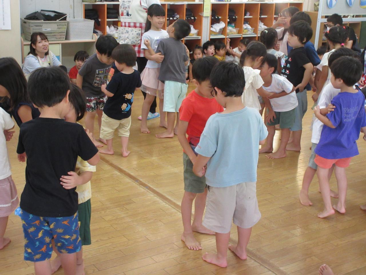 異年齢でのふれあい遊びでは二人組になり、先生の言う体の一部をくっつけようとし、バランスをくずす様子が見られました。来月の誕生会もお楽しみに!