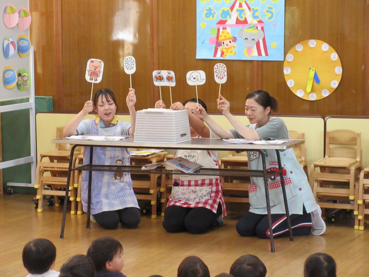 ペープサート『おばけちゃんの夏祭り』は夜店の食べ物や遊びを聞くと「かき氷!」「射的!」などの答えが返ってきました。もうみん夏祭りに行ったのかな?