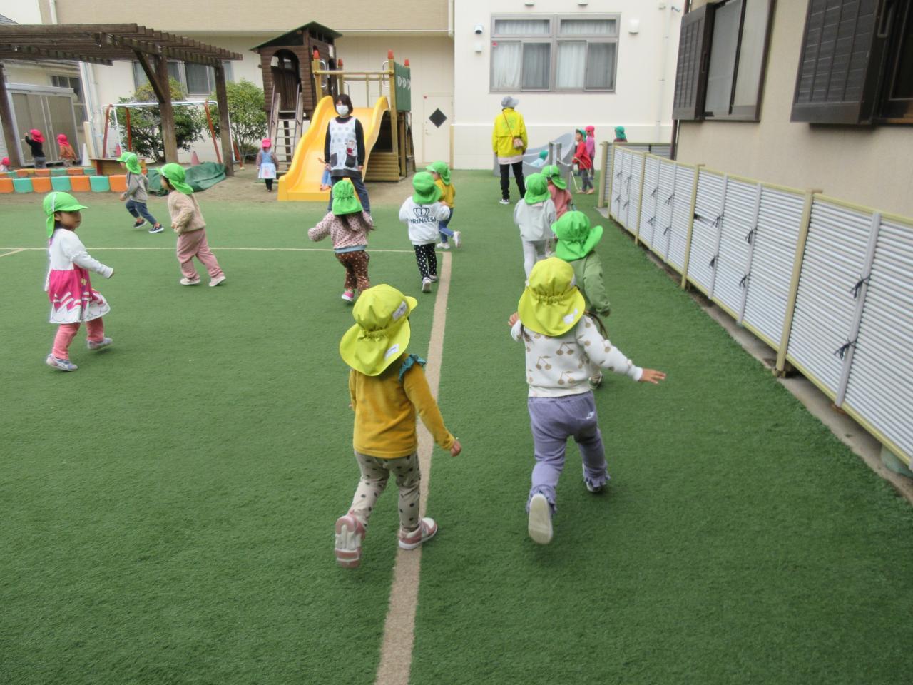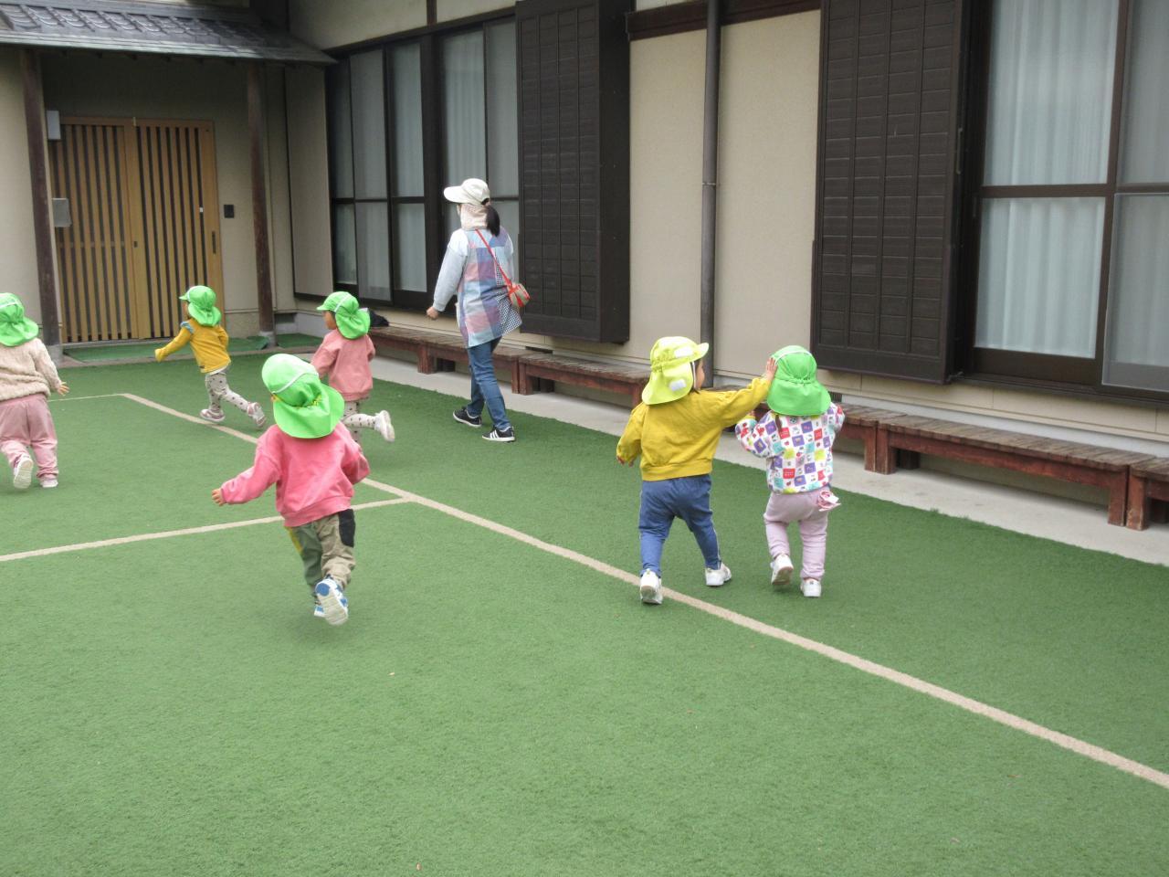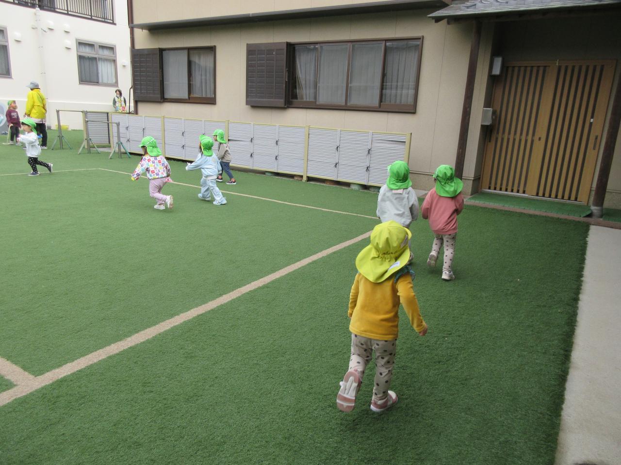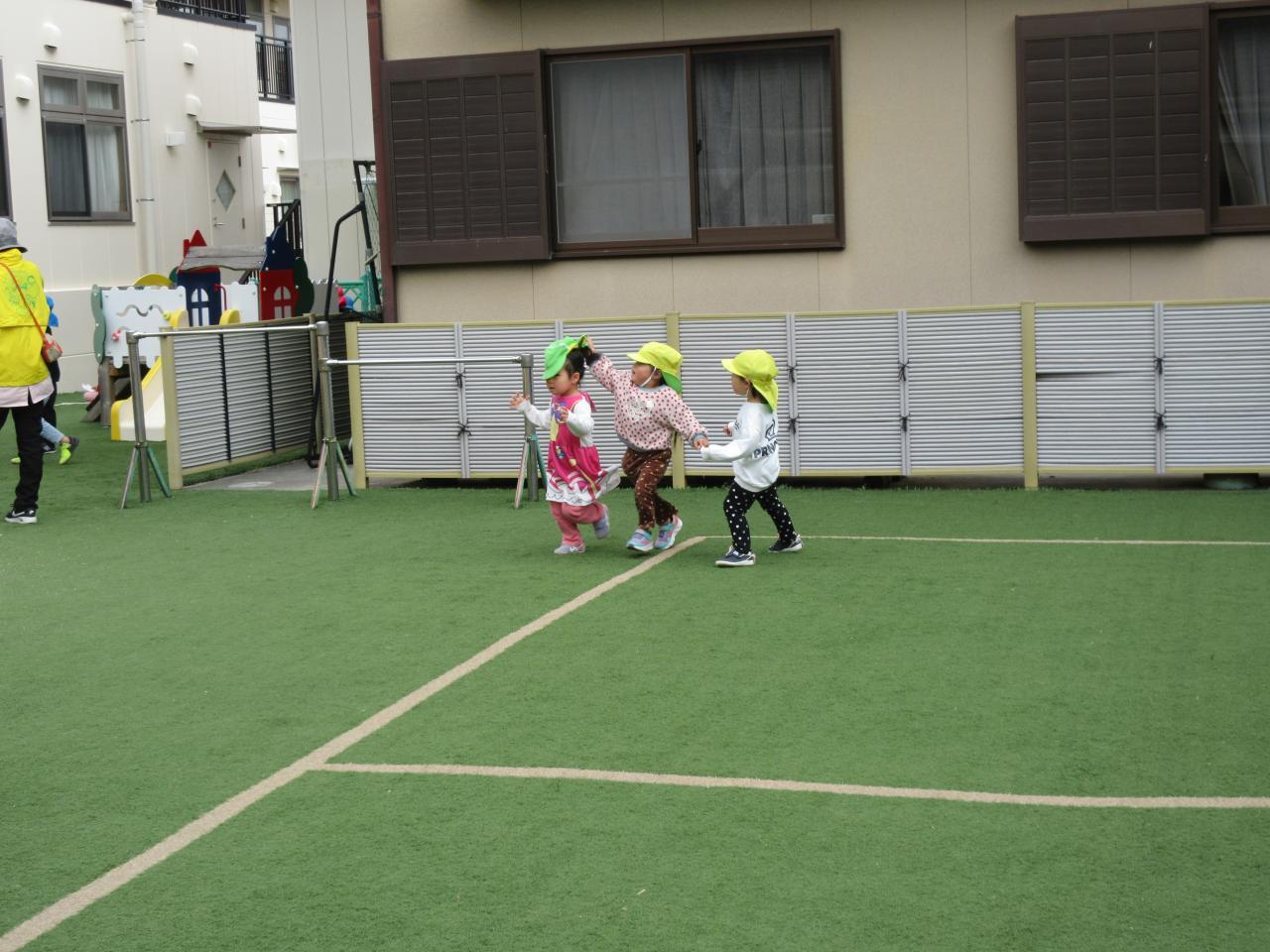 12月から鬼ごっこに向けて‟むっくり熊さん„をはじめました。くまのお面をかぶった保育者が鬼になり、子ども達は捕まらないように「キャ~」と逃げるのを楽しんでいました。ルールがわかってくると子ども達が鬼になって‟タッチ鬼ごっこ„をみんなでするようになりました。‟タッチされると椅子に座る„‟鬼は帽子を黄色にする„など決められたルールに加え、‟タッチされても怒らない„‟こけても泣かない„と子供たちなりのルールも増えてきています。みんな最後まで一生懸命走っています。体力もついてきたかな?次は帽子とりやしっぽとりに挑戦していきたいと思います。