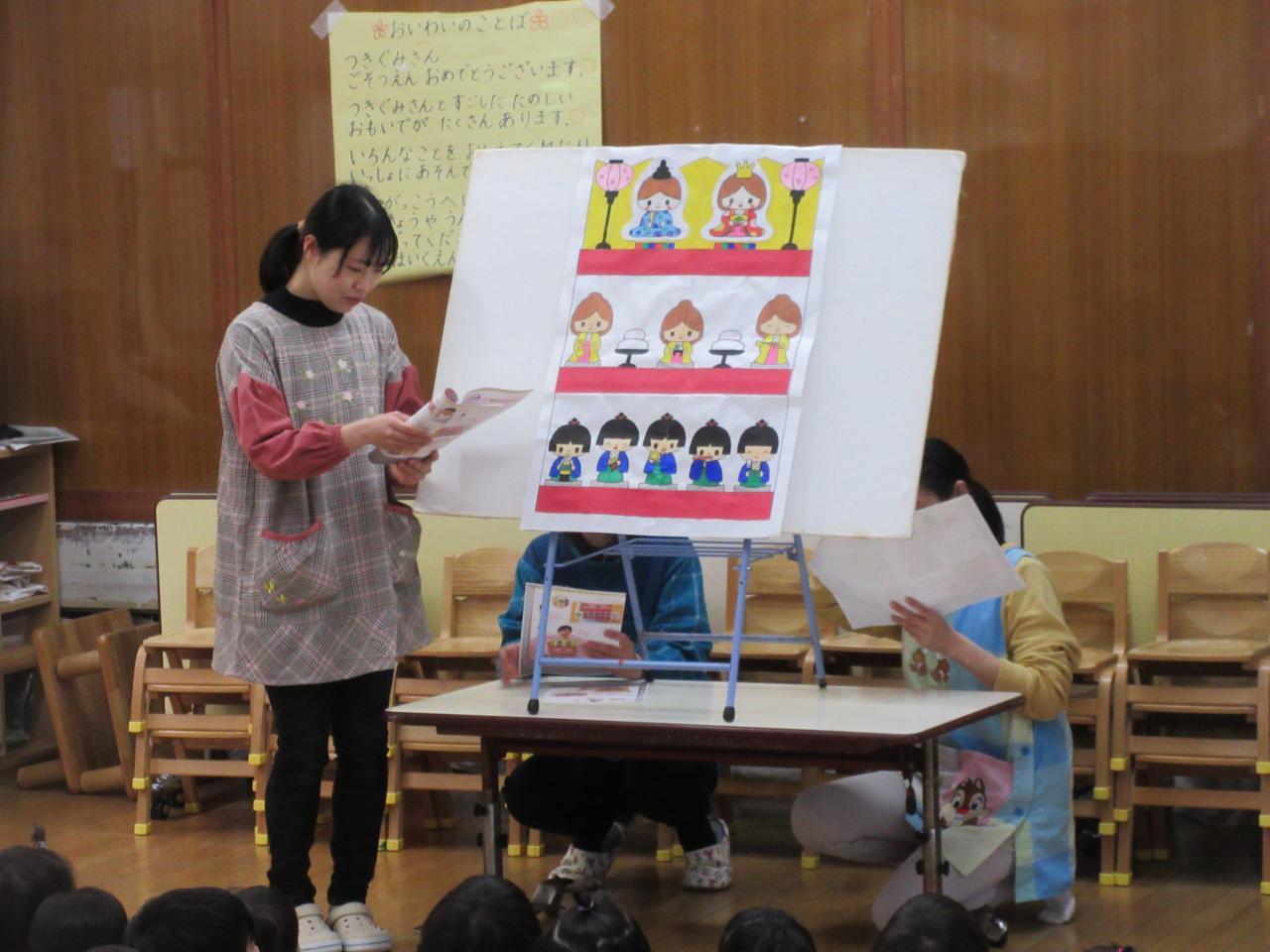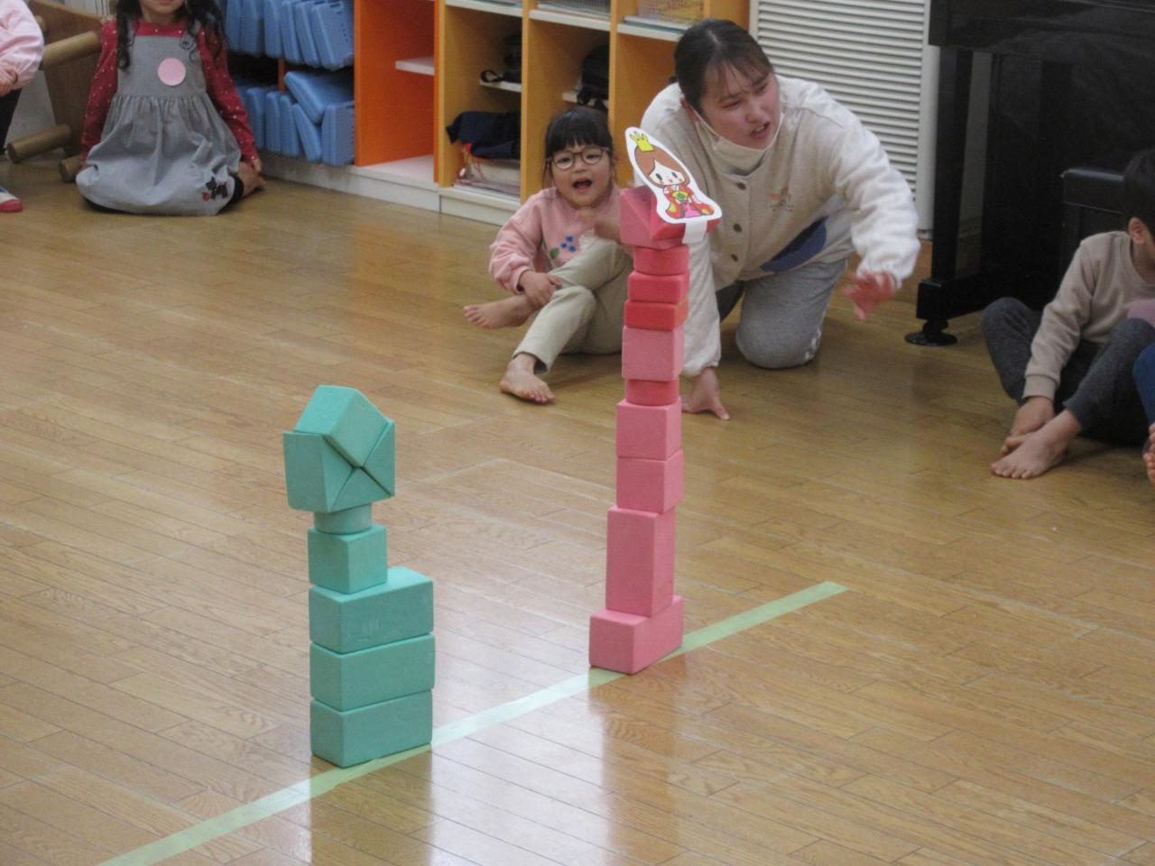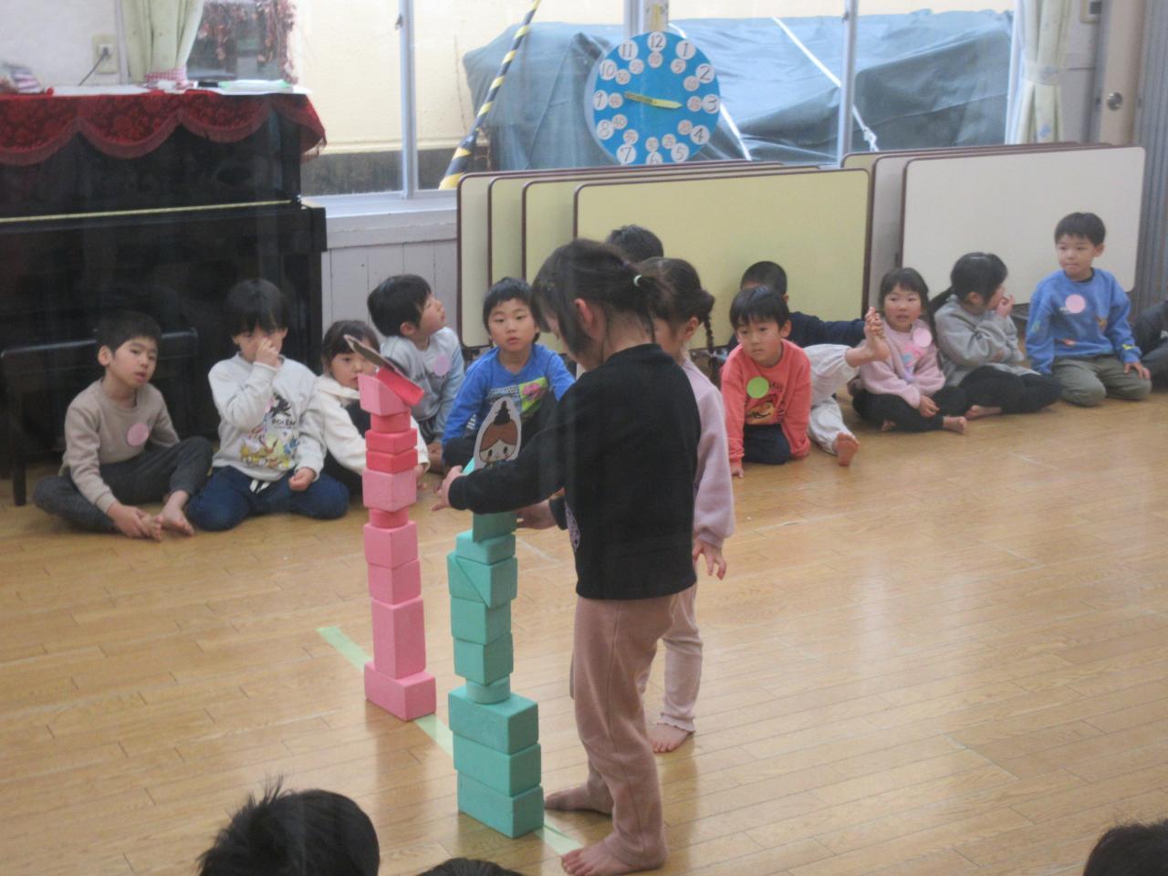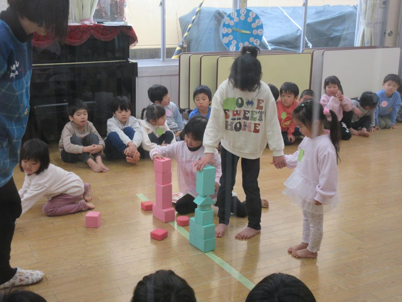 今日はひなまつり会がありました。「うれしいひなまつり」の歌をうたい、パネルシアター「わくわくひなまつりの準備」というお話を見ました。ゲームでは、しろぐみはソフト積み木を2色使い色別お片付けゲームをし、少し迷ったりしながらもしっかりと色を見て片付けていました。つぼみ、もも、ほし、つき組は2人組になり、ソフト積み木を積んでいく競争をしました。どの形の積み木を使い、どうやって積むかそれぞれ考えながら、時々積み木が崩れはらはらしながらも最後のおだいりさまとおひなさまの積み木を上に置けたときは嬉しそうにし、盛り上がりました。