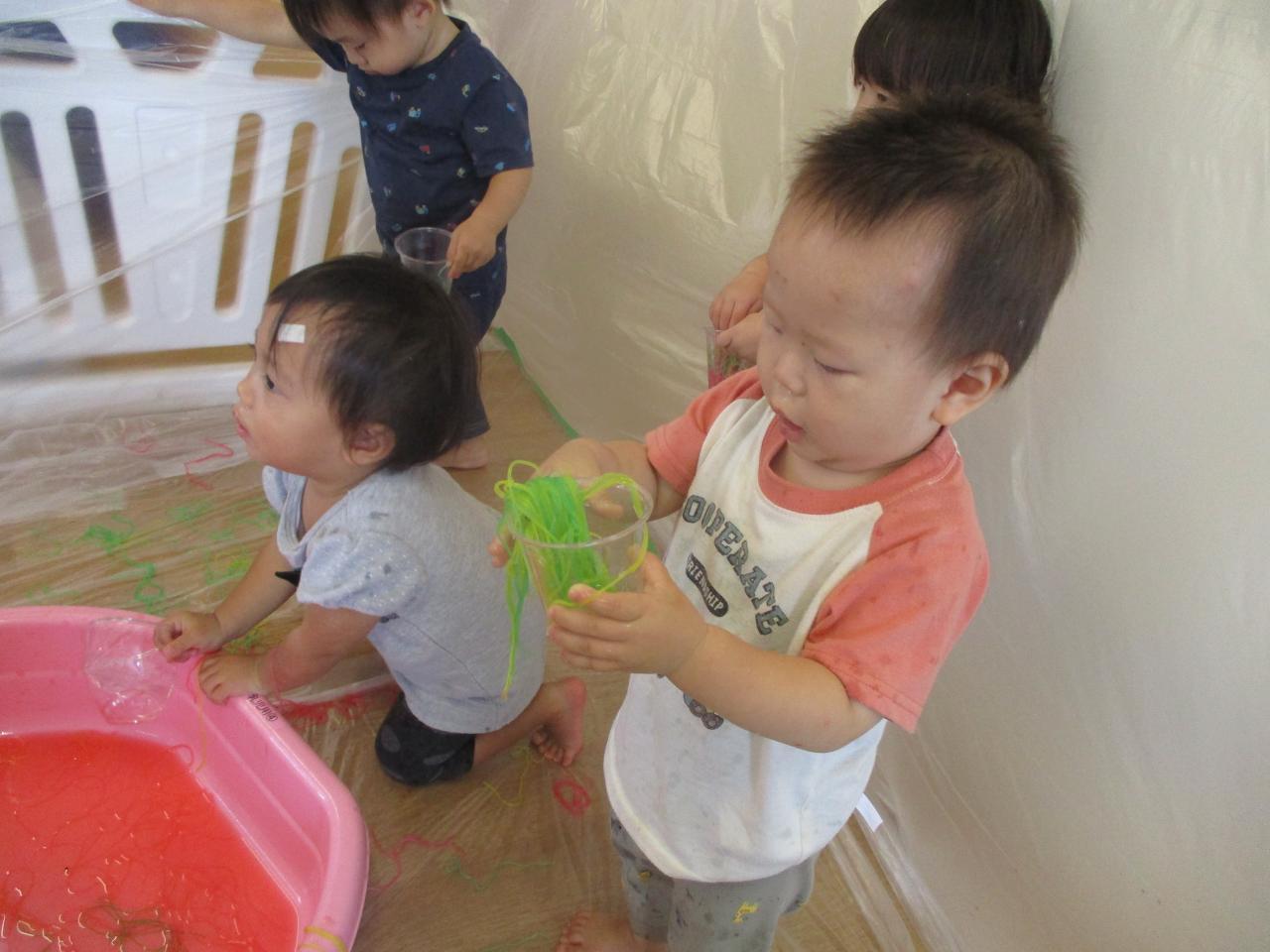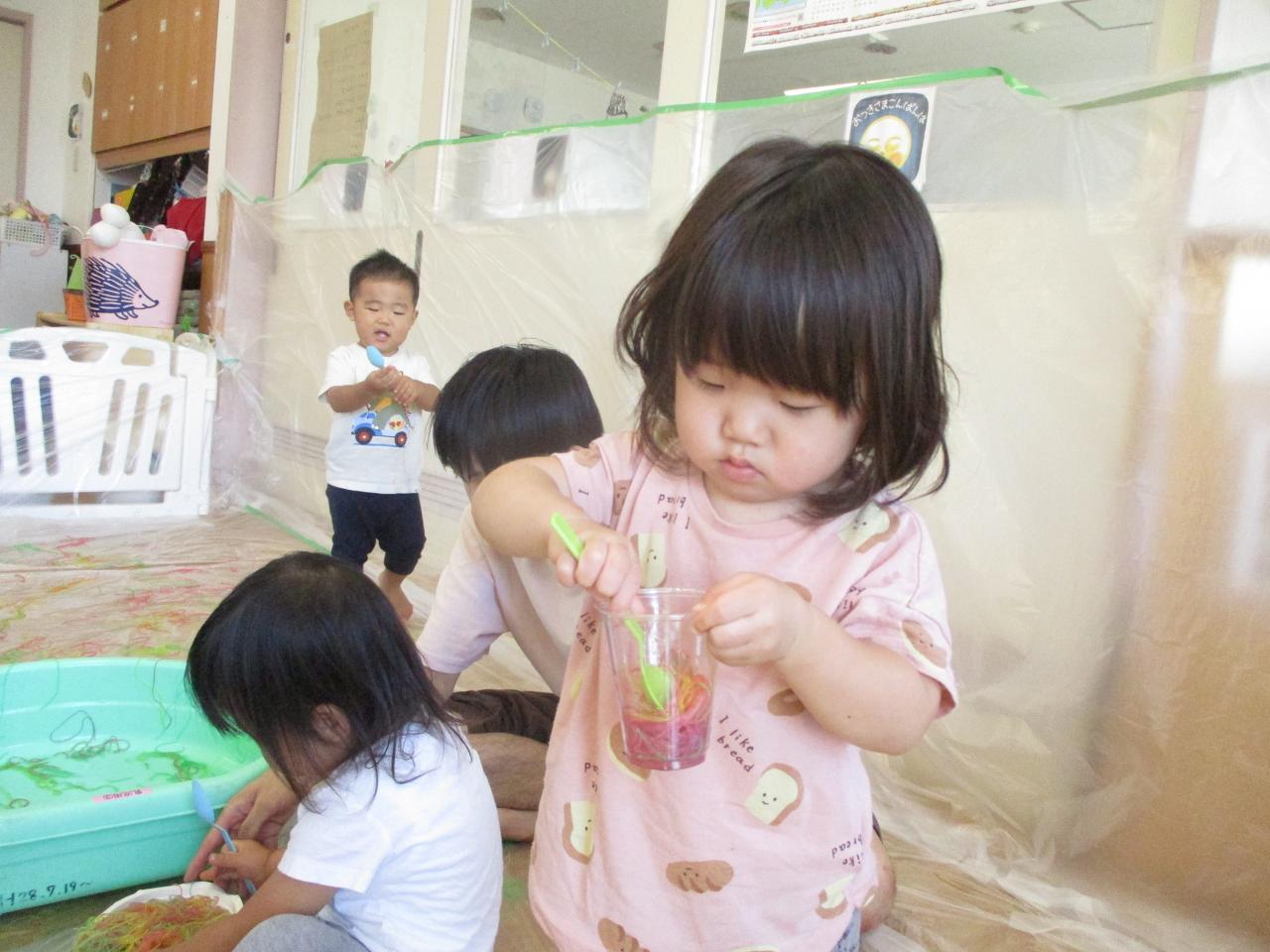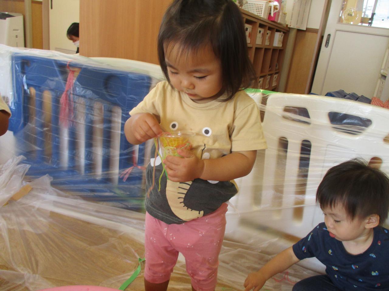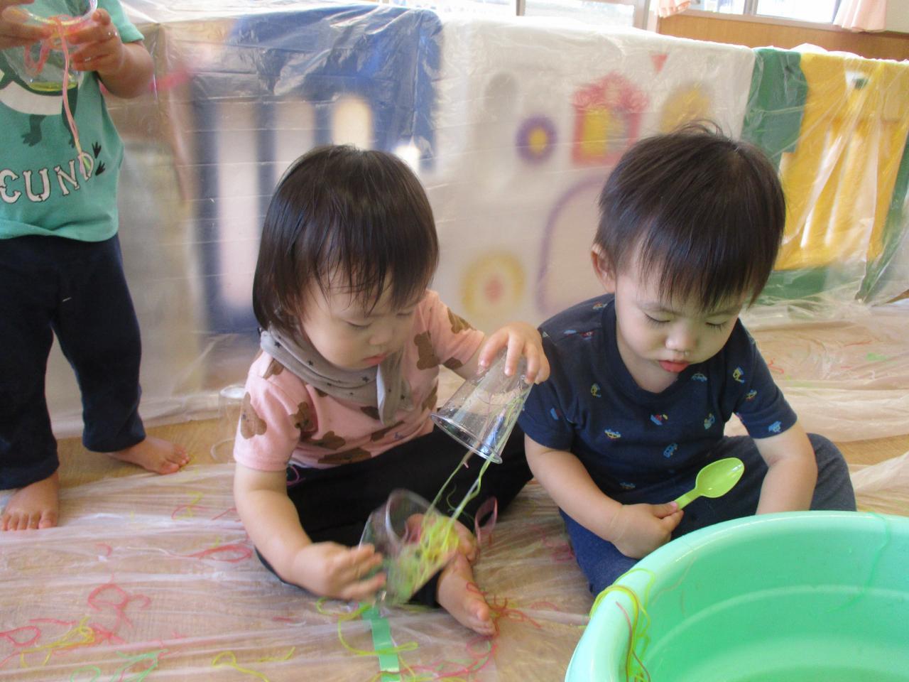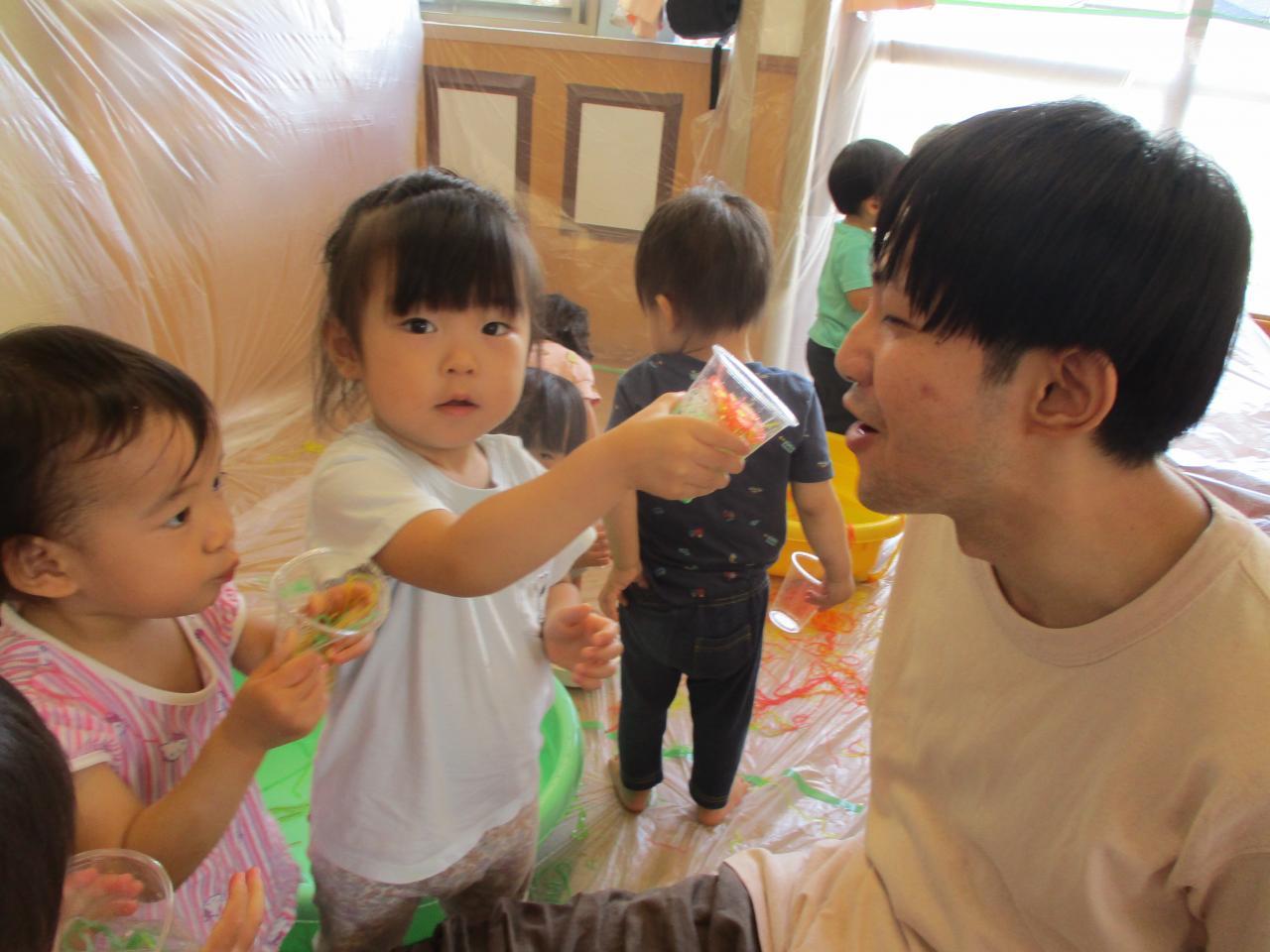 直接触れてたのしんだり、カップに入れてパフェのようにしてみたり、保育者にあーんとしてみたり、色の混ざる様子を観察していたりと子どもたちがそれぞれ自分の思うままに楽しむ姿がありました!