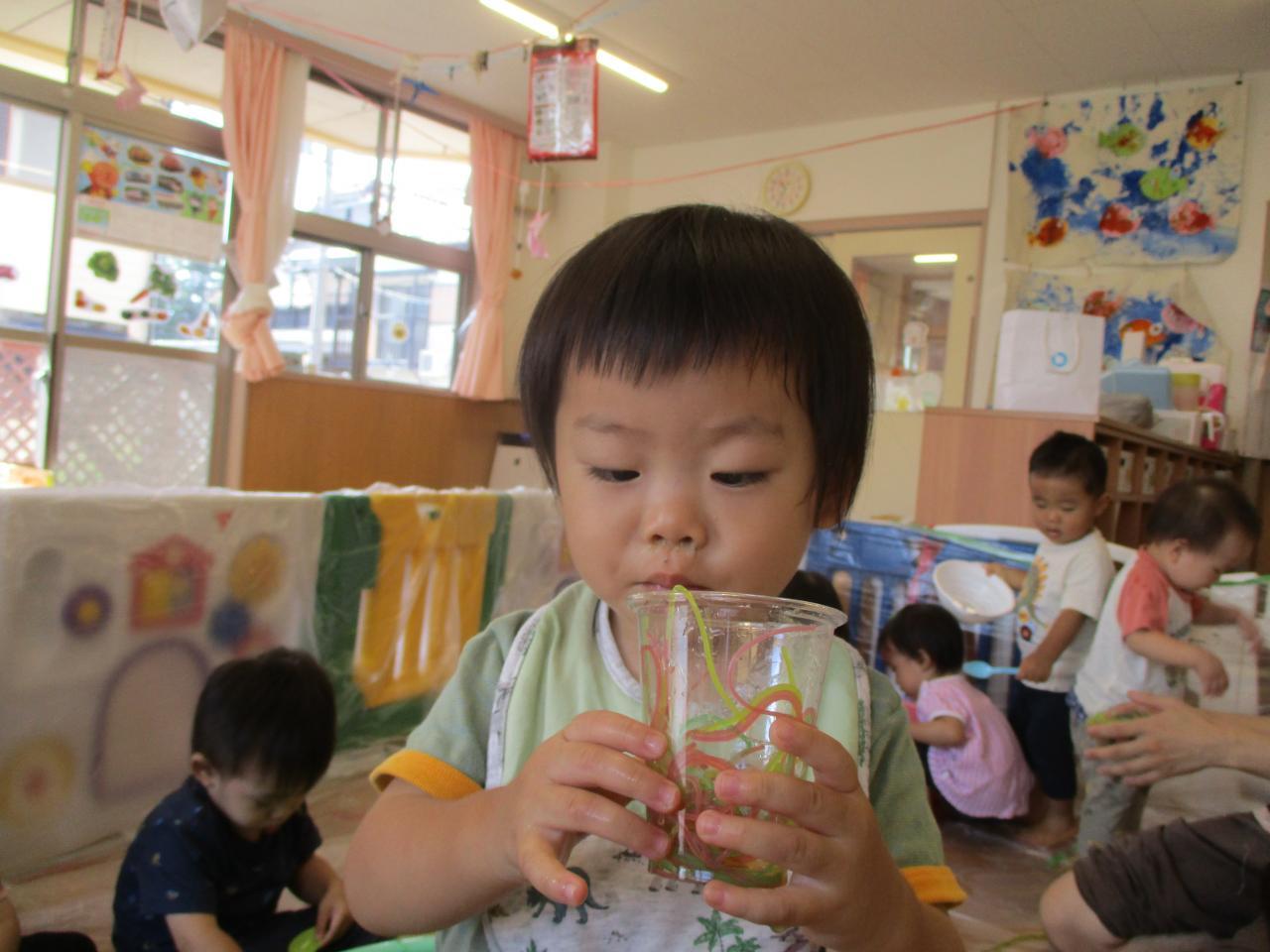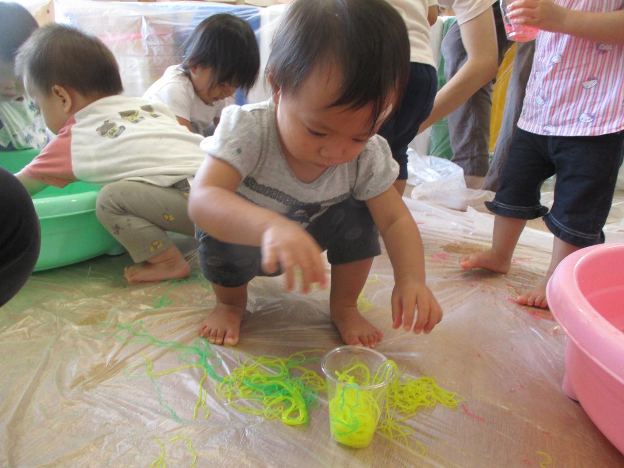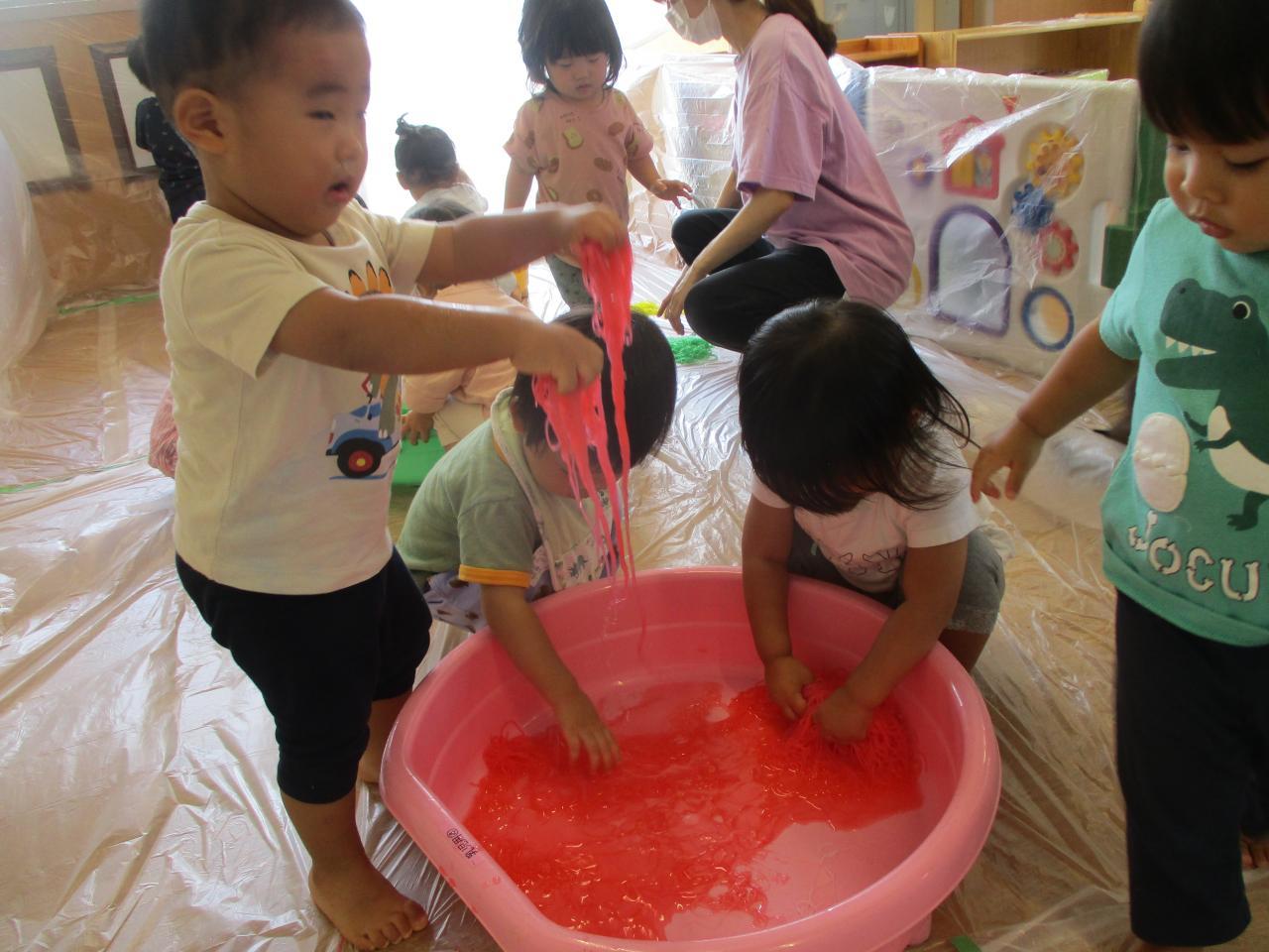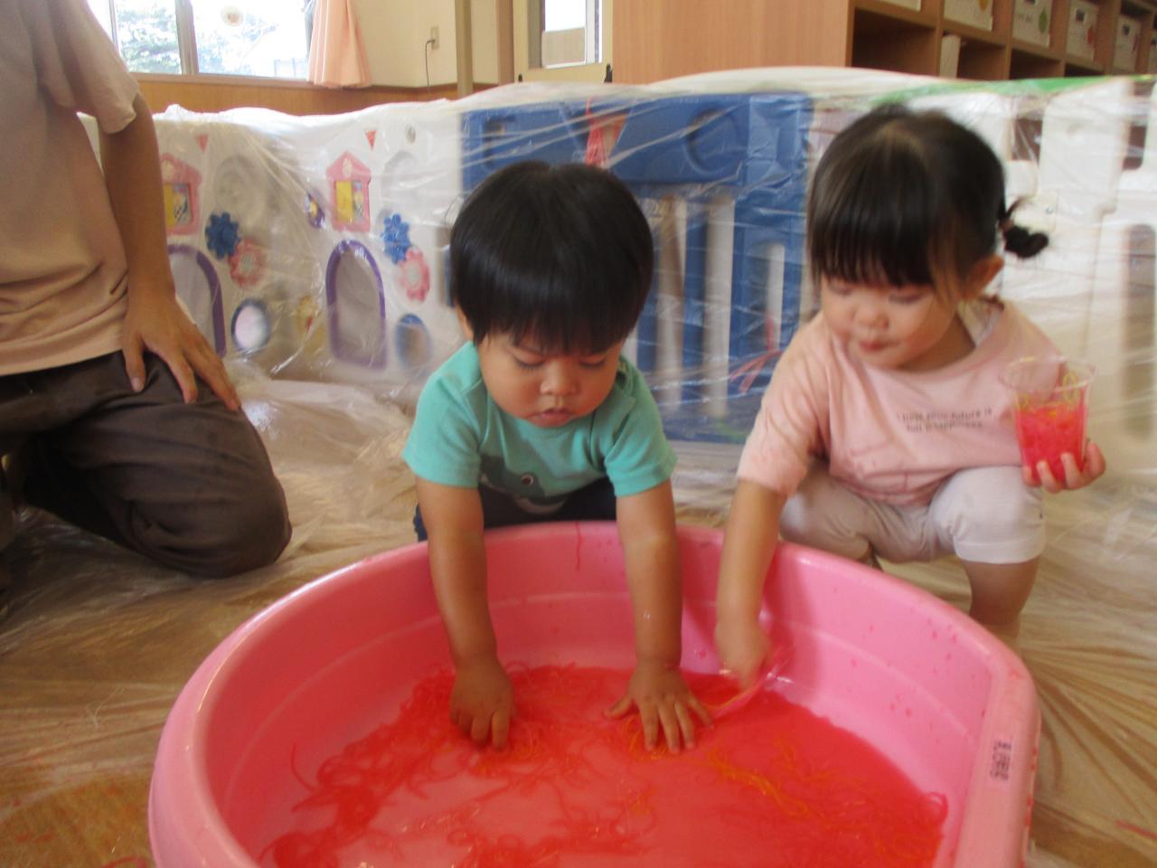 直接触れてたのしんだり、カップに入れてパフェのようにしてみたり、保育者にあーんとしてみたり、色の混ざる様子を観察していたりと子どもたちがそれぞれ自分の思うままに楽しむ姿がありました!
